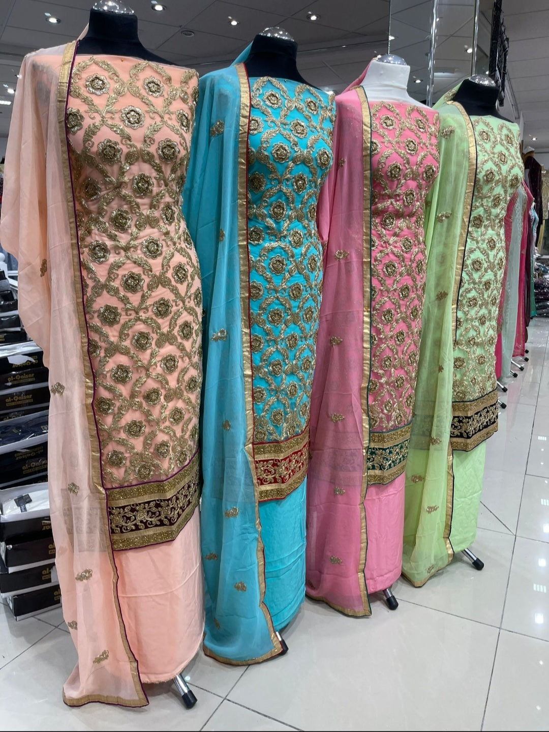 Fancy embellished net with thread embroidery beads and diamontes, embroidery detail to border and dupatta. Available in four lovely colours