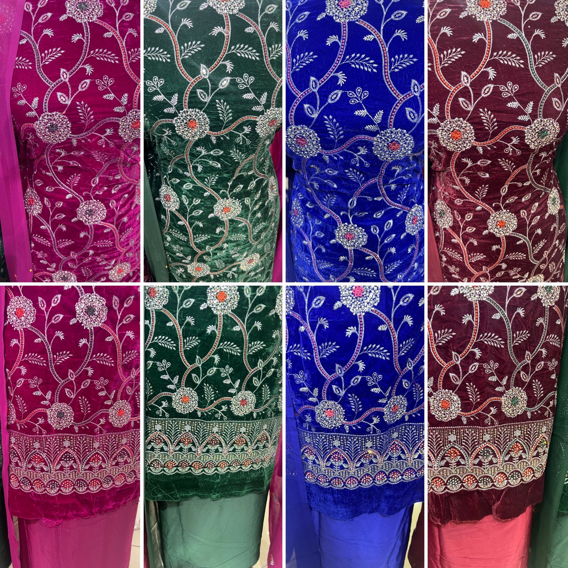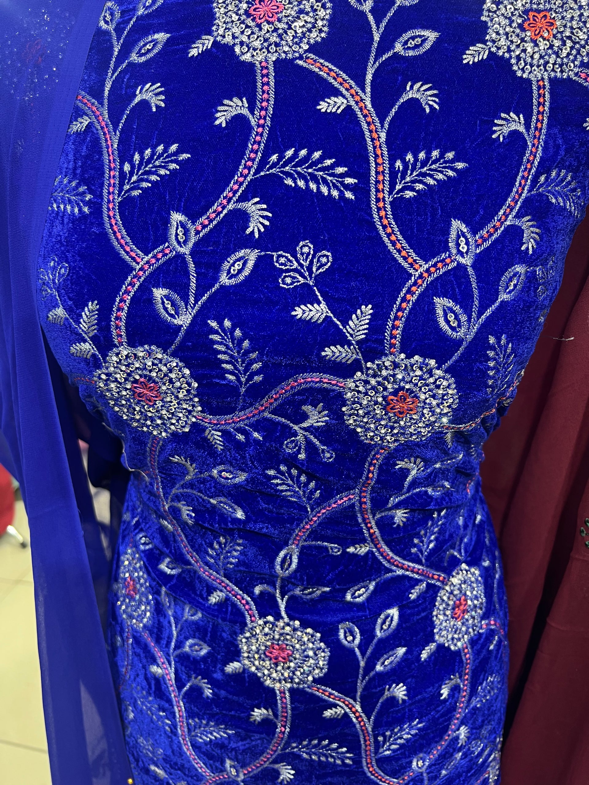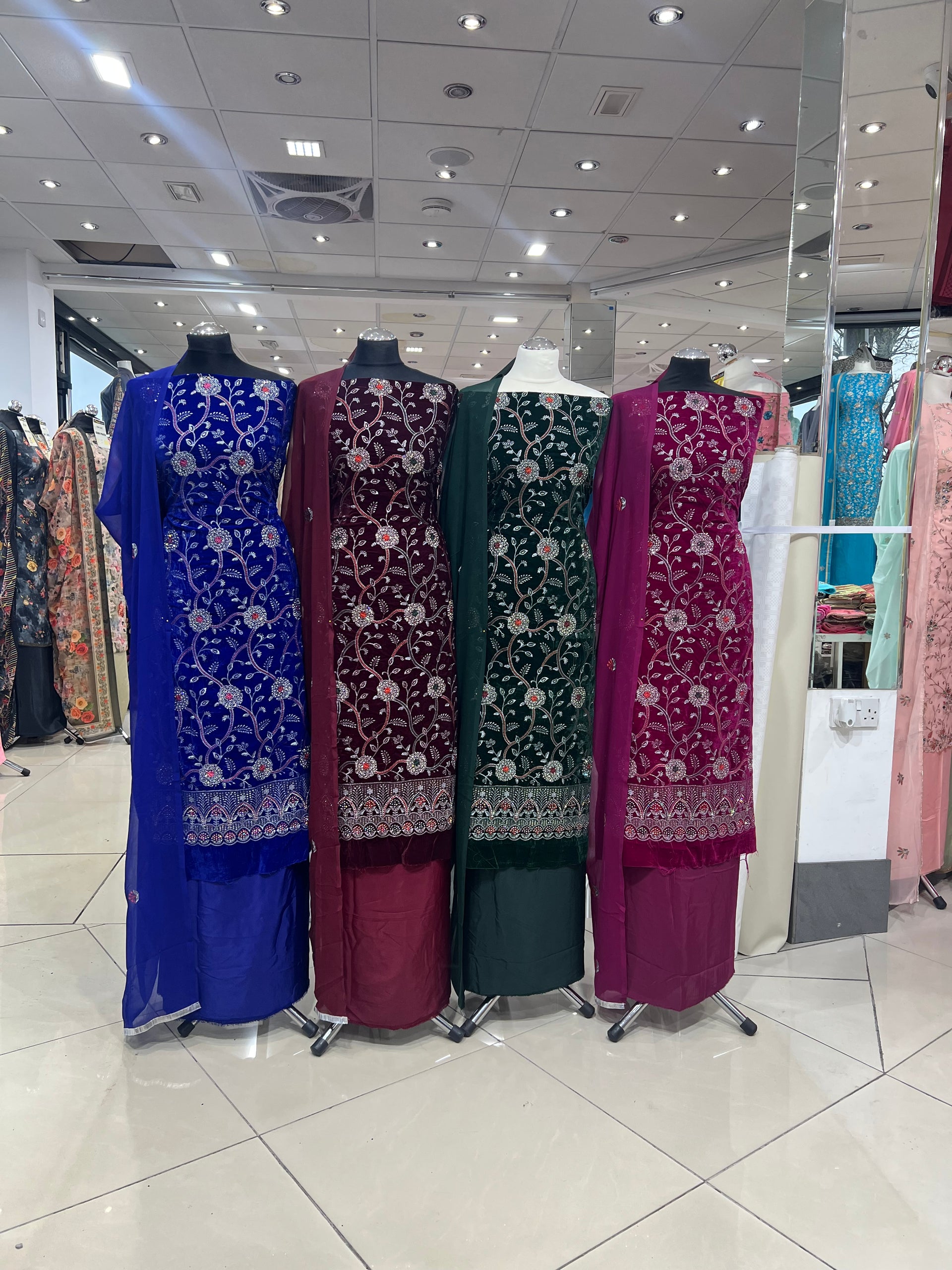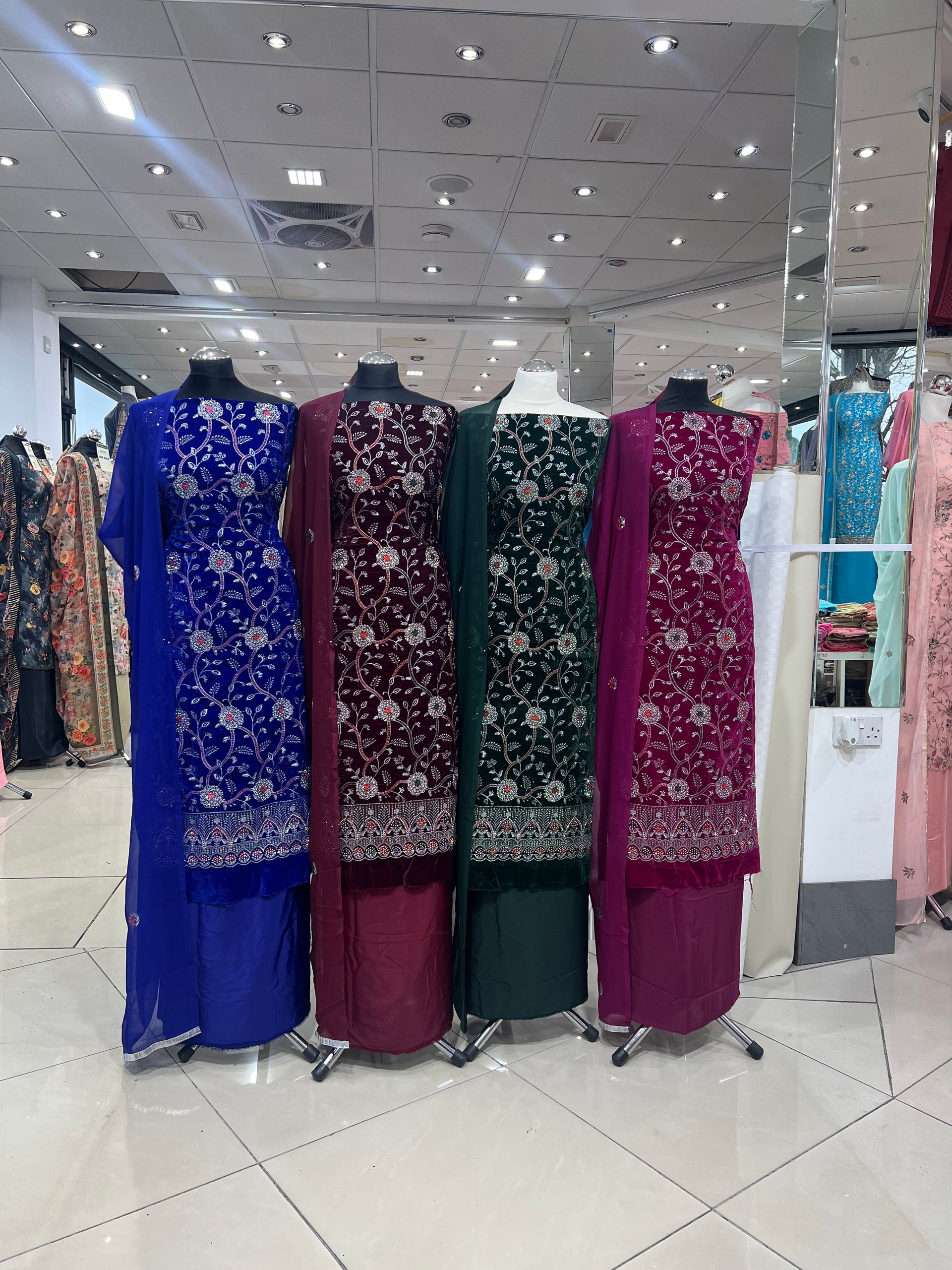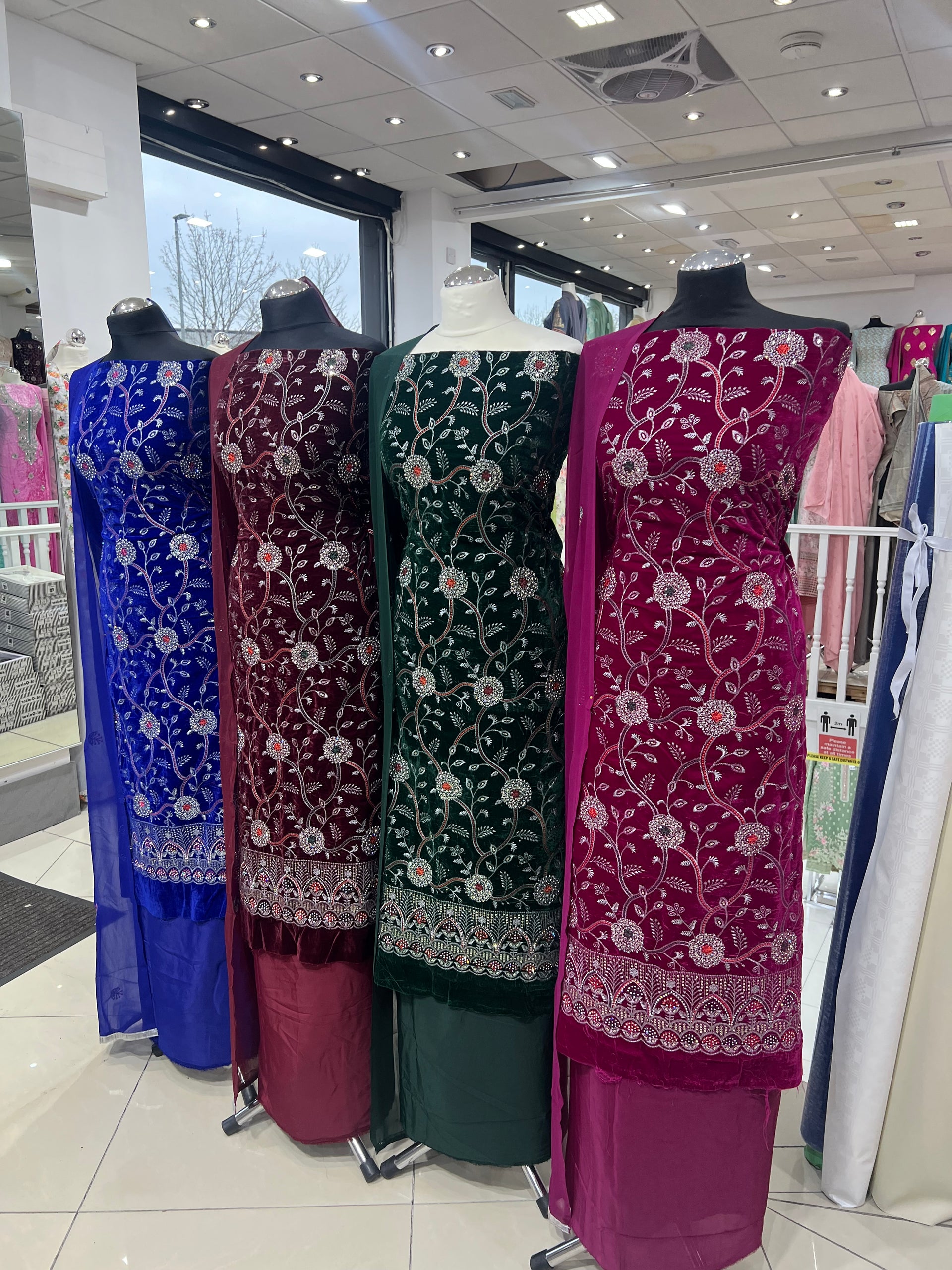 Discover elegance with our exquisite collection of suits, beautifully displayed in our store. Crafted from luxurious micro velvet, each piece features intricate thread embroidery and stunning diamontes that add a touch of glamour. Perfect for special occasions, these suits not only enhance your silhouette but also ensure you stand out with their unique design and superior quality. Elevate your wardrobe with these timeless pieces that blend sophistication and style effortlessly.
