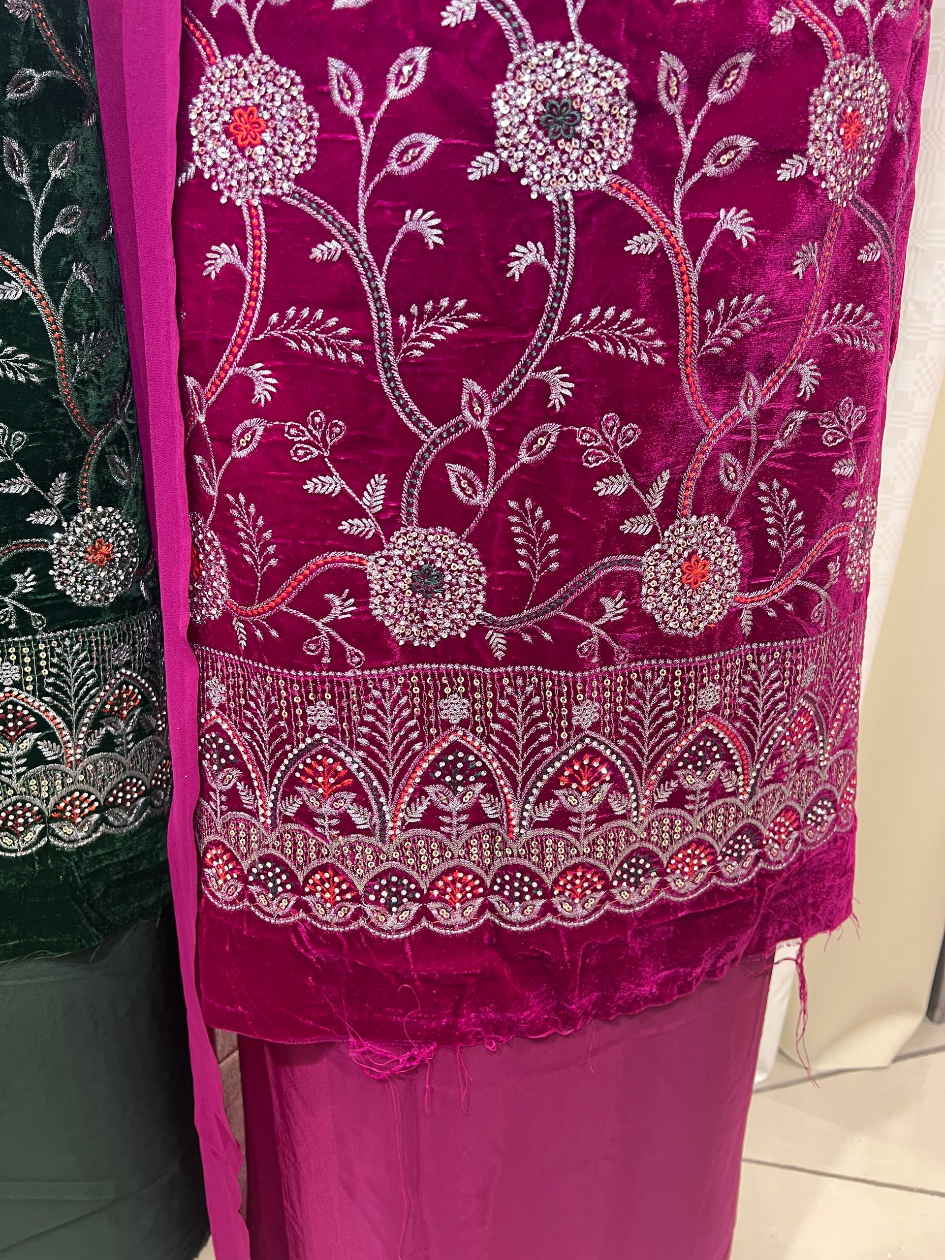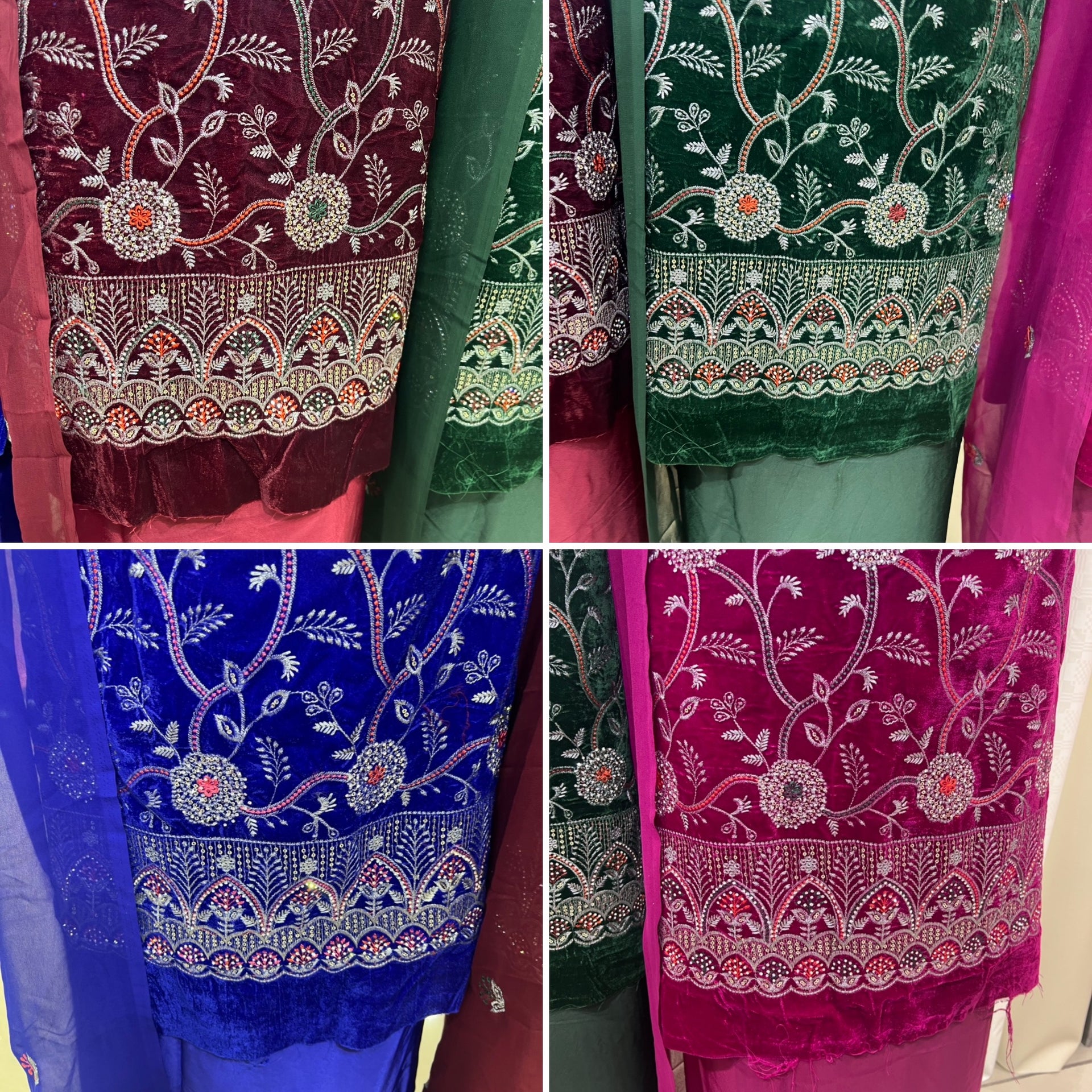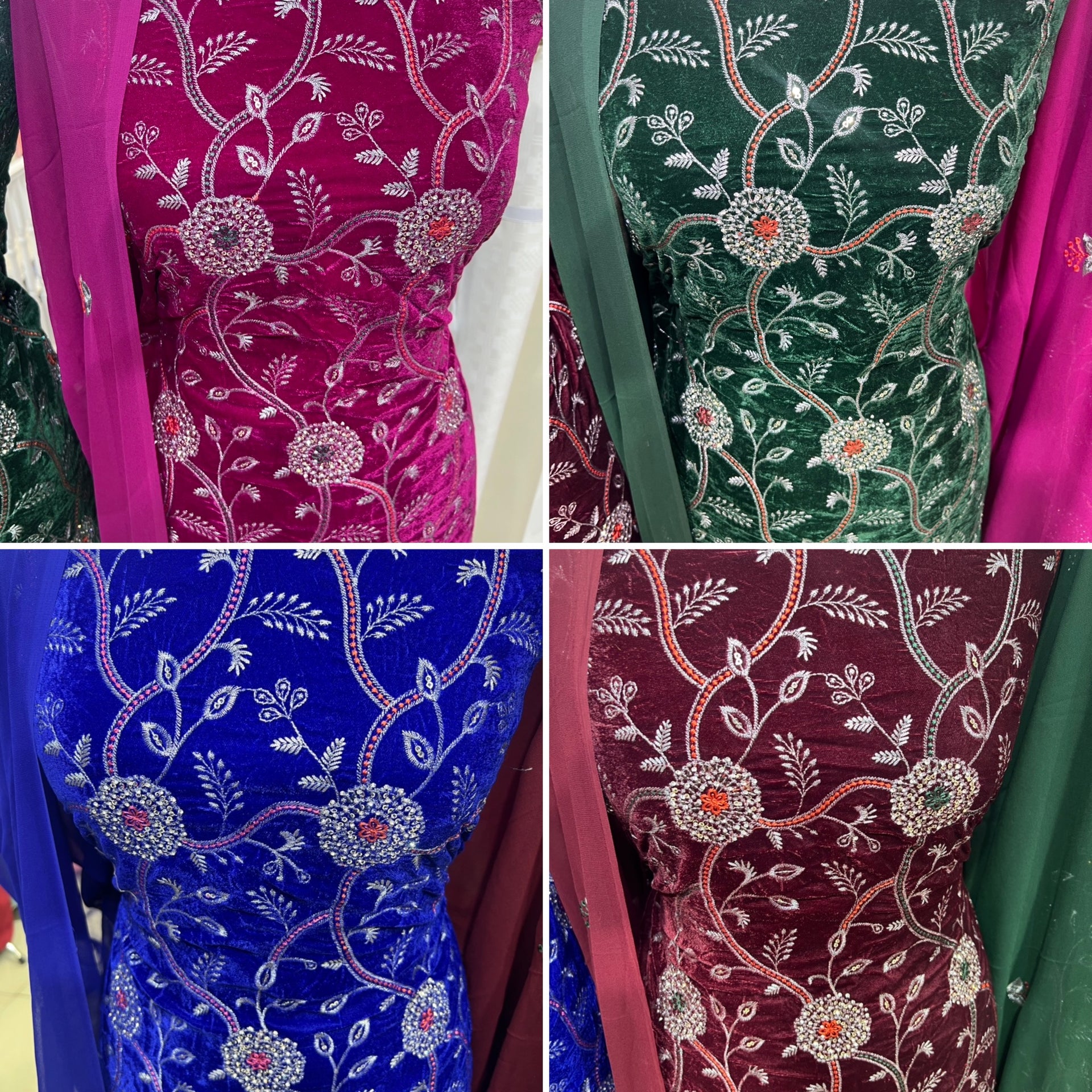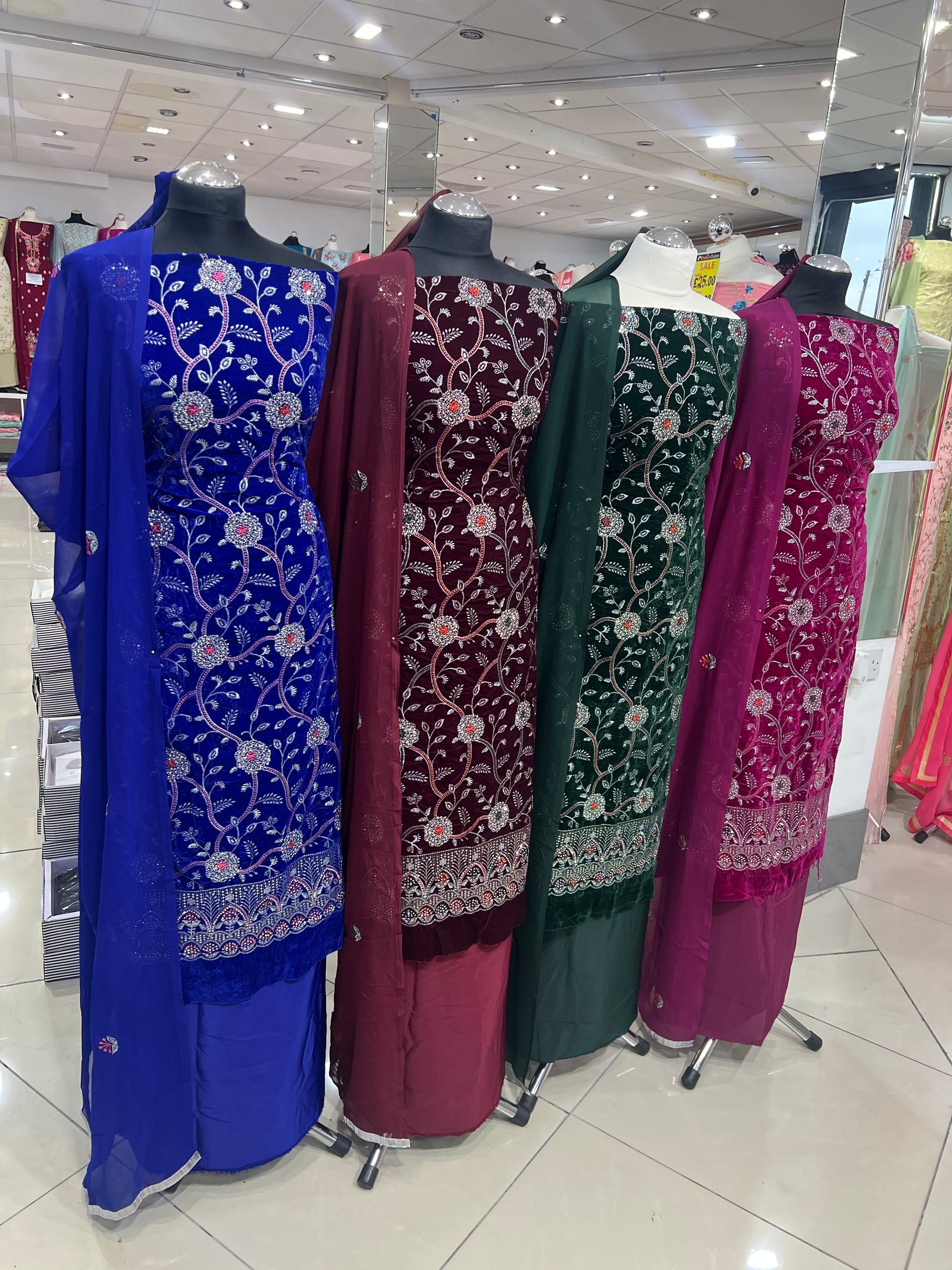Discover elegance with our exquisite collection of suits, beautifully displayed in our store. Crafted from luxurious micro velvet, each piece features intricate thread embroidery and stunning diamontes that add a touch of glamour. Perfect for special occasions, these suits not only enhance your silhouette but also ensure you stand out with their unique design and superior quality. Elevate your wardrobe with these timeless pieces that blend sophistication and style effortlessly.