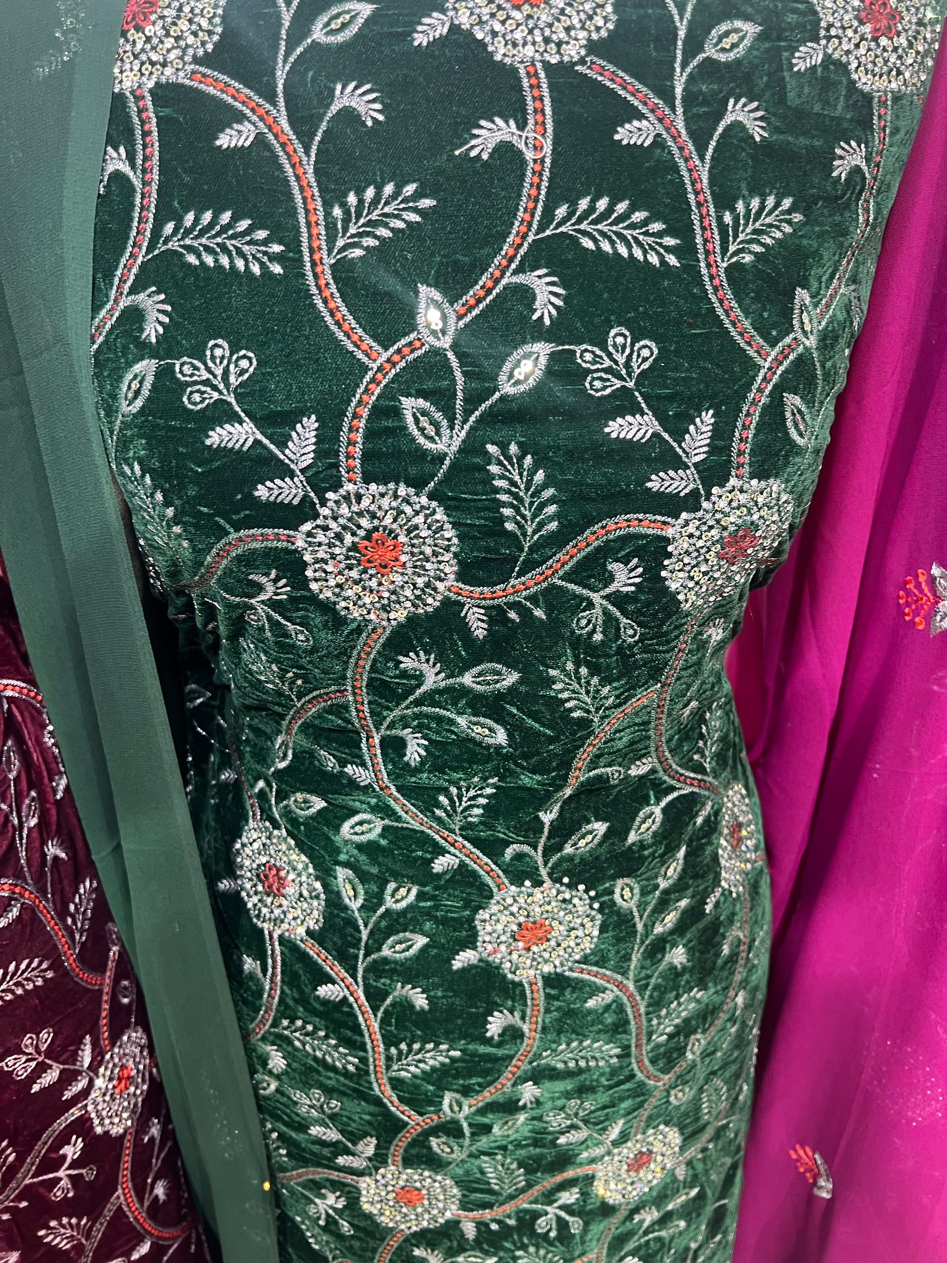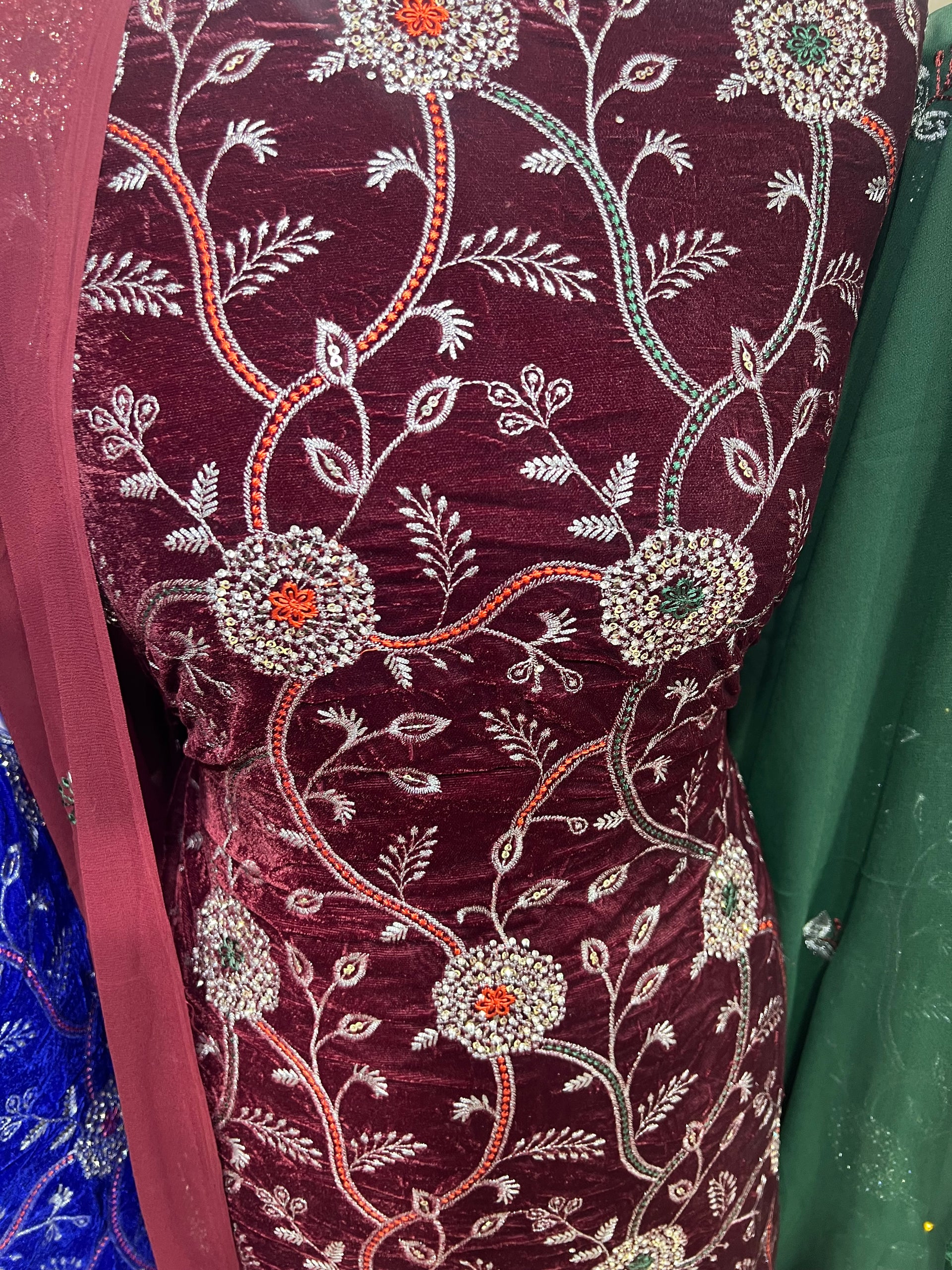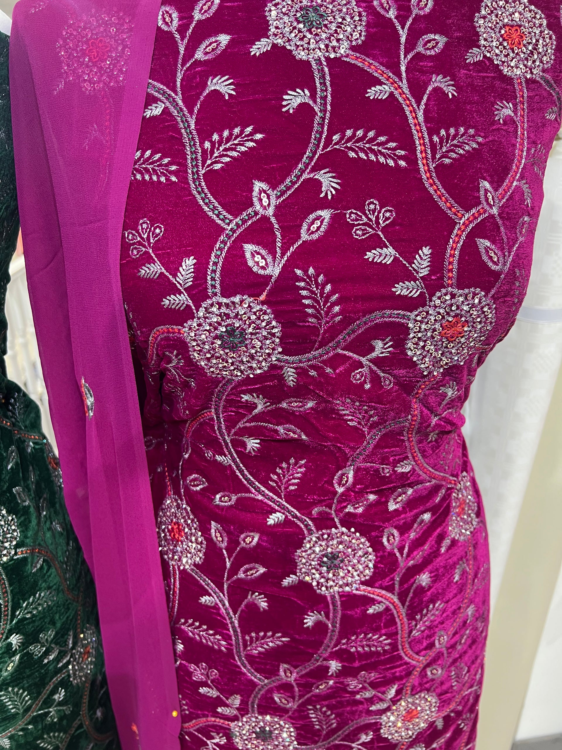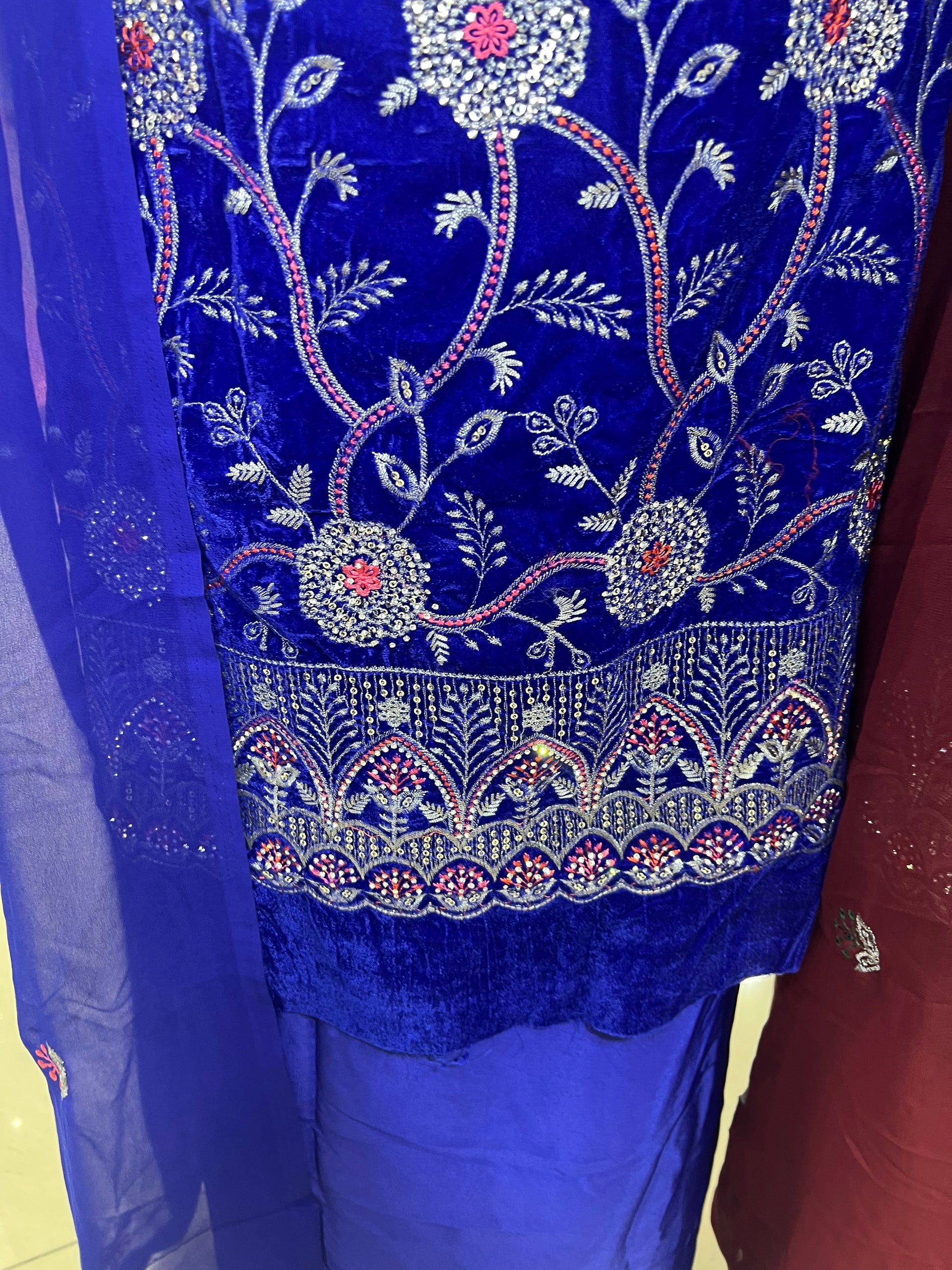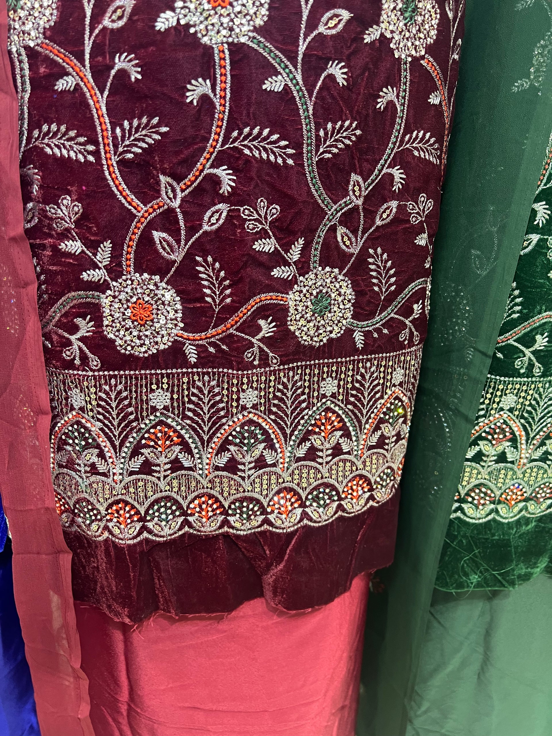 Discover elegance with our exquisite collection of suits, beautifully displayed in our store. Crafted from luxurious micro velvet, each piece features intricate thread embroidery and stunning diamontes that add a touch of glamour. Perfect for special occasions, these suits not only enhance your silhouette but also ensure you stand out with their unique design and superior quality. Elevate your wardrobe with these timeless pieces that blend sophistication and style effortlessly.
