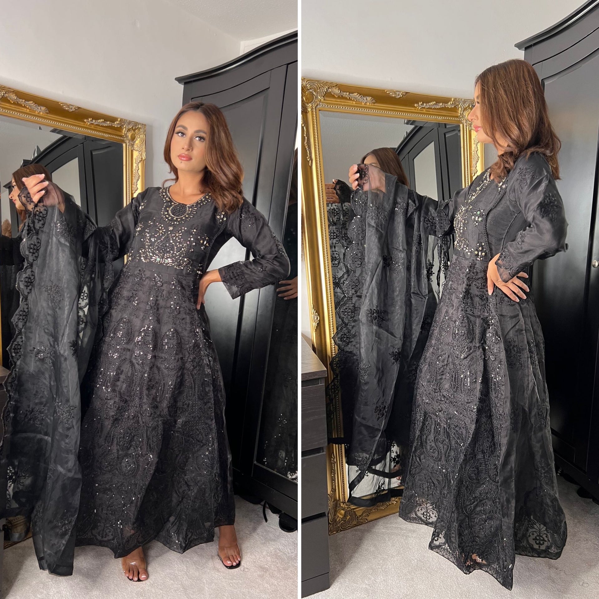 Ready to wear, long organza maxi dress intricately embroidered, embellished with sequins, beads and diamontes. Organza dupatta with embroidered scalloped edges. Available in small to large.