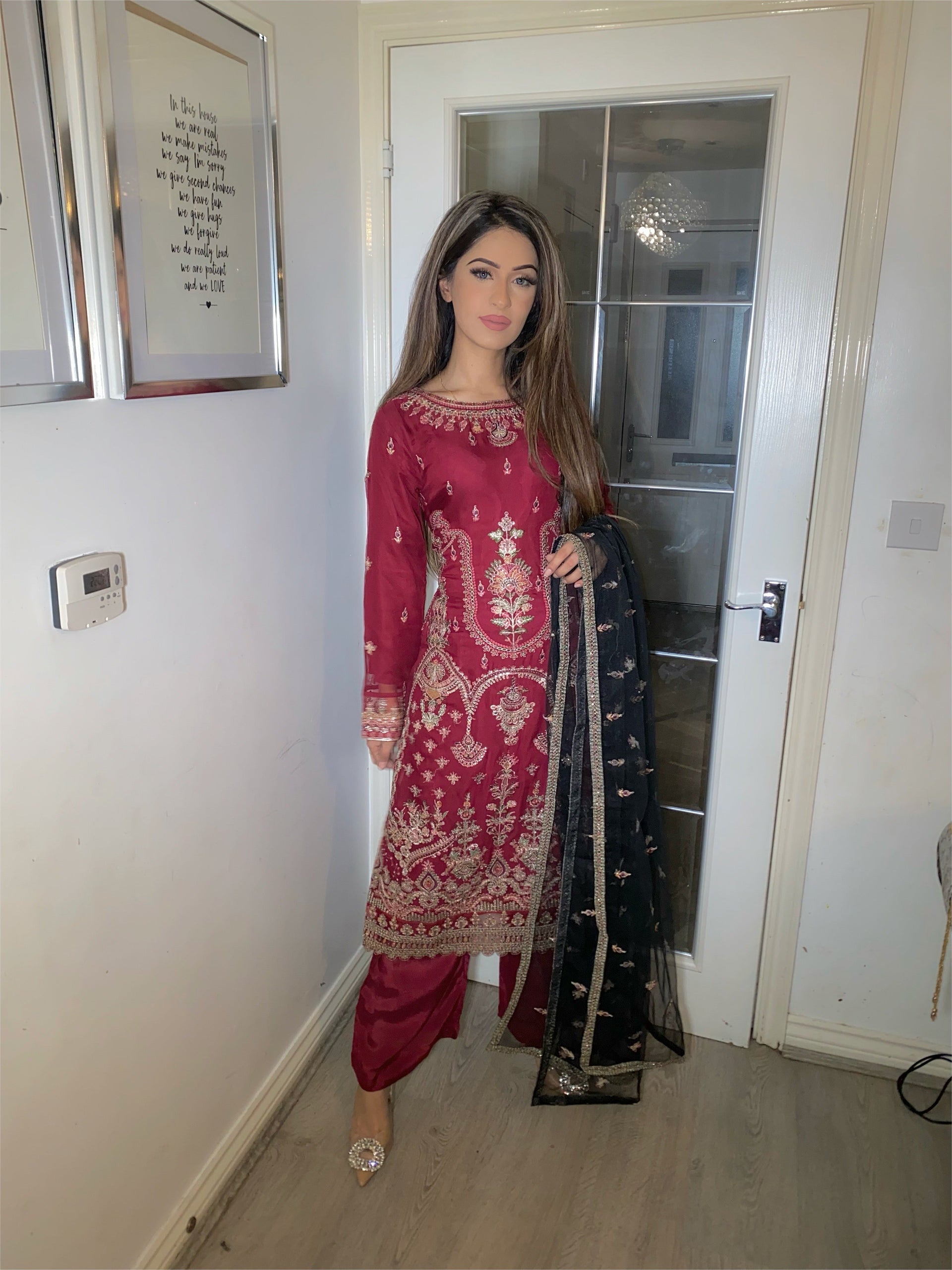 Ready to wear, chiffon party suits inspired by Baroque. Intricately embroidered with sequin and bead embellishments, comes with embroidered chiffon dupatta.