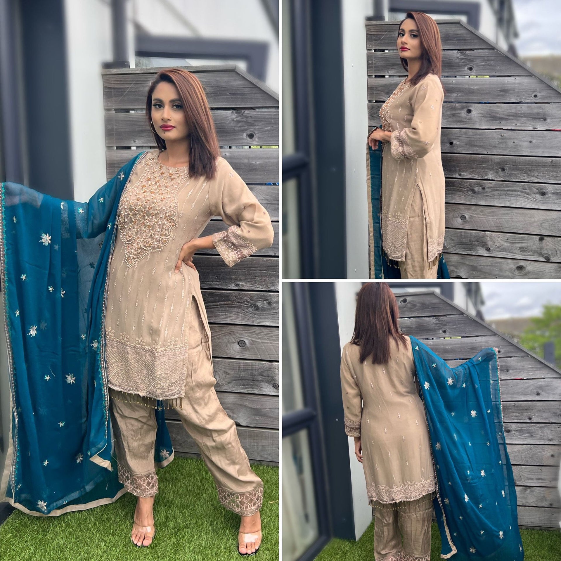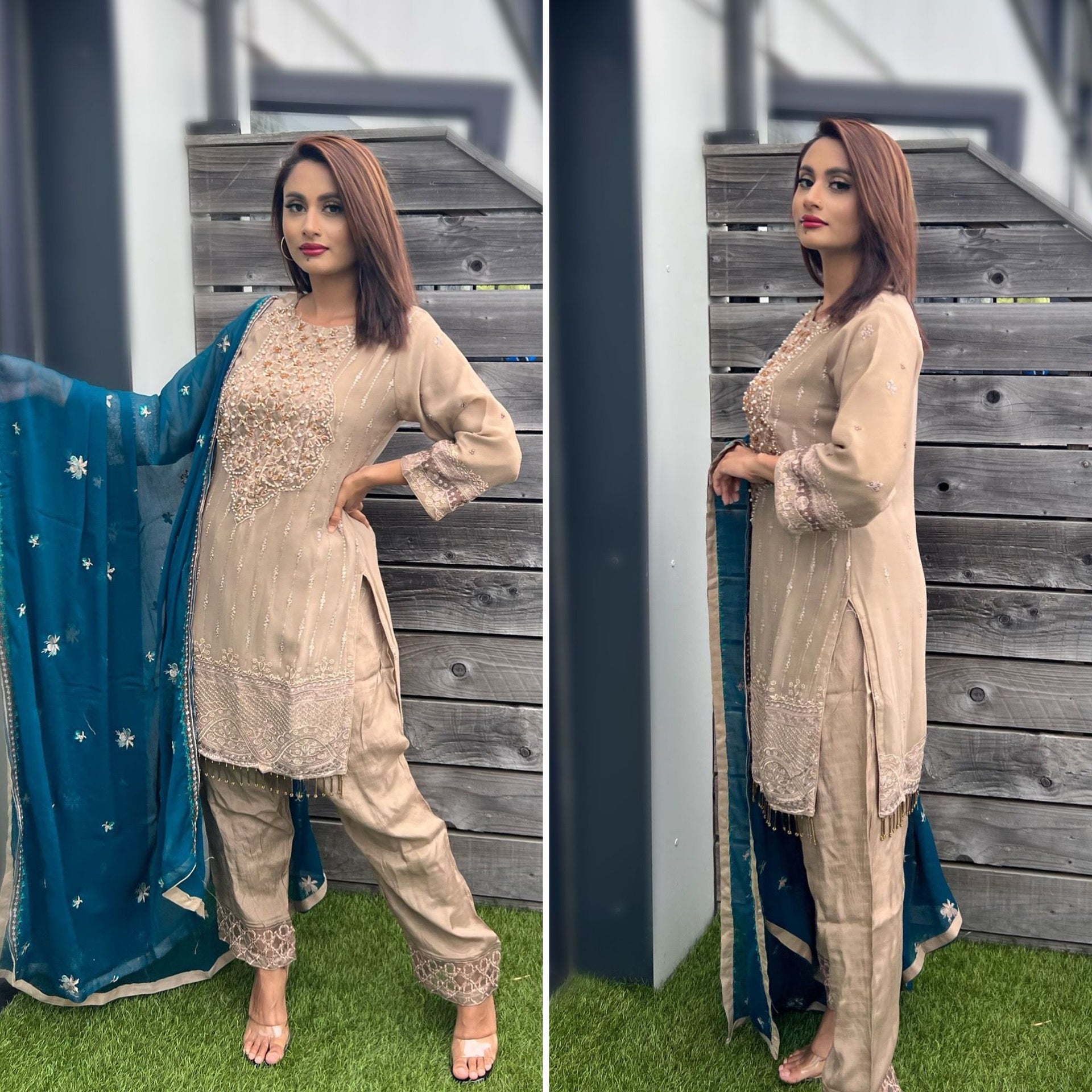 Ready to wear, pure chiffon fabric with intricate thread embroidery and bead/pearl embellishments, contrasting chiffon dupatta and embroidered raw silk bottoms. Available in small to xl.