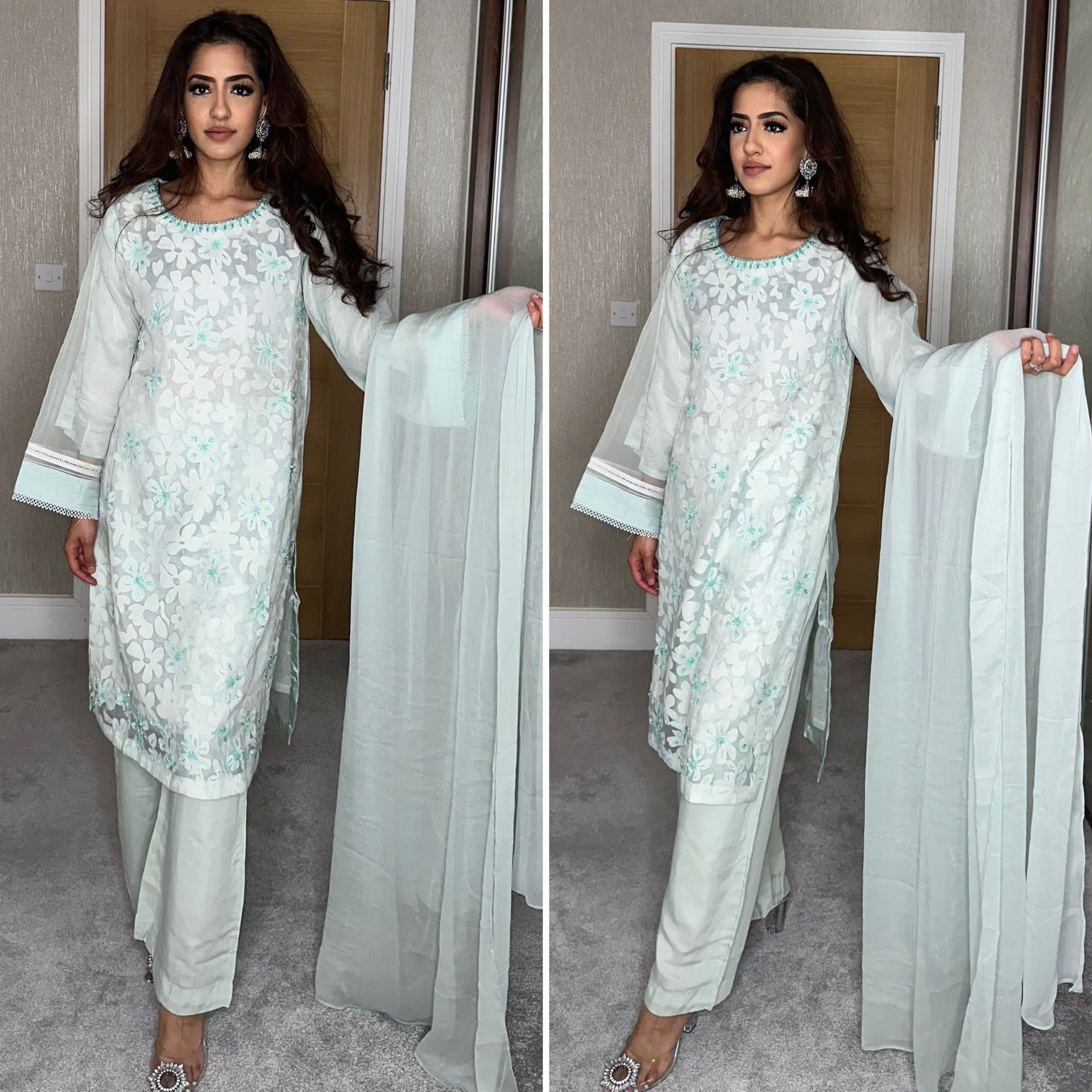 Ready to wear, Floral Palchi / Barosha material with digital print and embroidery embellishments. Available in sizes small to xxl. The perfect addition to your wardrobe.