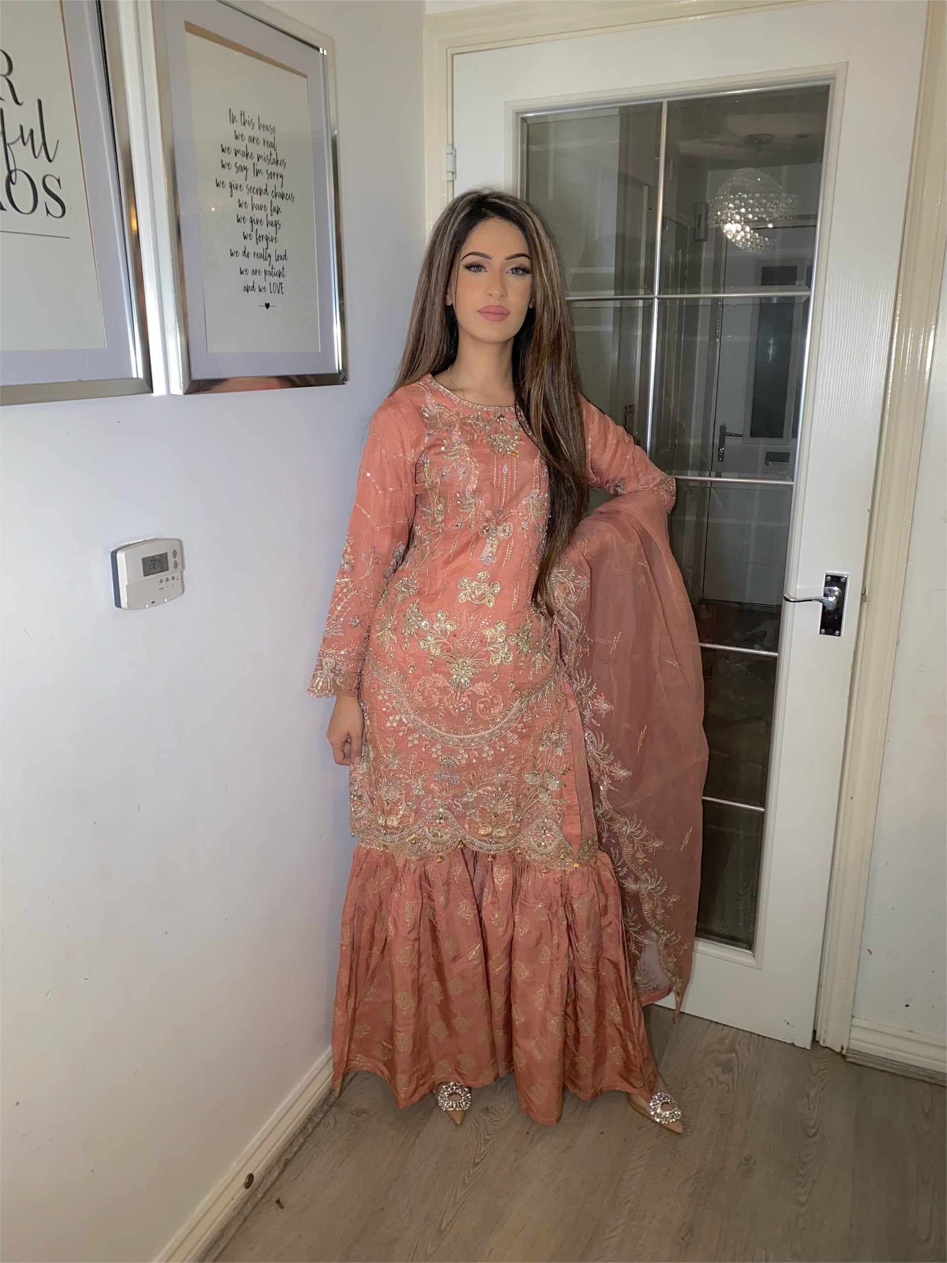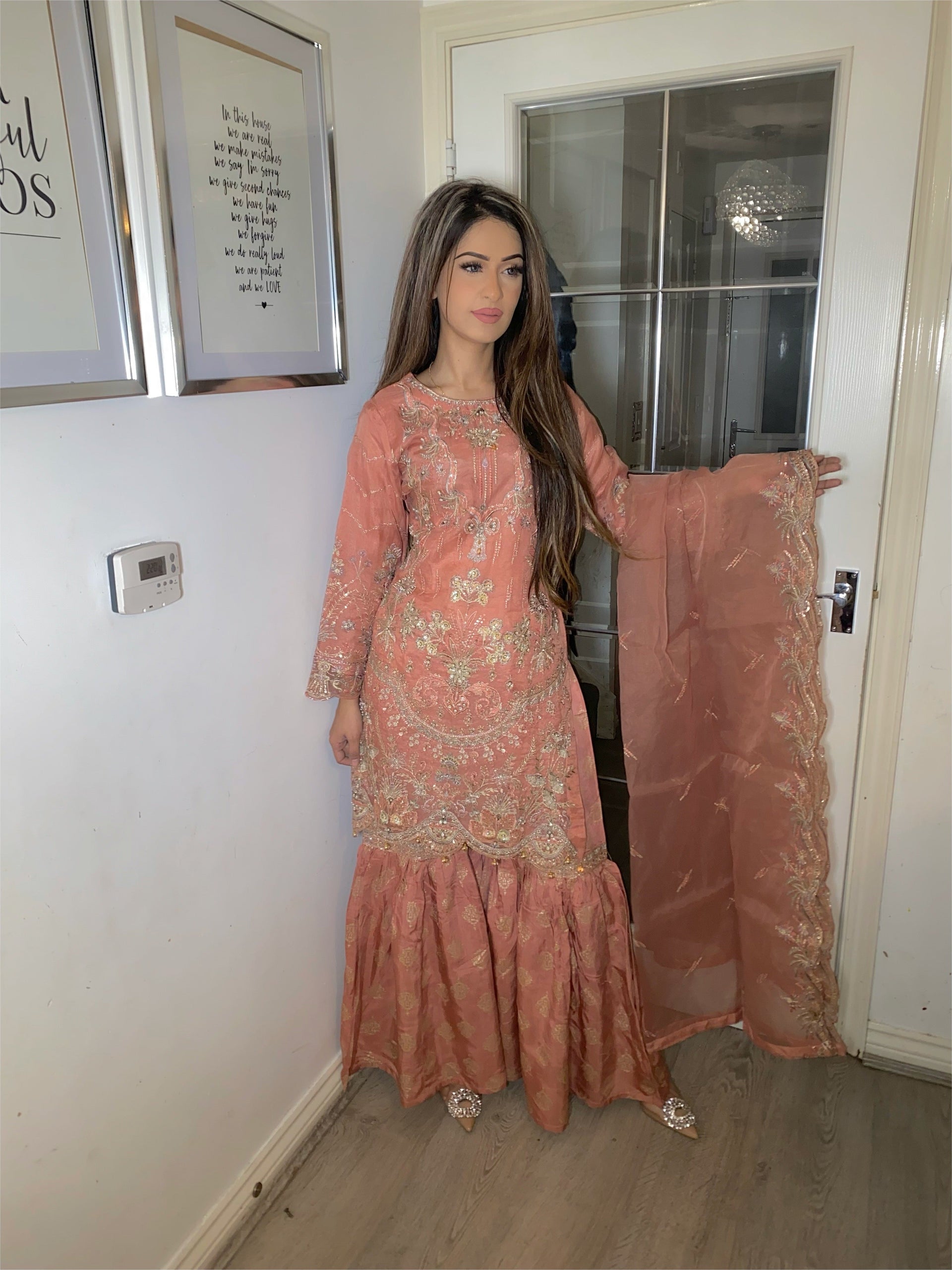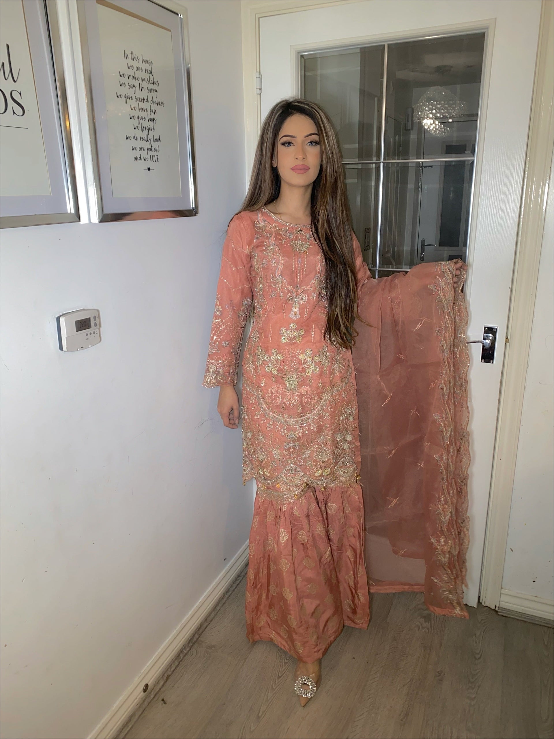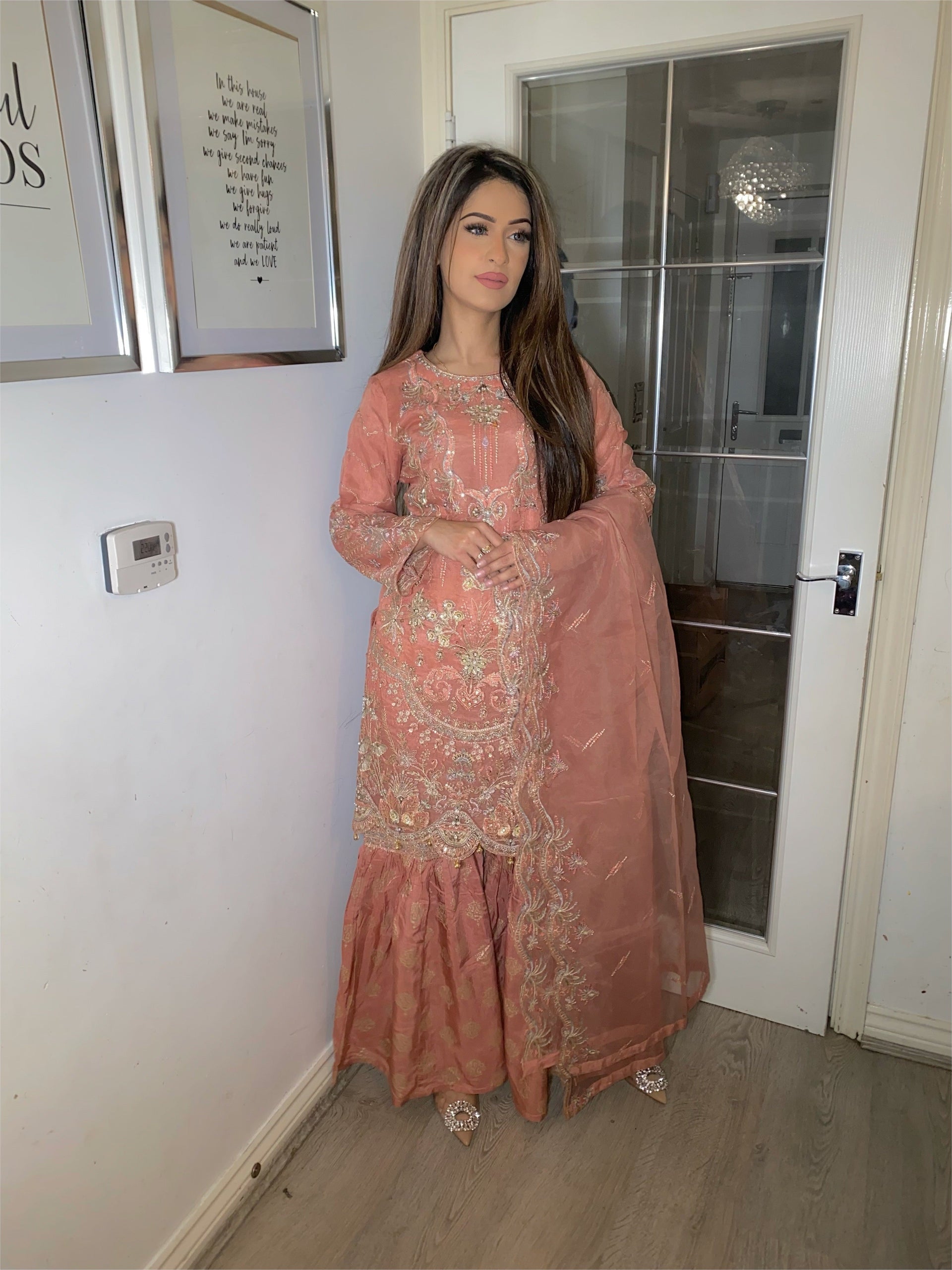 Ready to wear collection, organza fabric with detailed sequin embroidery and embellishments, range of styles from straight pants to sharara bottoms, embroidered detail on dupatta and trousers. Ideal occasion wear.