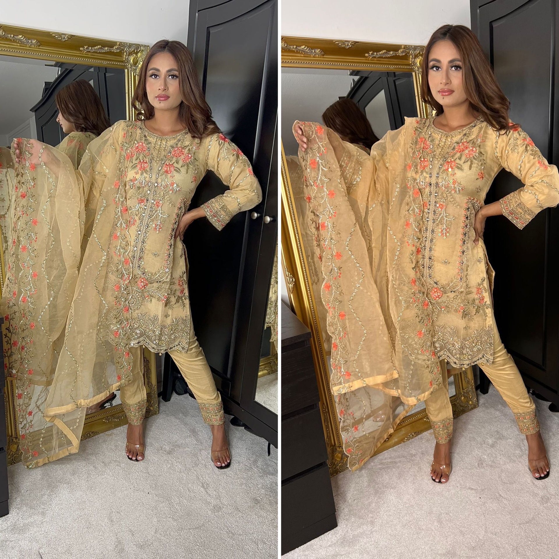 Ready to wear, straight kameez and trouser suit. Organza fabric with detailed thread embroidery, mirror embellishments and hand embroidery work. Scalloped border with tassels, embroidered patch on trouser, comes with embroidered organza dupatta. Available in sizes small to xl.
