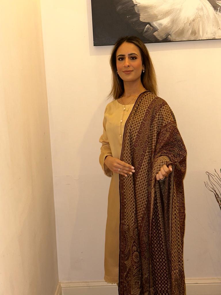 Ready to wear, quality Marina with print and thread embroidery, pearl and button embellishments, comes with Pashima shawl.