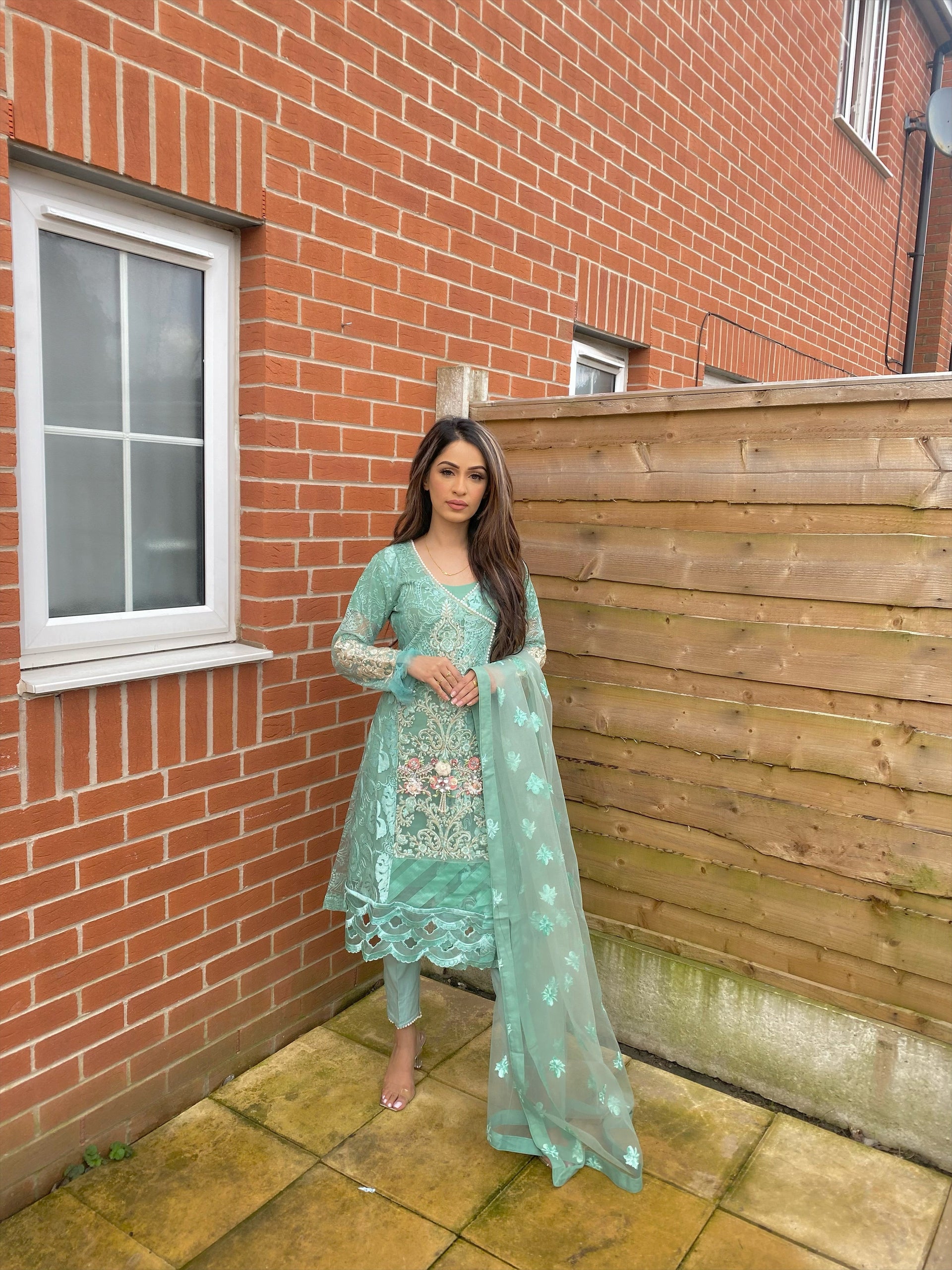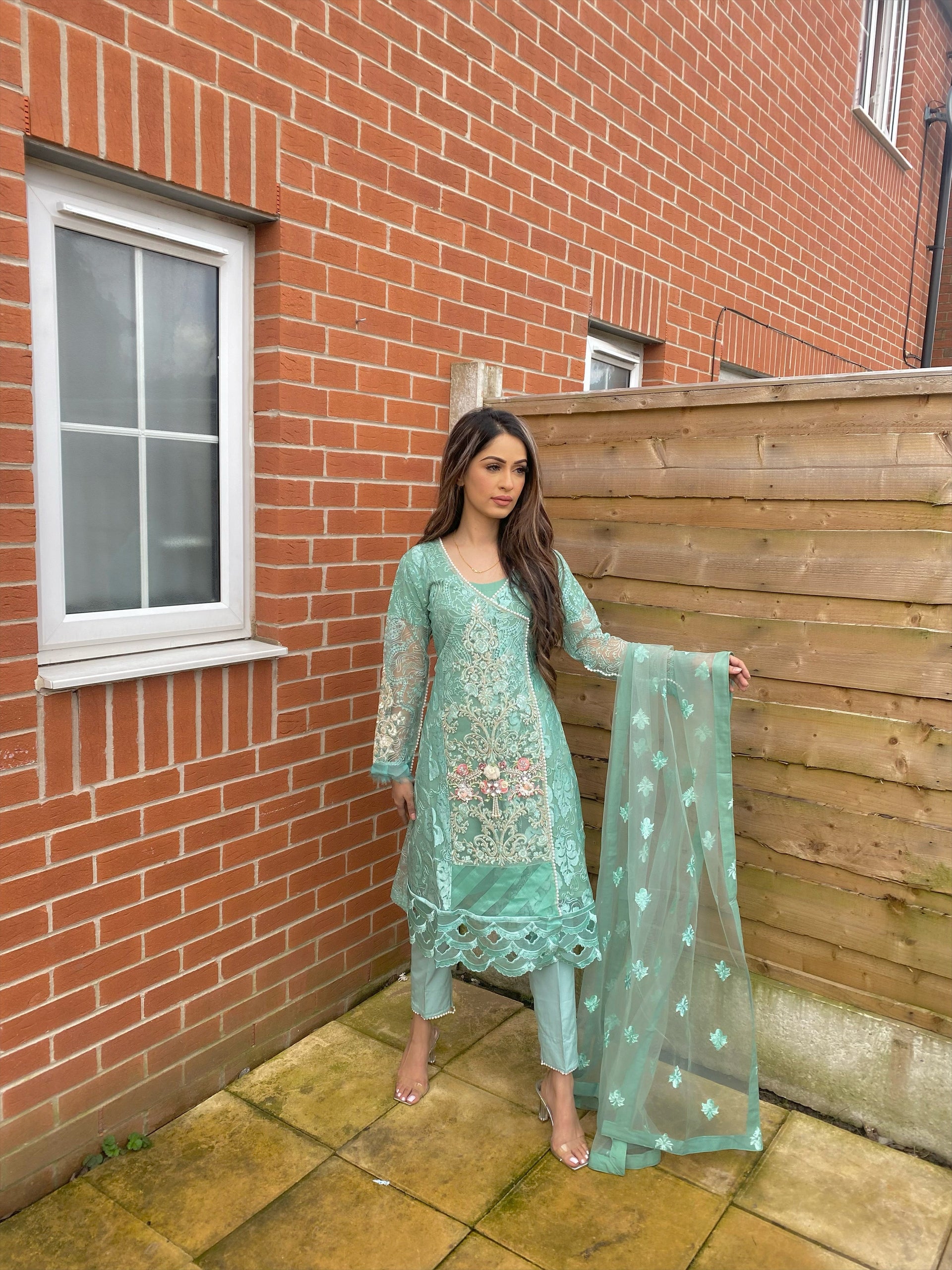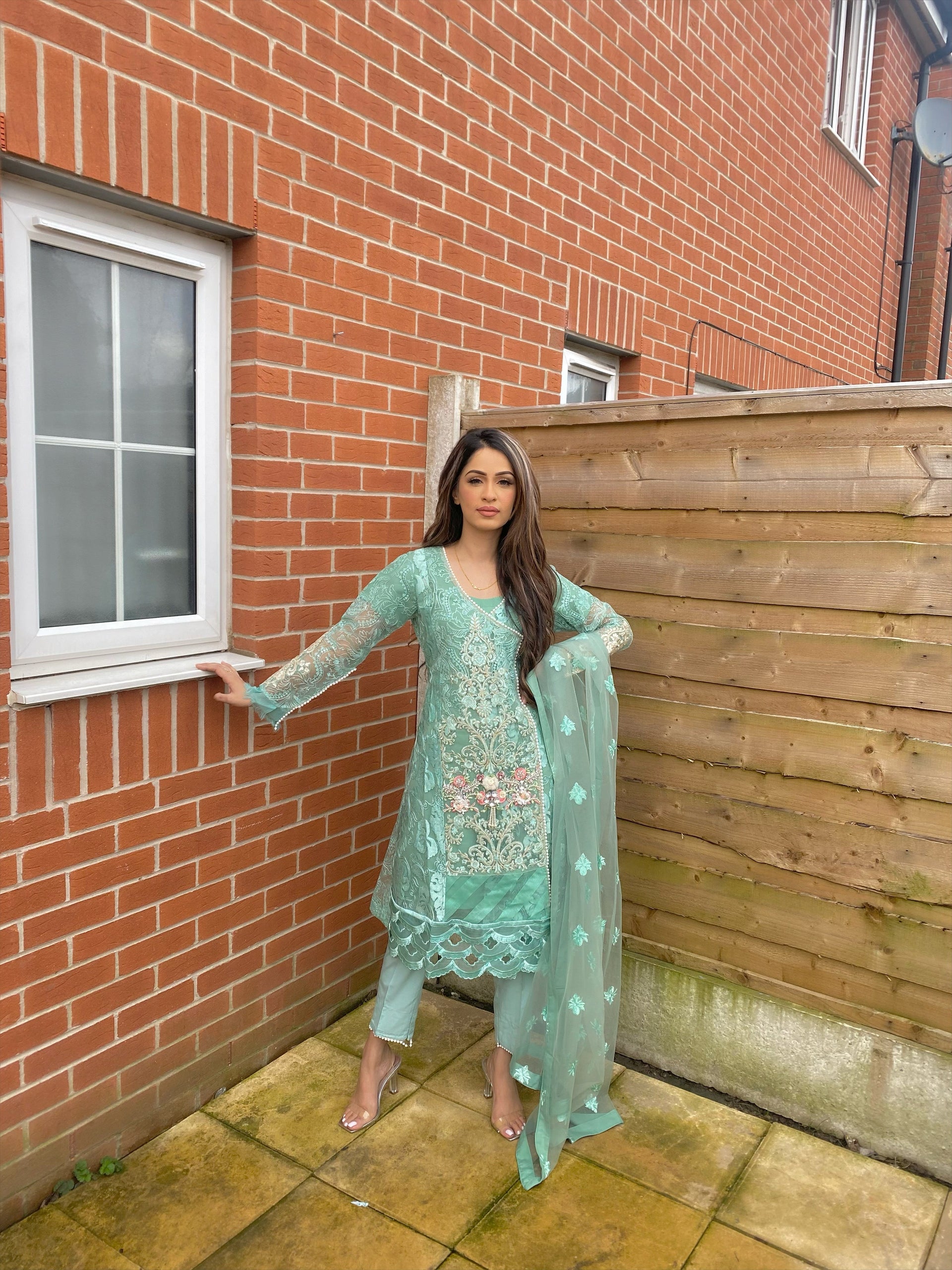 Ready to wear, net suit with zari thread embroidery and hand work, embellished with sequins, beads and diamontes, Beautifully embroidered Available in sizes small to xxl.
