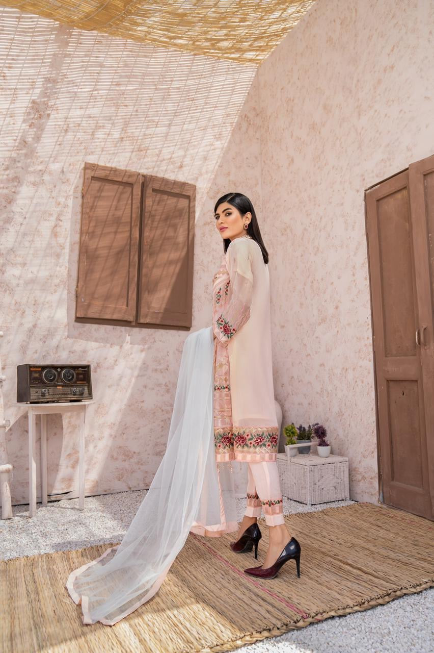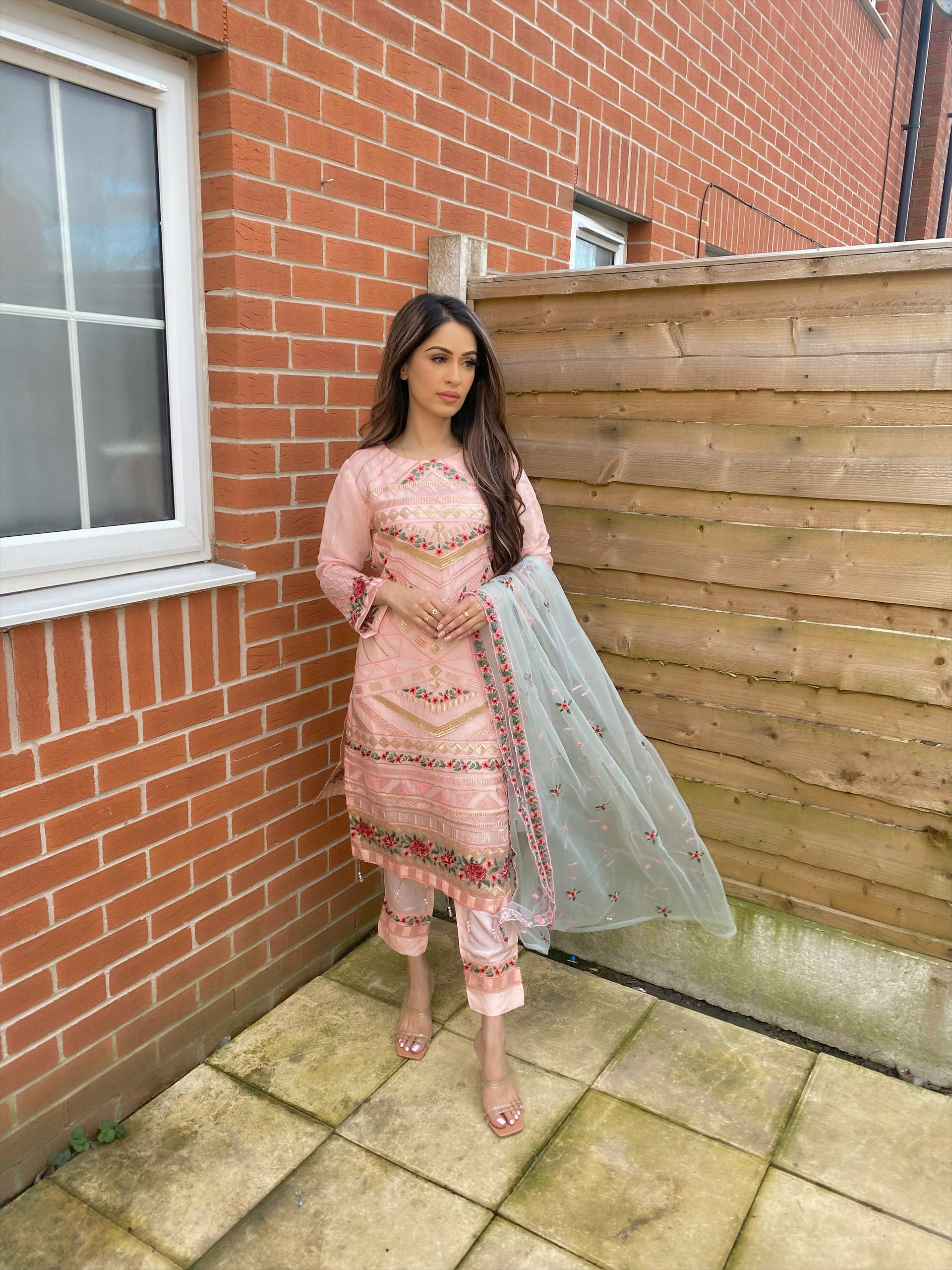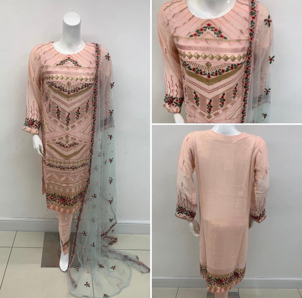 Ready to wear, elegantly embroidered chiffon with sequin and pearl detail, embroidery on trousers, comes with embroidered net dupatta. Available in sizes small to xxl.