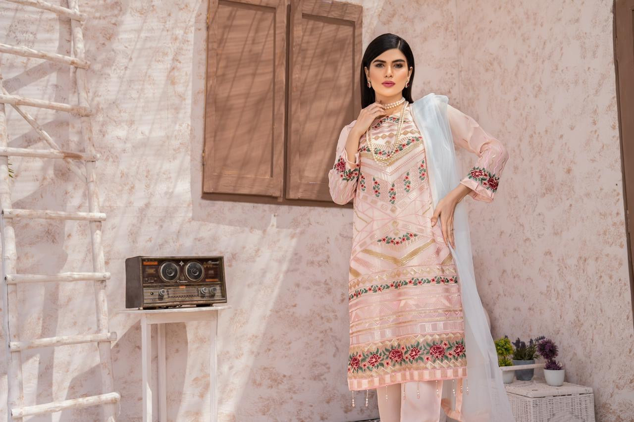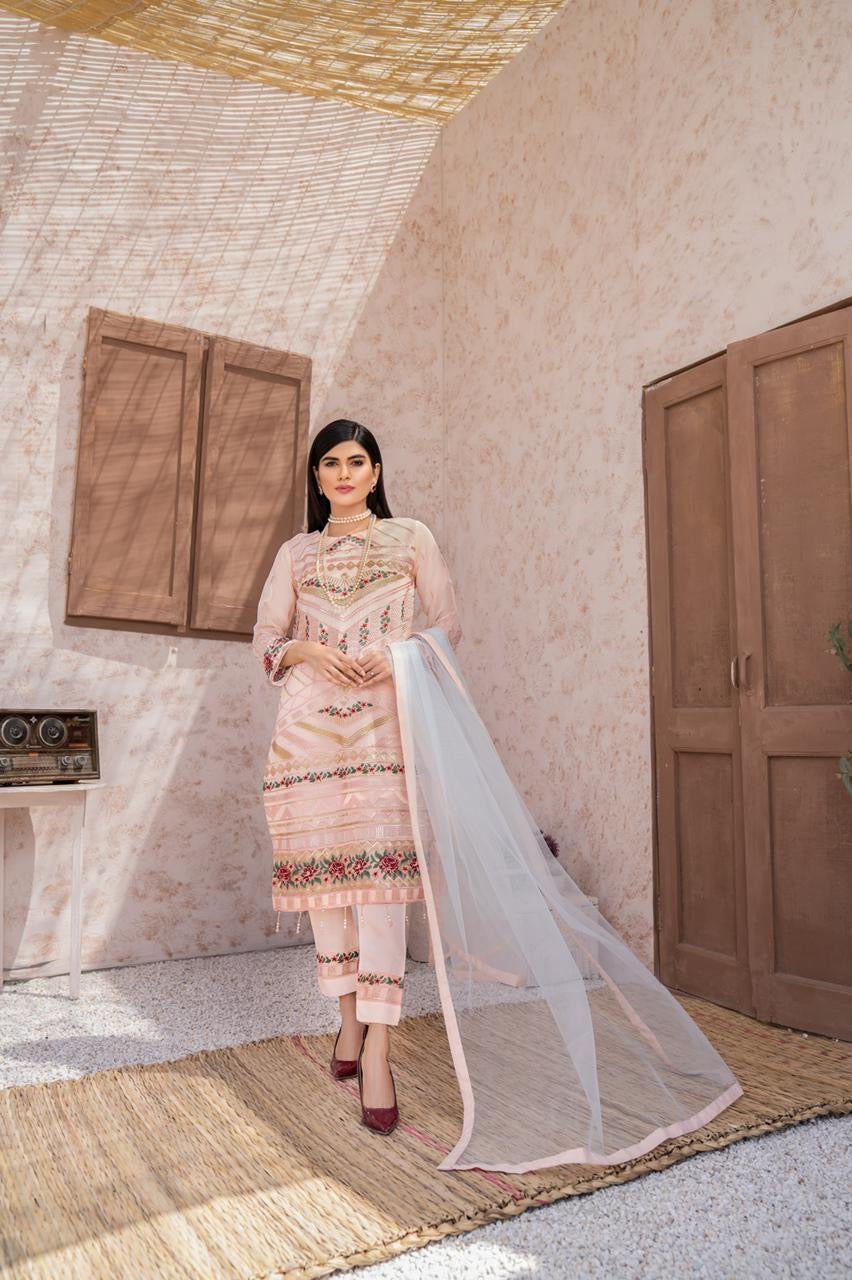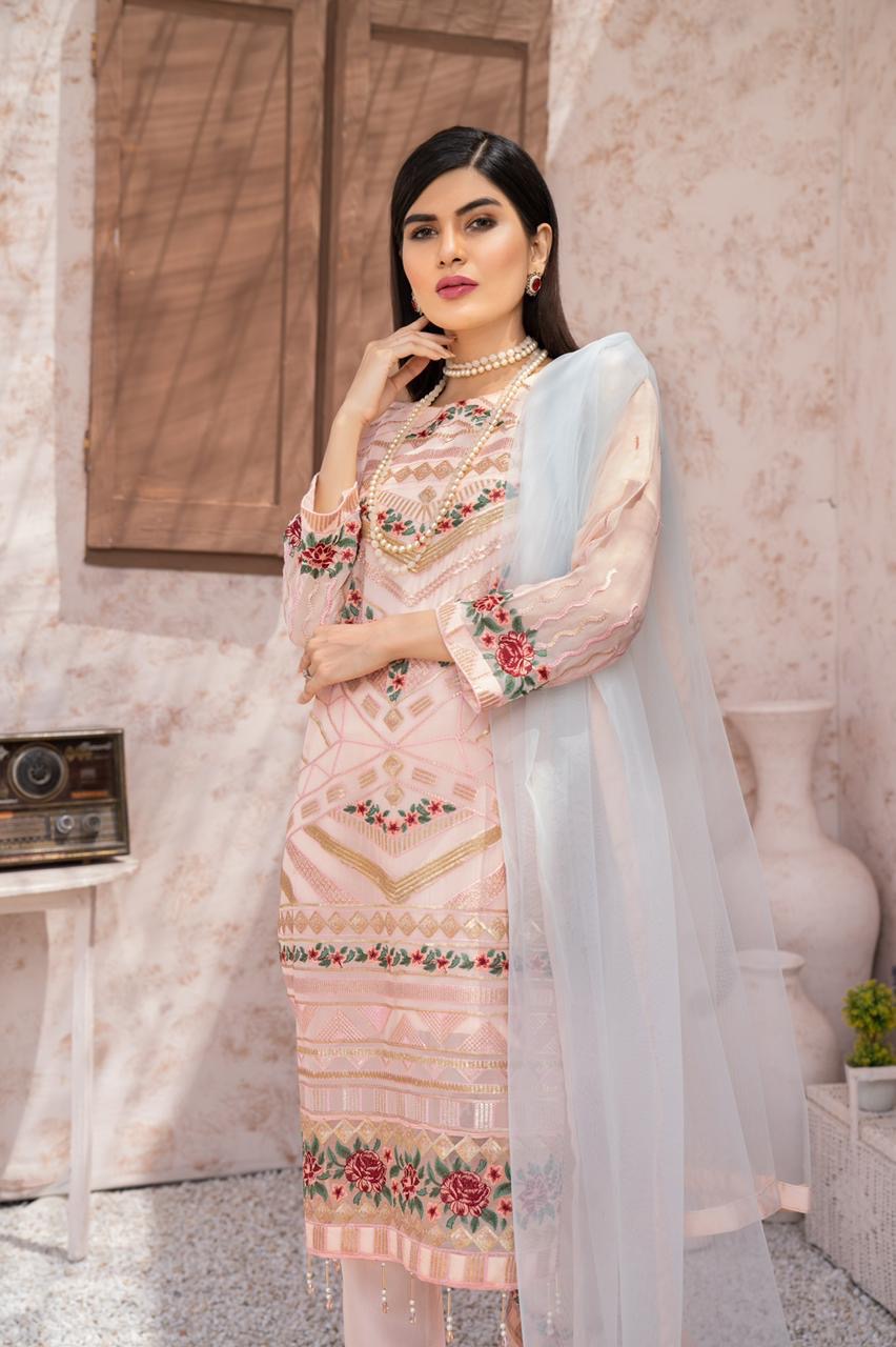 Ready to wear, elegantly embroidered chiffon with sequin and pearl detail, embroidery on trousers, comes with embroidered net dupatta. Available in sizes small to xxl.