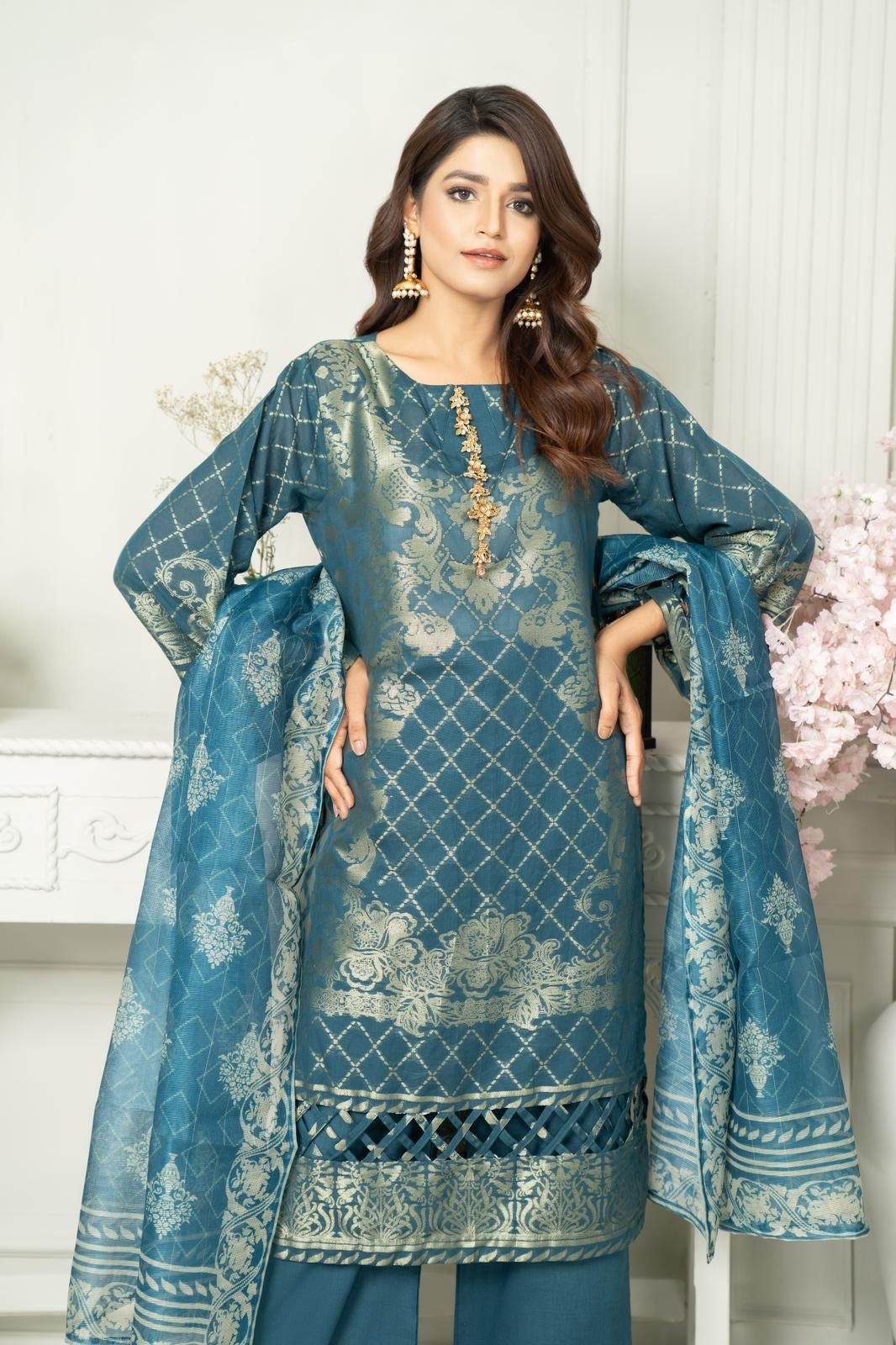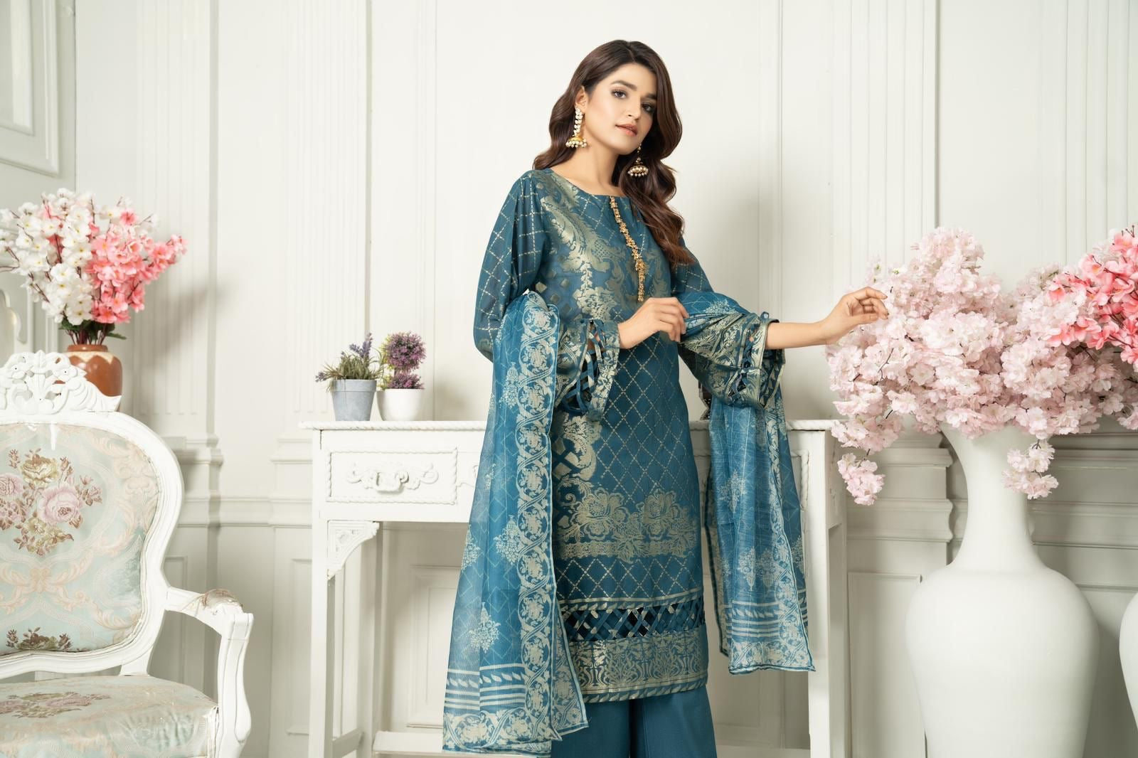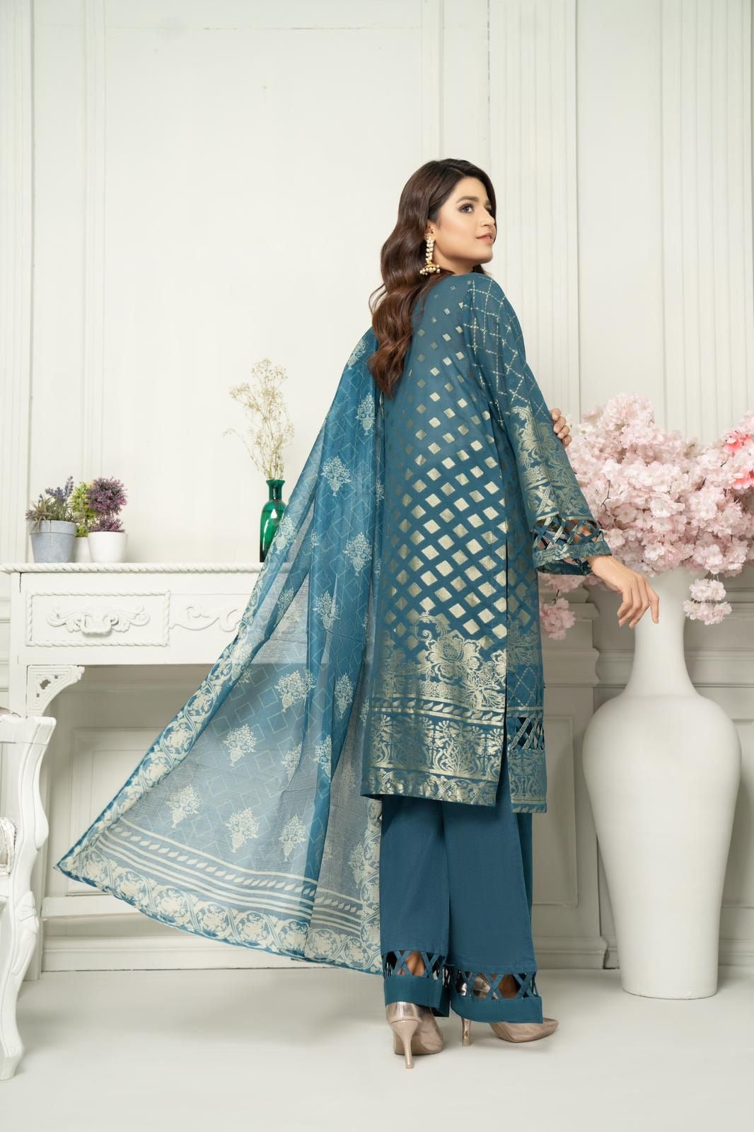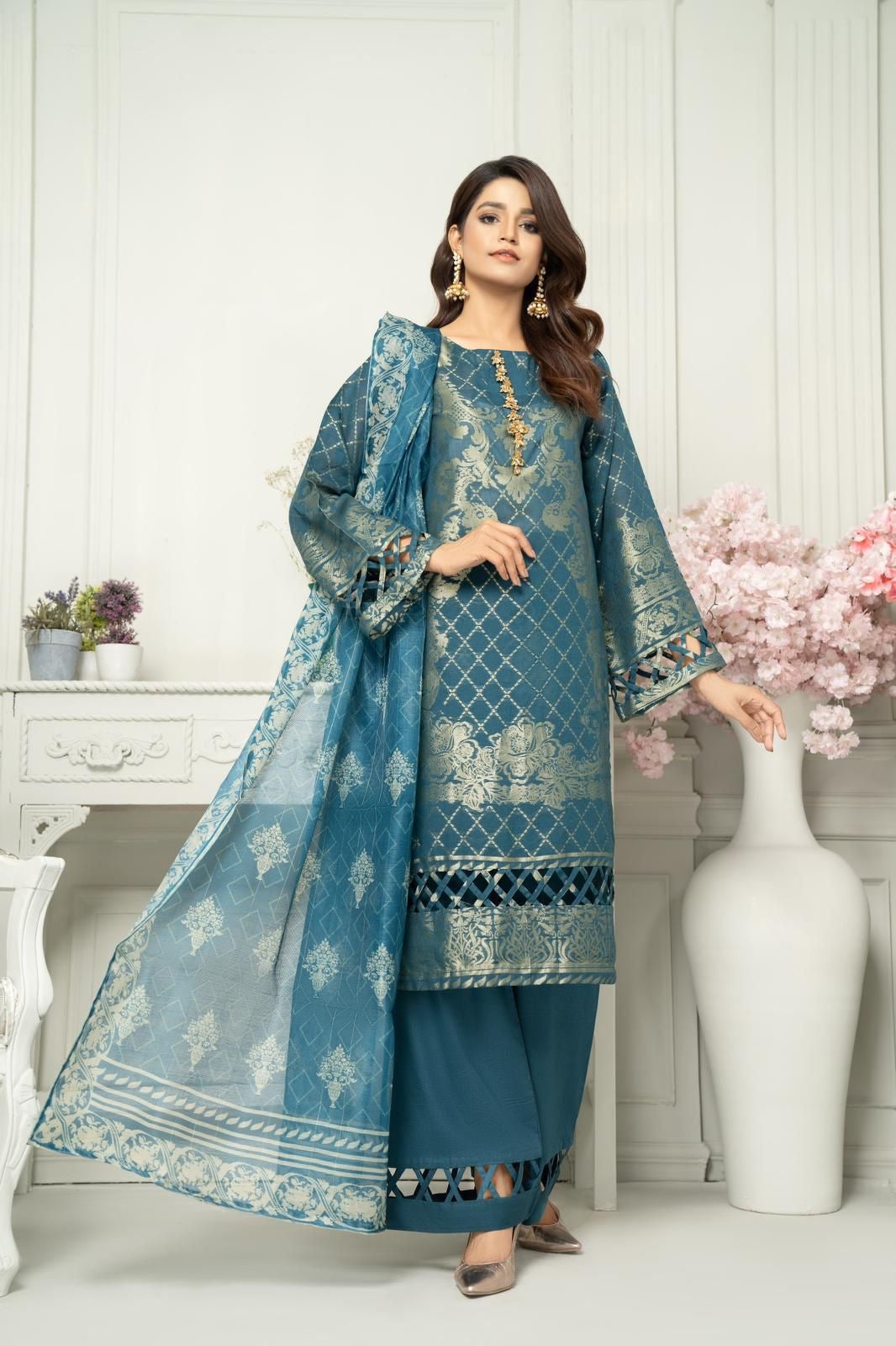 Ready to wear, pure cambric fabric woven with jacquard, neckline embellished and cutwork design on sleeves, kameez border and trouser, comes with jacquard dupatta. Available in small to xxl.