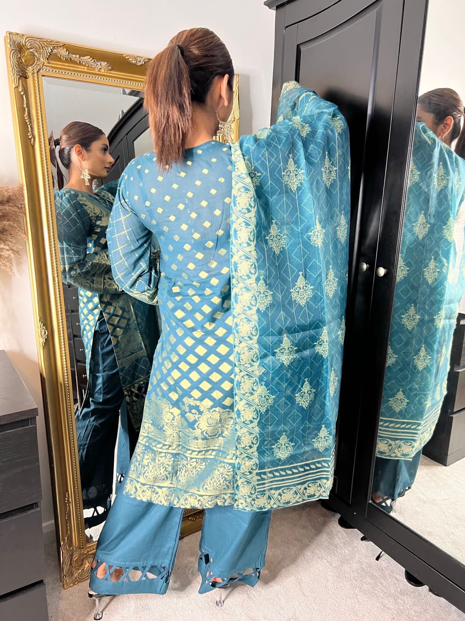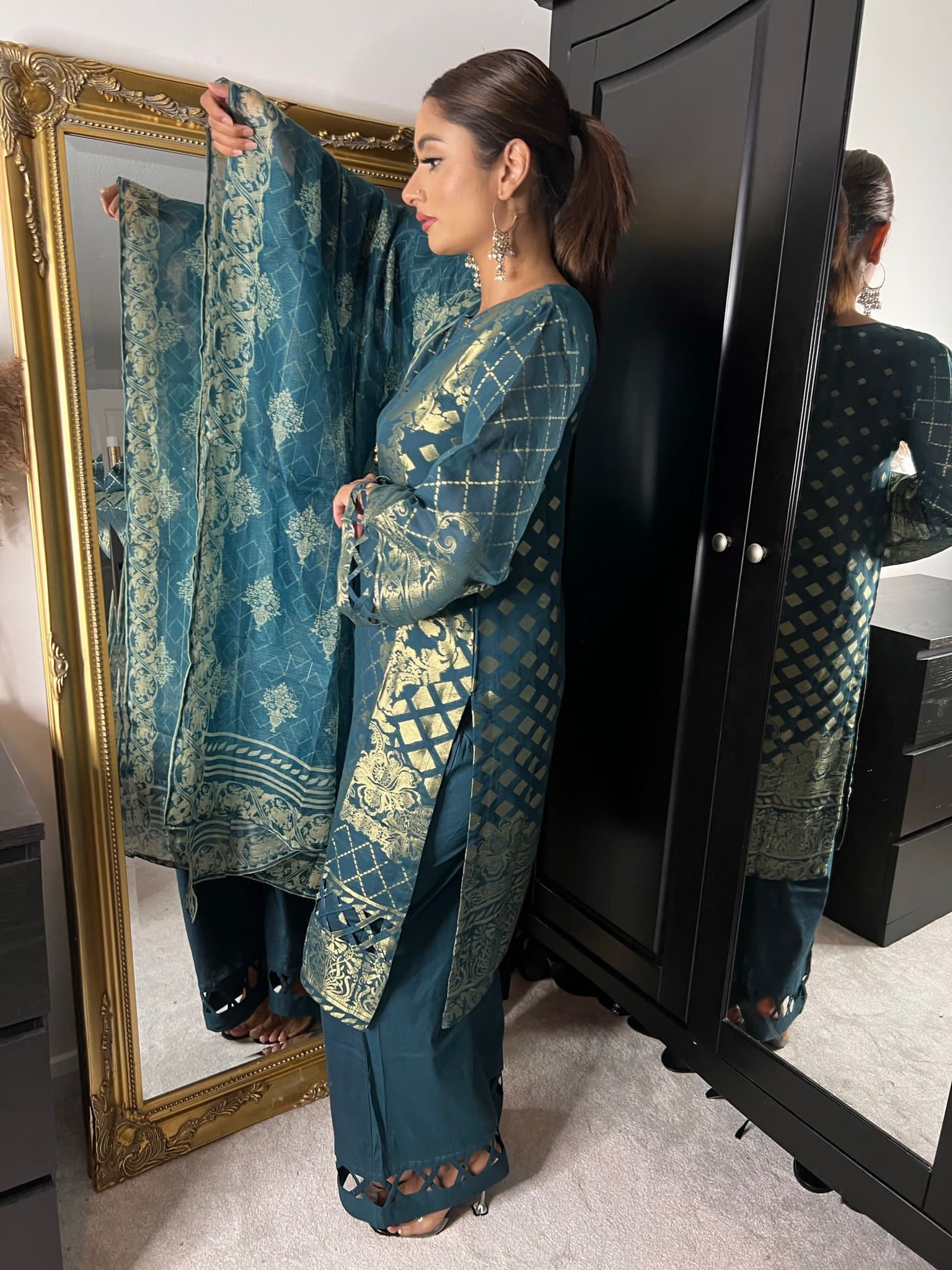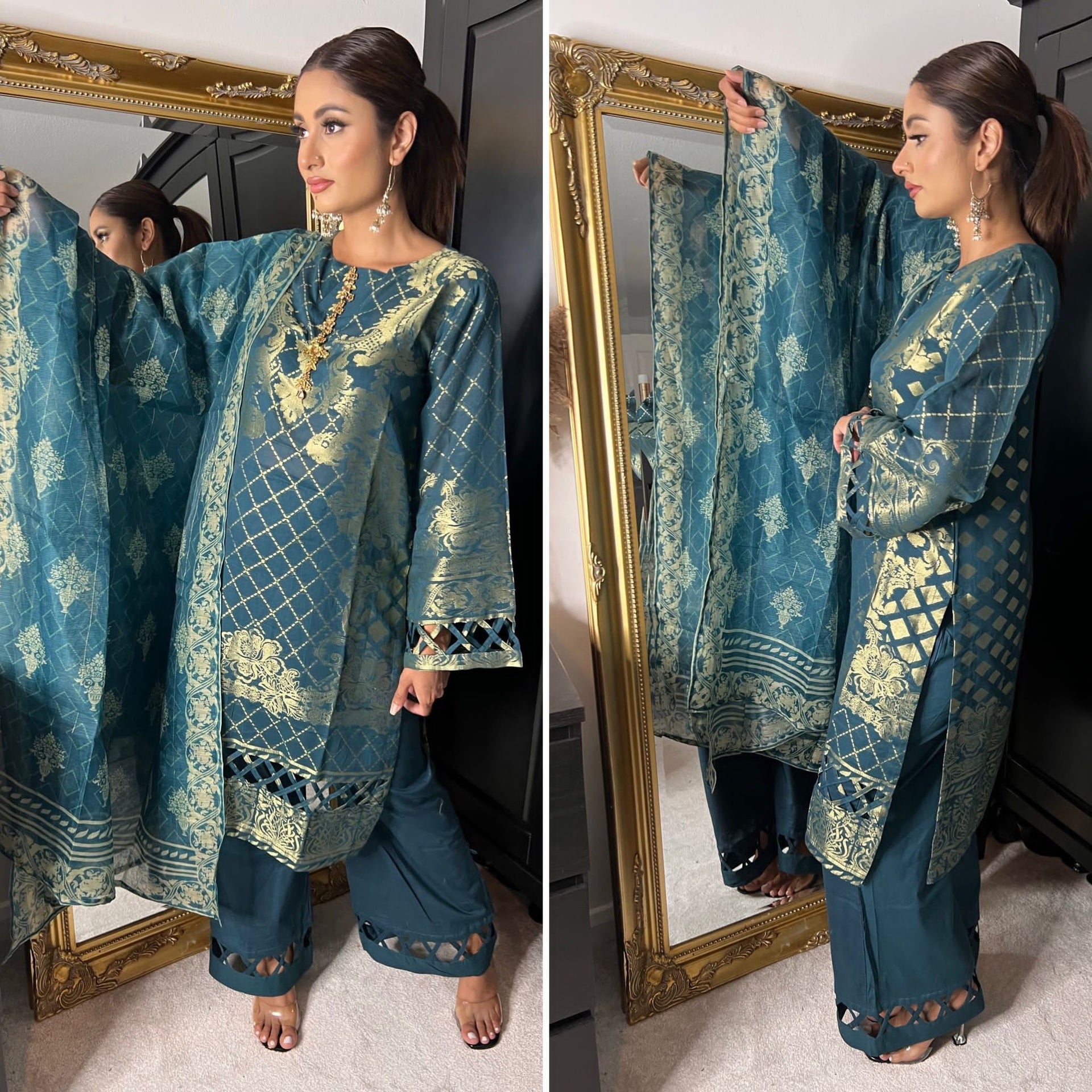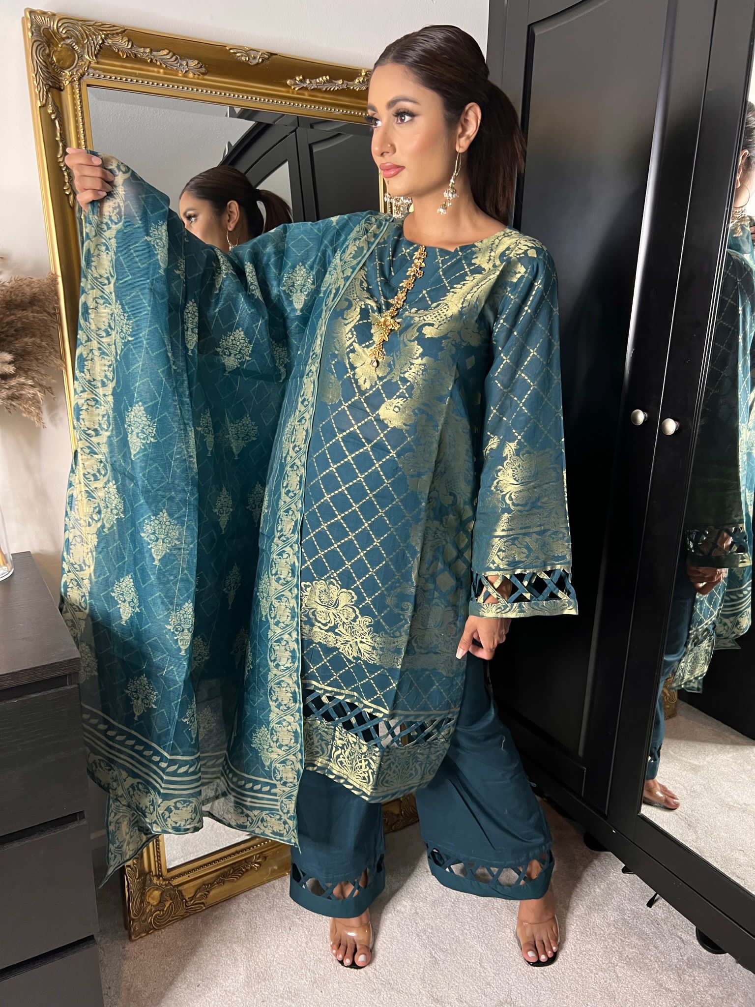 Ready to wear, pure cambric fabric woven with jacquard, neckline embellished and cutwork design on sleeves, kameez border and trouser, comes with jacquard dupatta. Available in small to xxl.
