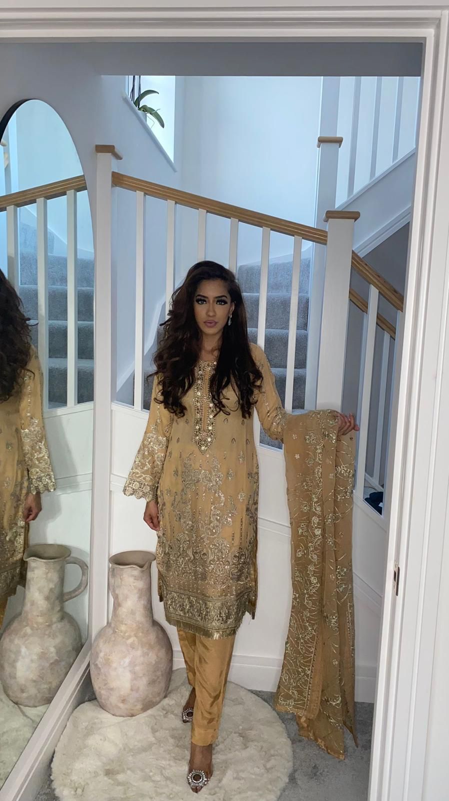 Ready to wear, elegantly embroidered pure chiffon with sequin and button embellishments. Accompanied with intricately embroidered chiffon and organza dupattas. Ideal festive seasonal wear. Available in sizes small to extra large.