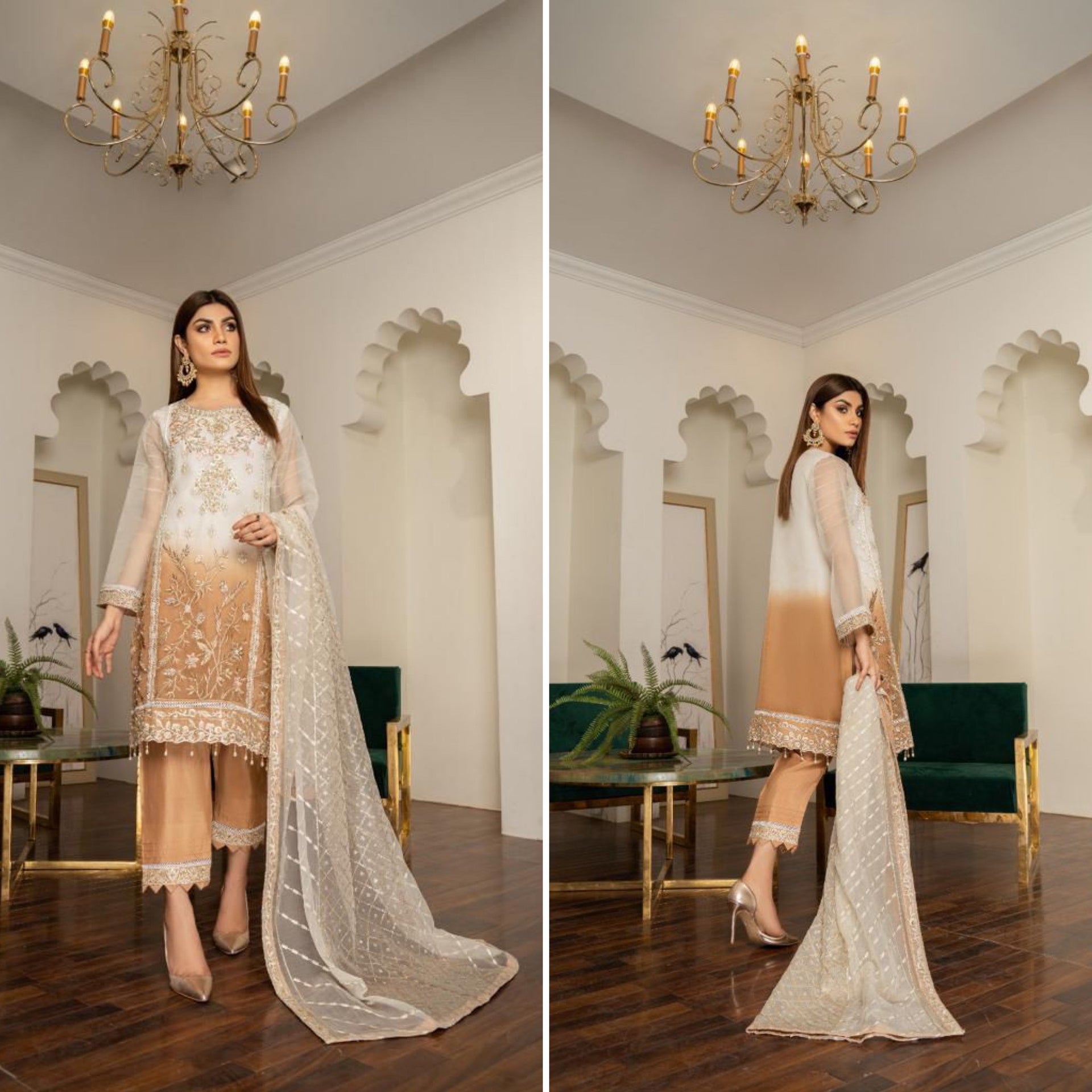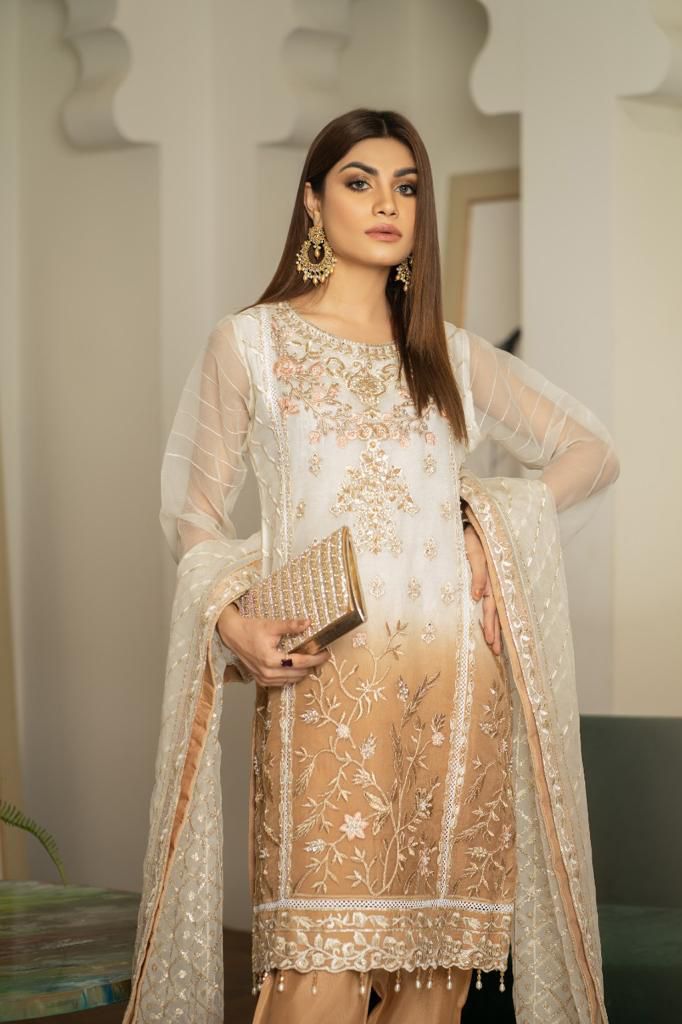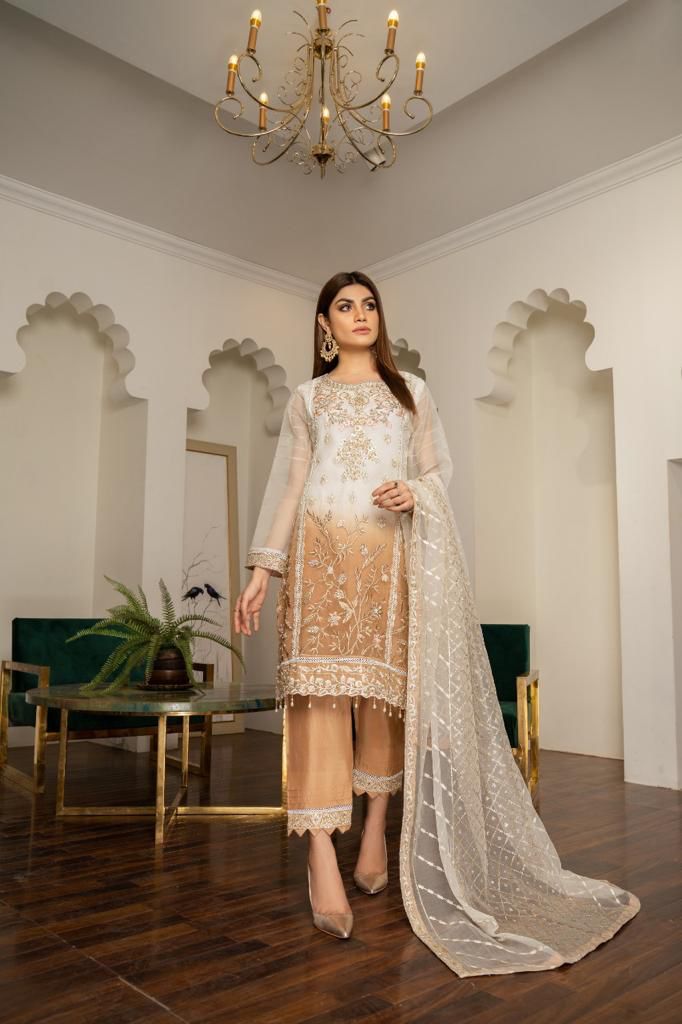 - Stitched, bronze two tone organza kameez with hand embroidery