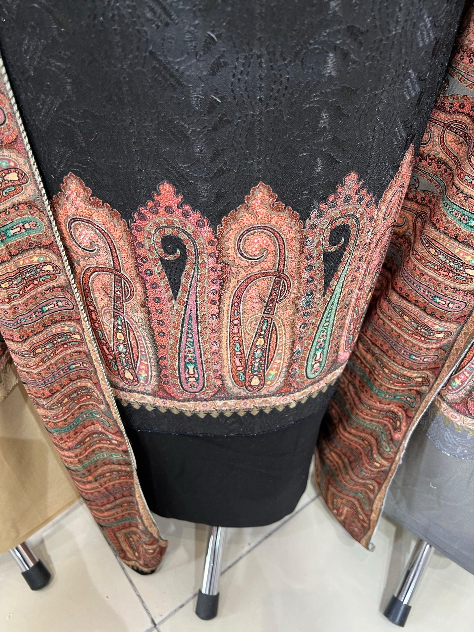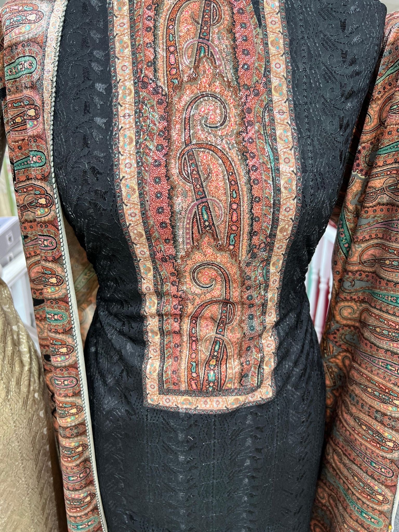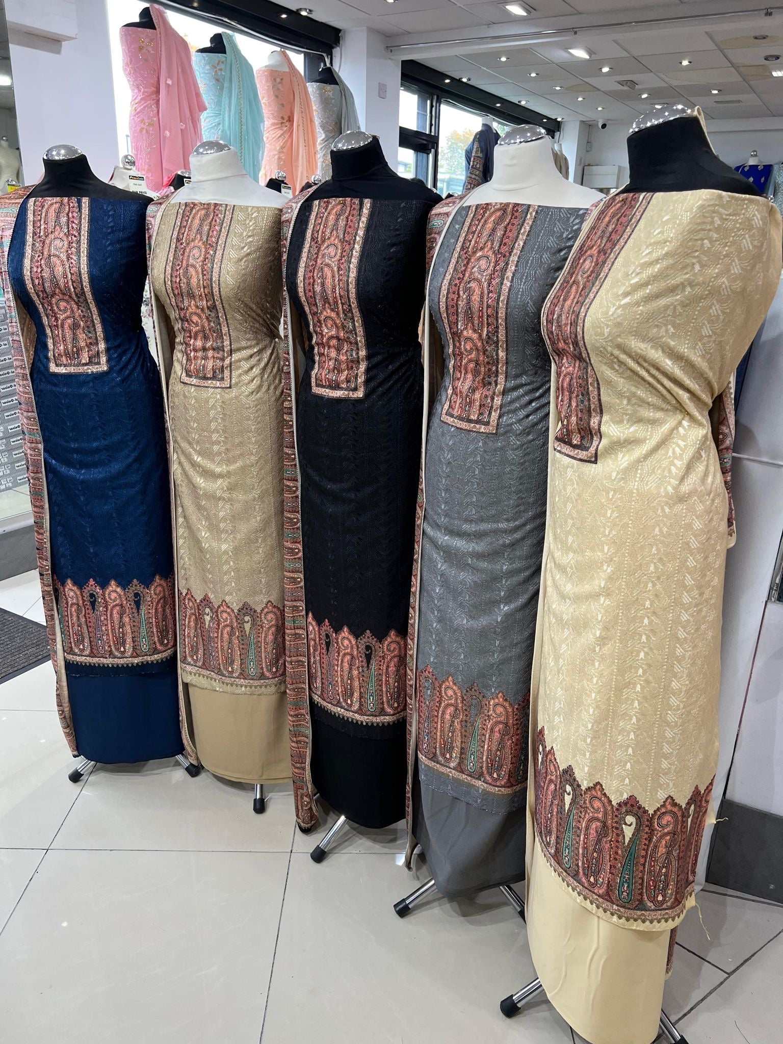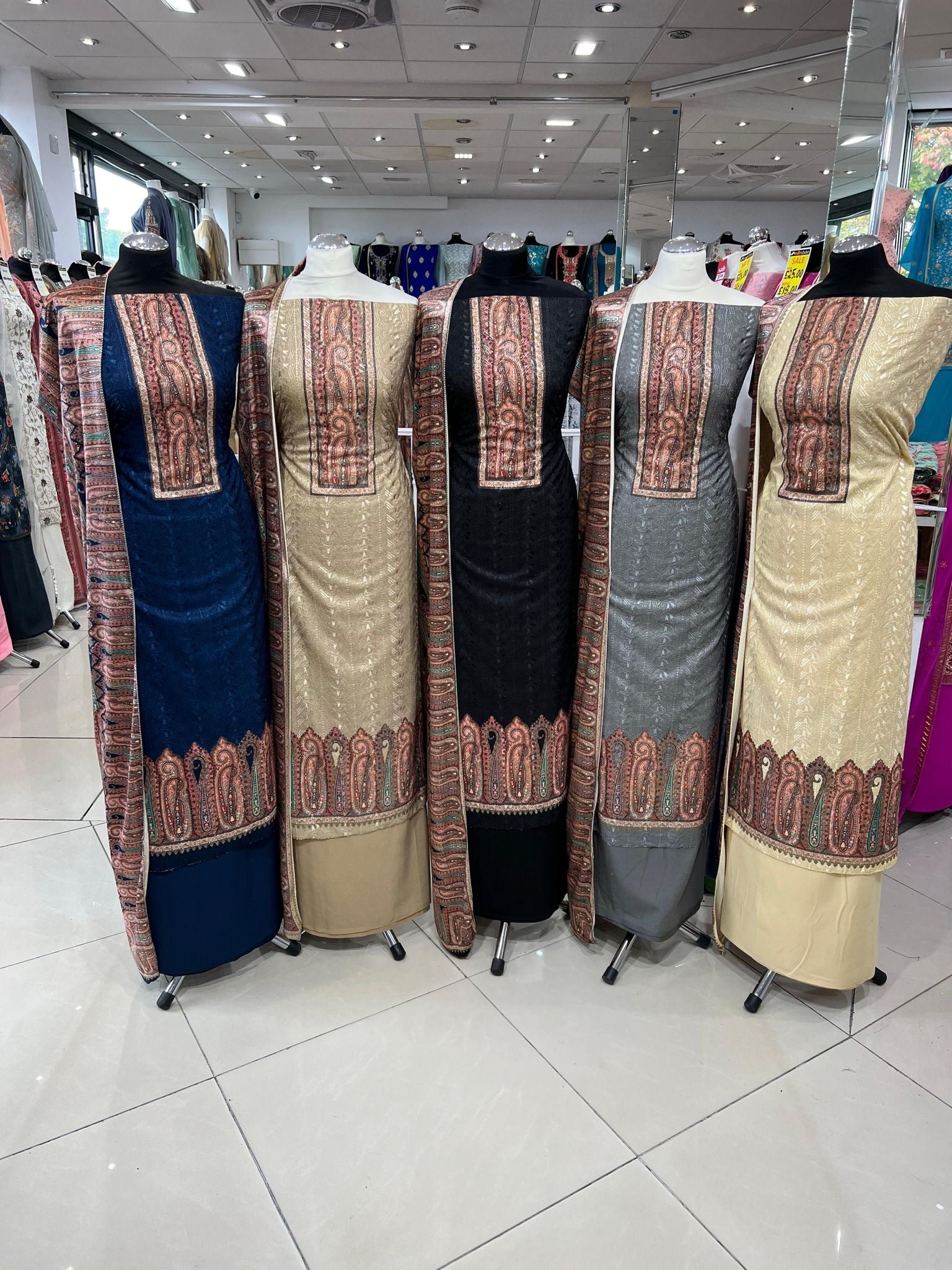 Discover our exquisite collection of suits, featuring four distinct colours on display, perfect for any occasion. Each suit is crafted with an Alpine design, complemented by a luxurious velvet shawl and intricate thread embroidery, showcasing a stunning digital print on both the back and front. these elegant suits offer exceptional value without compromising on style.