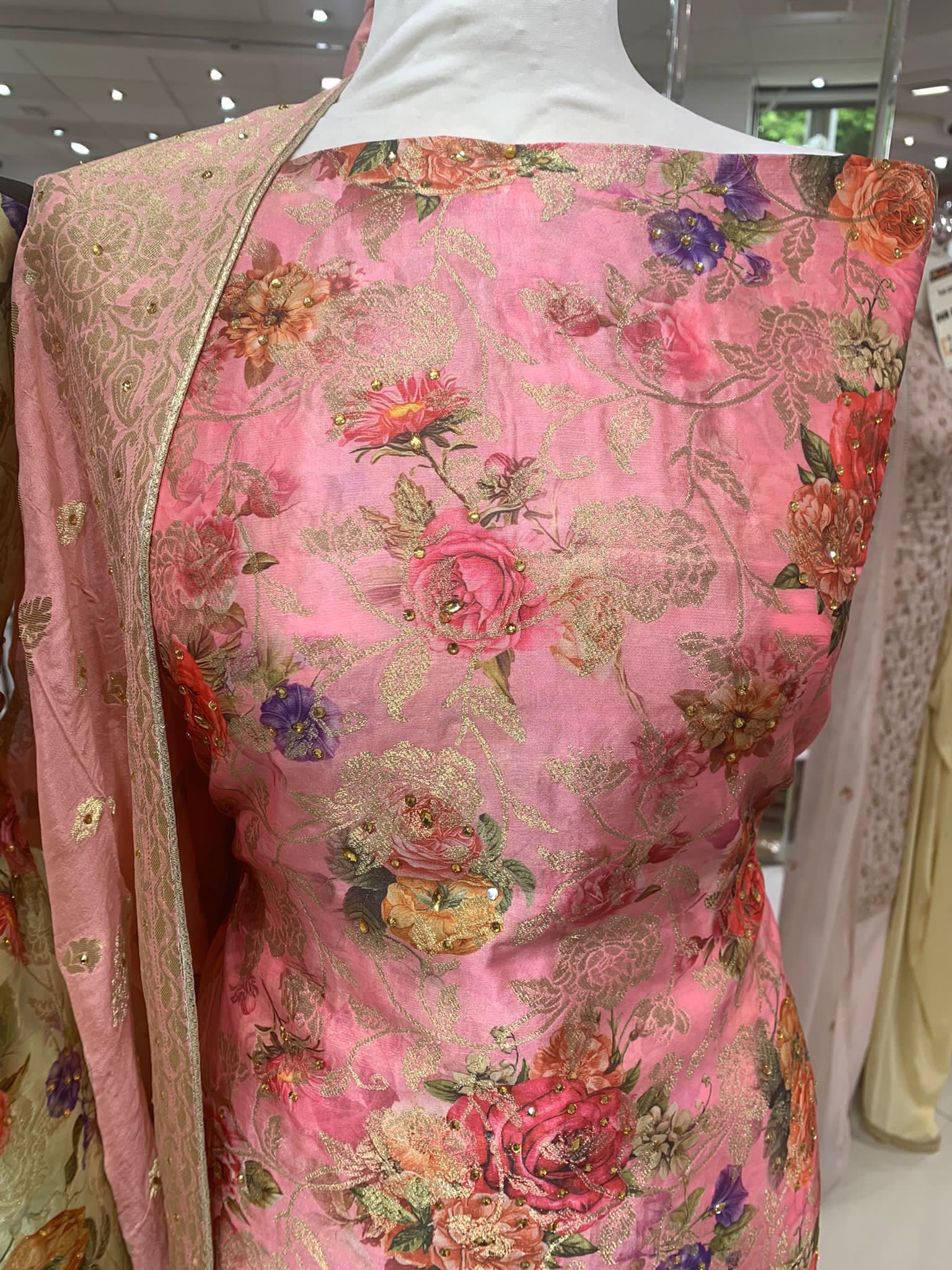Raw silk fabric with large digital print embellished with diamontes, comes with banarsi print dupatta with diamontes. A lovely addition to your spring/summer festive wear.
