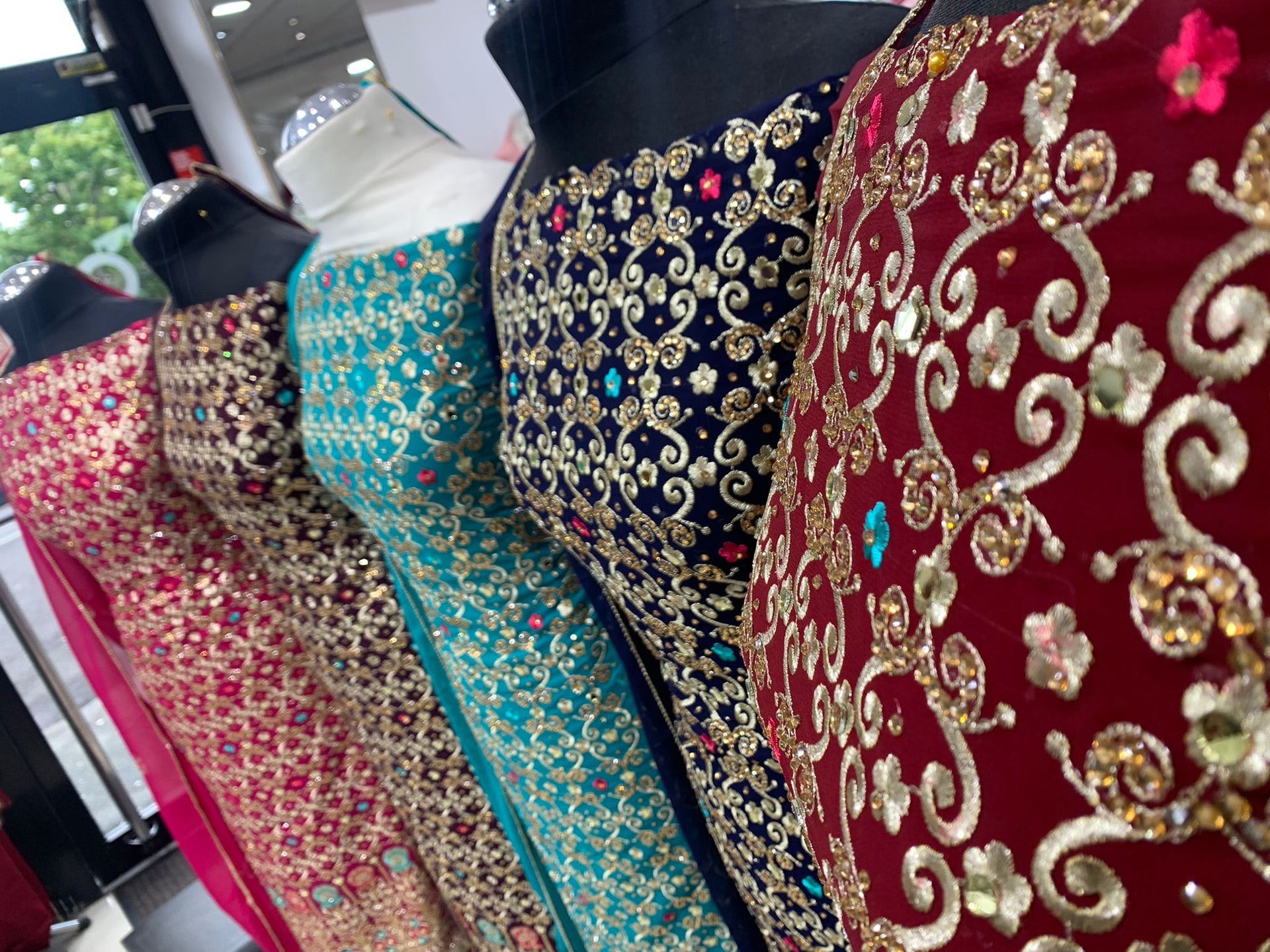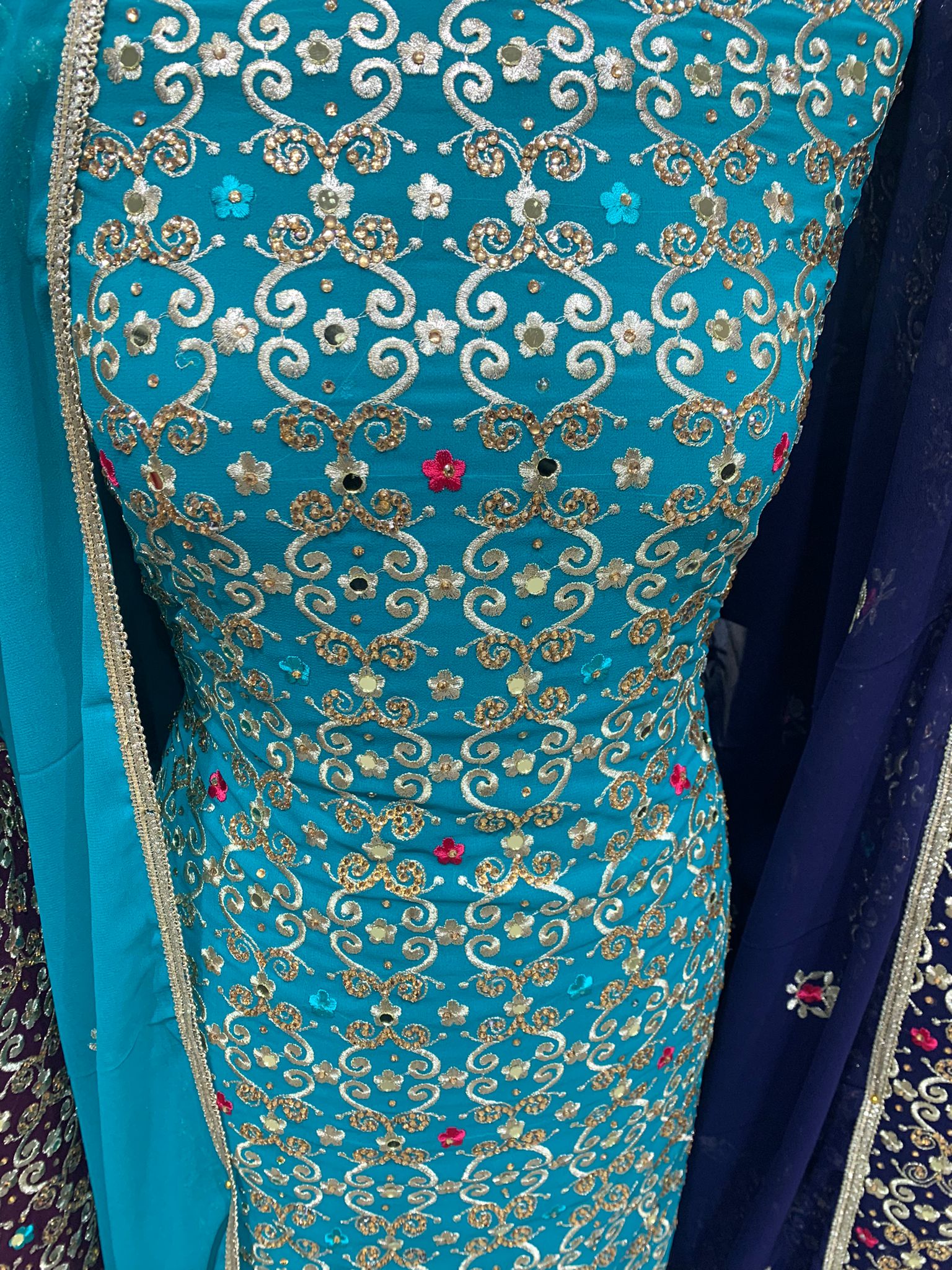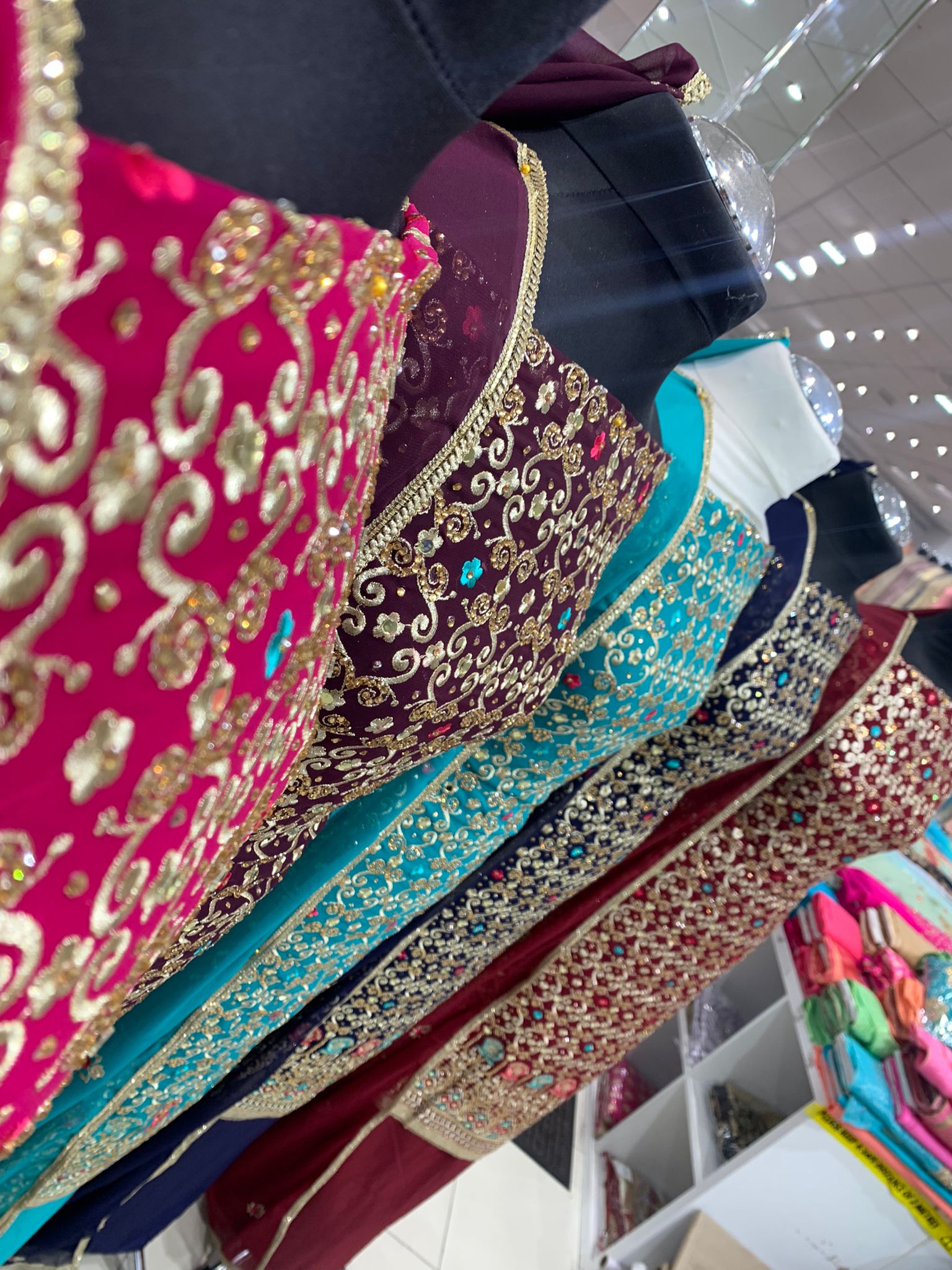 Stunning pure georgettes with intricate thread embroidery embellished with diamontes and mirror work. Available in five beautiful colours, ideal festive wear.