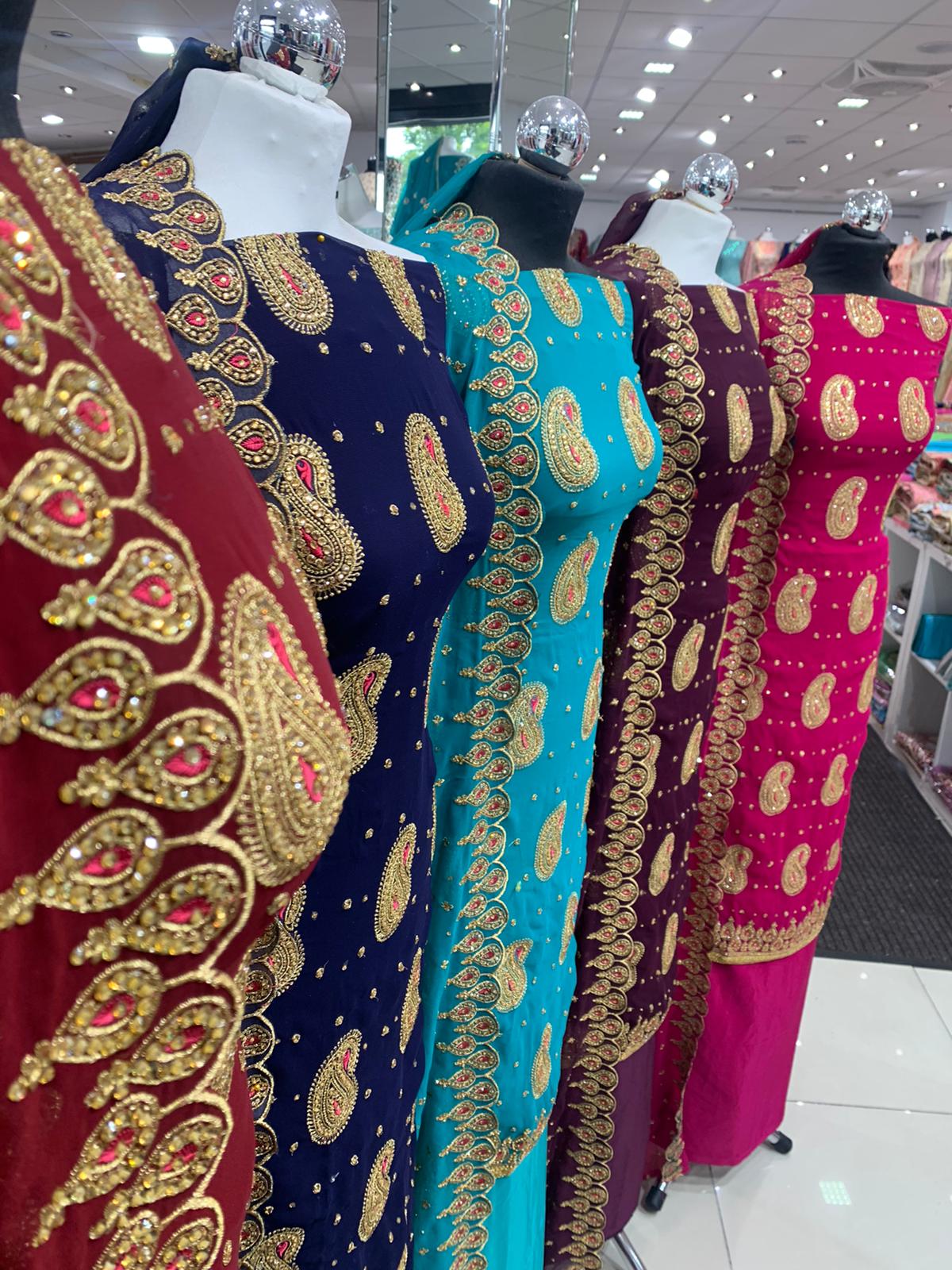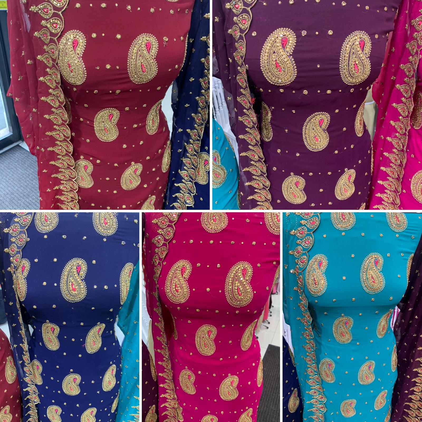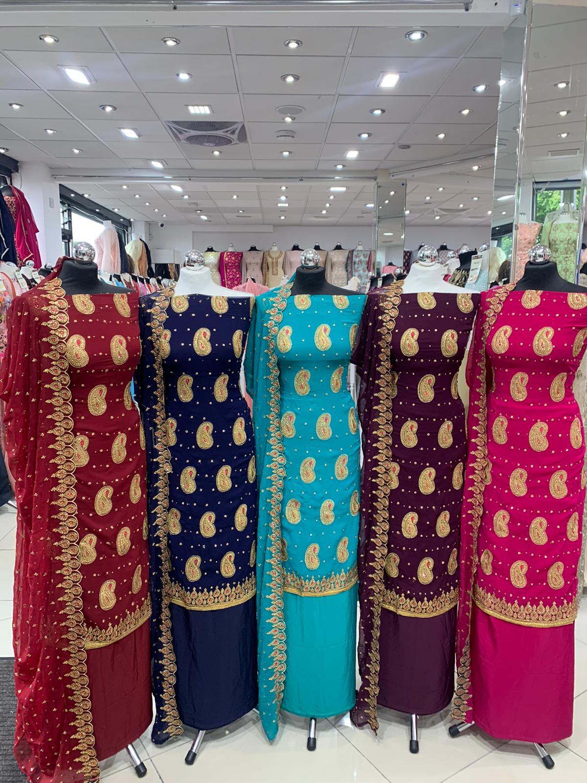 Heavily embellished pure georgette with mirror work and diamontes, gold thread work and embroidered motifs on kameez front, comes with fancy dupatta with embroidered scalloped edges. Ideal party wear.