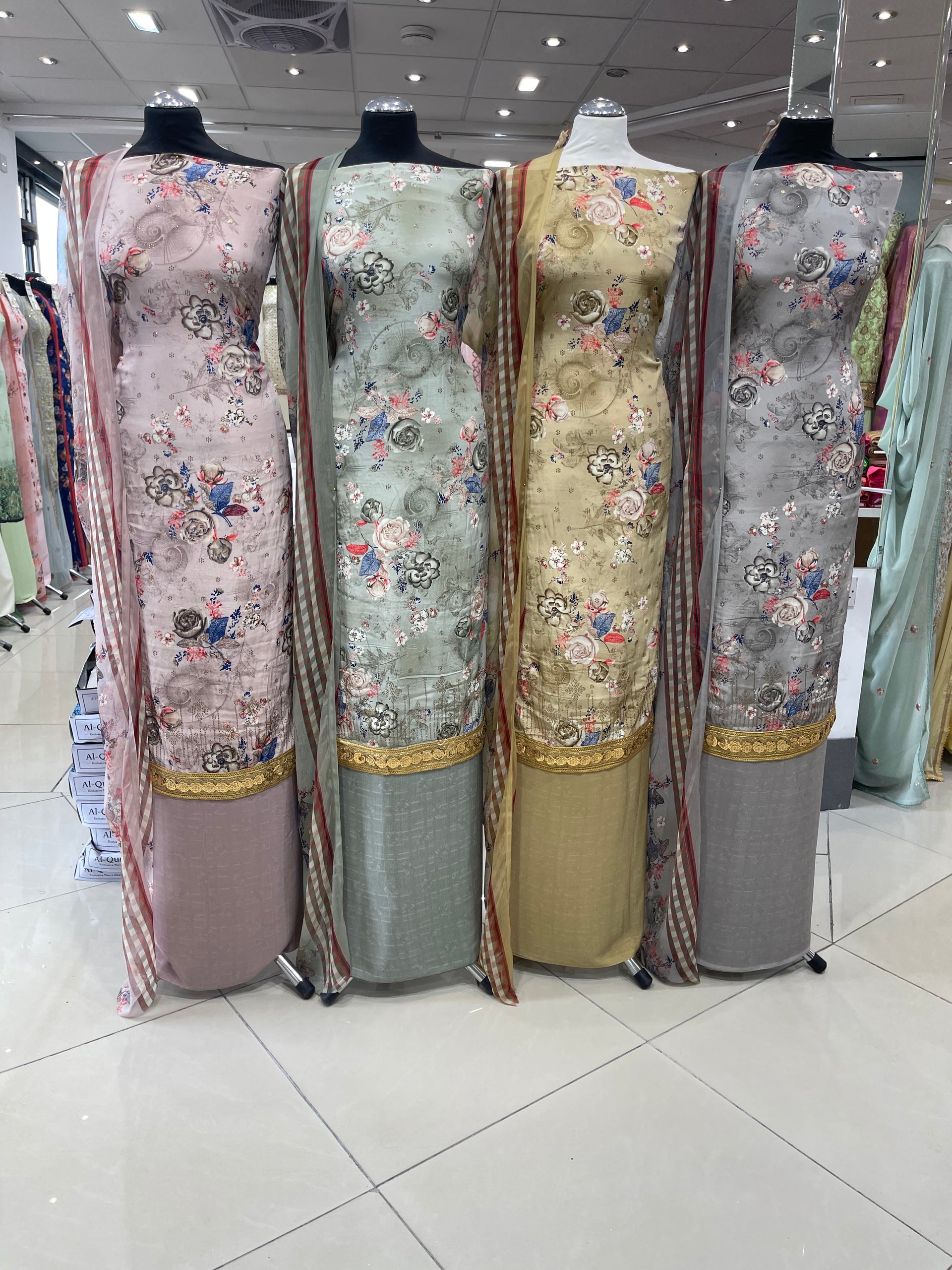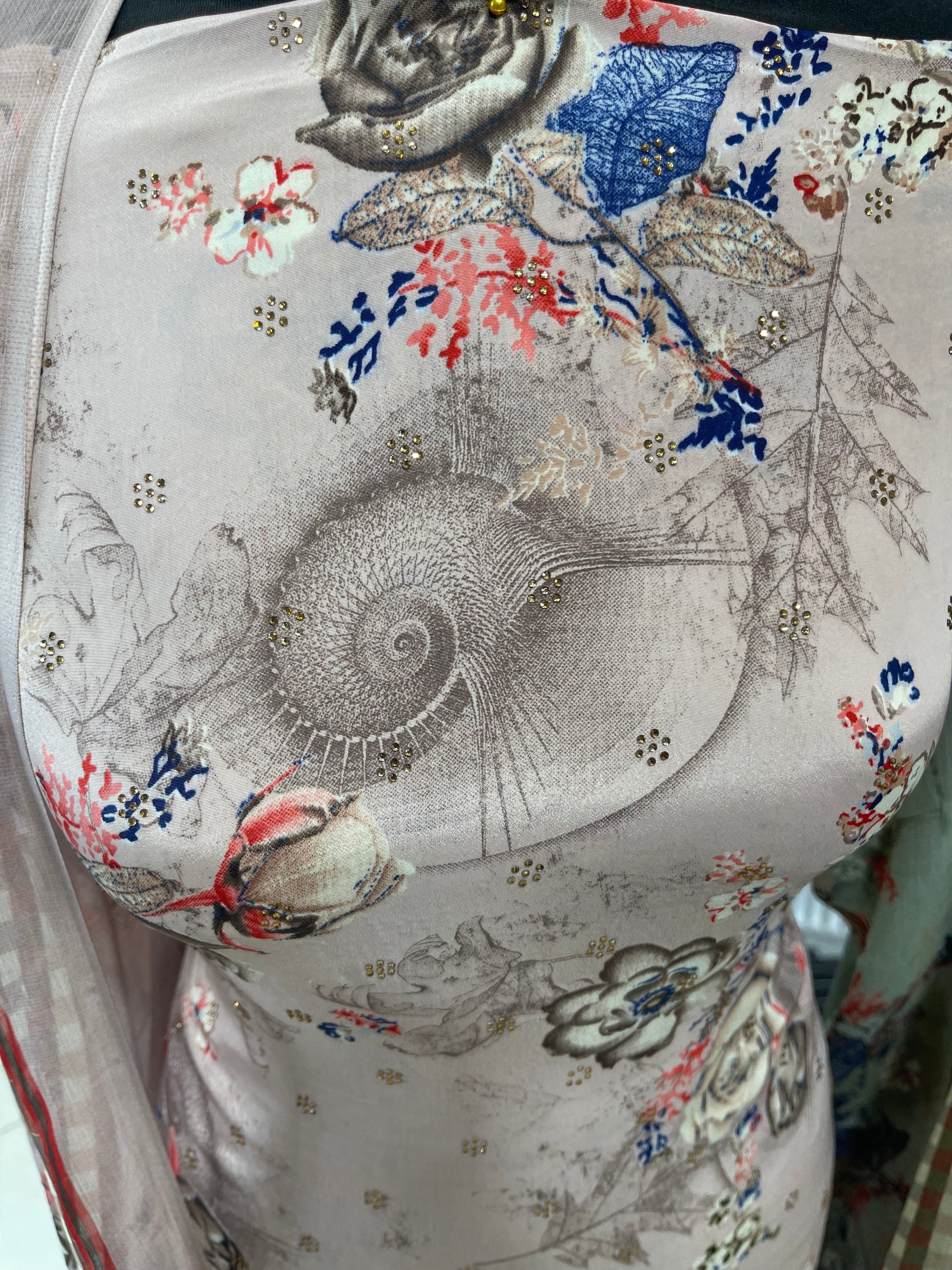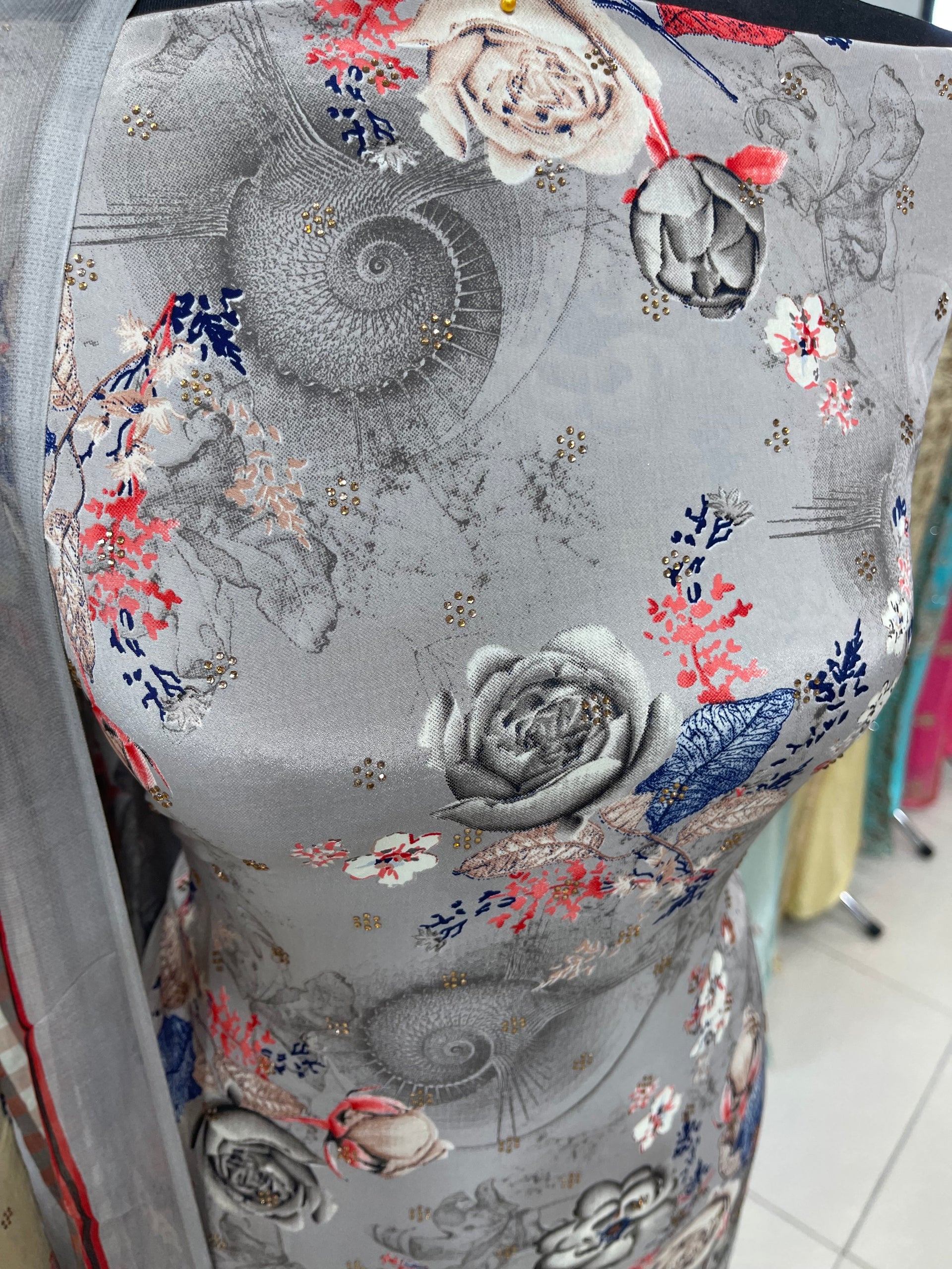Digital print french crepe with diamonte and sequin embellishments on kameez border, comes with printed bottoms and crepe dupatta.