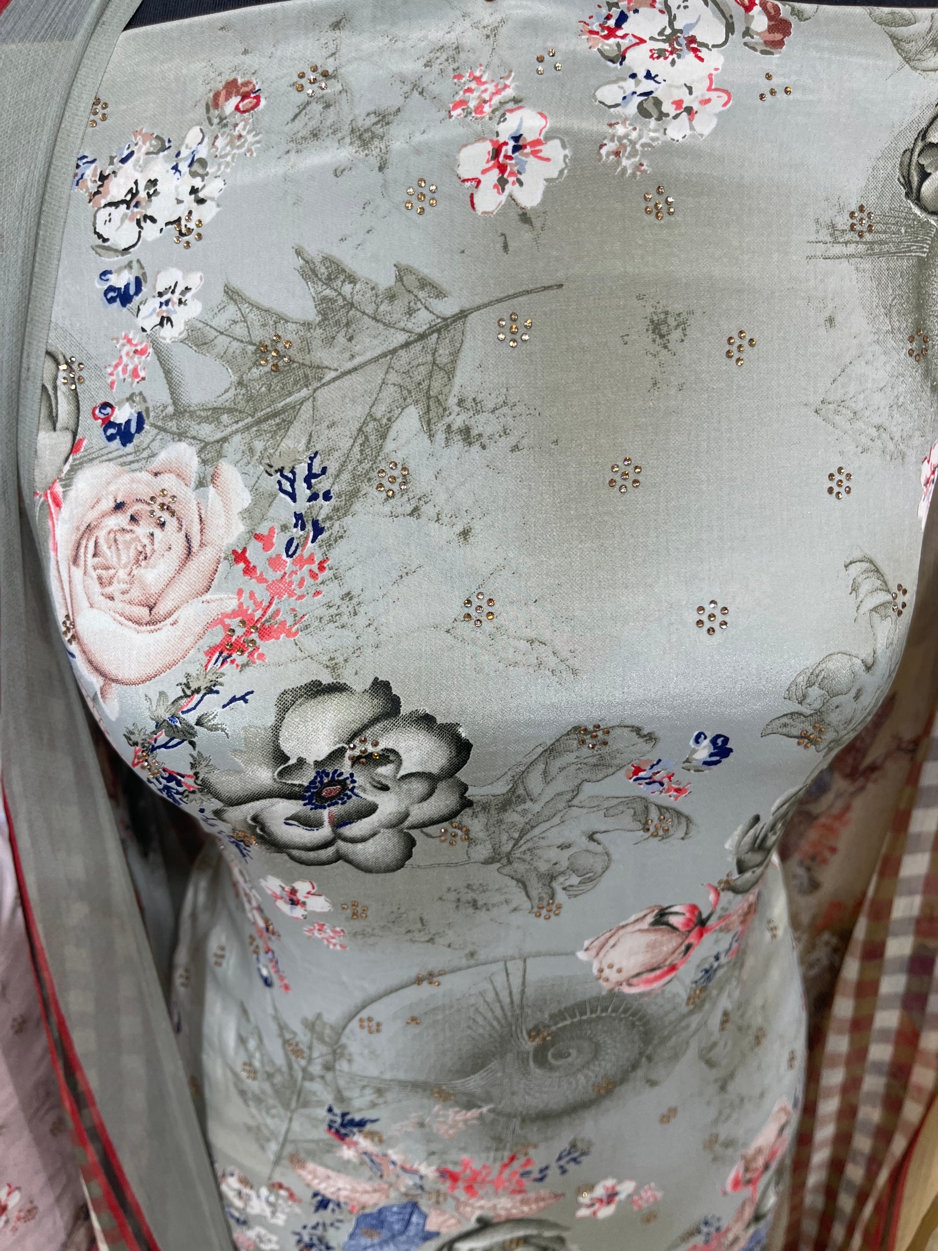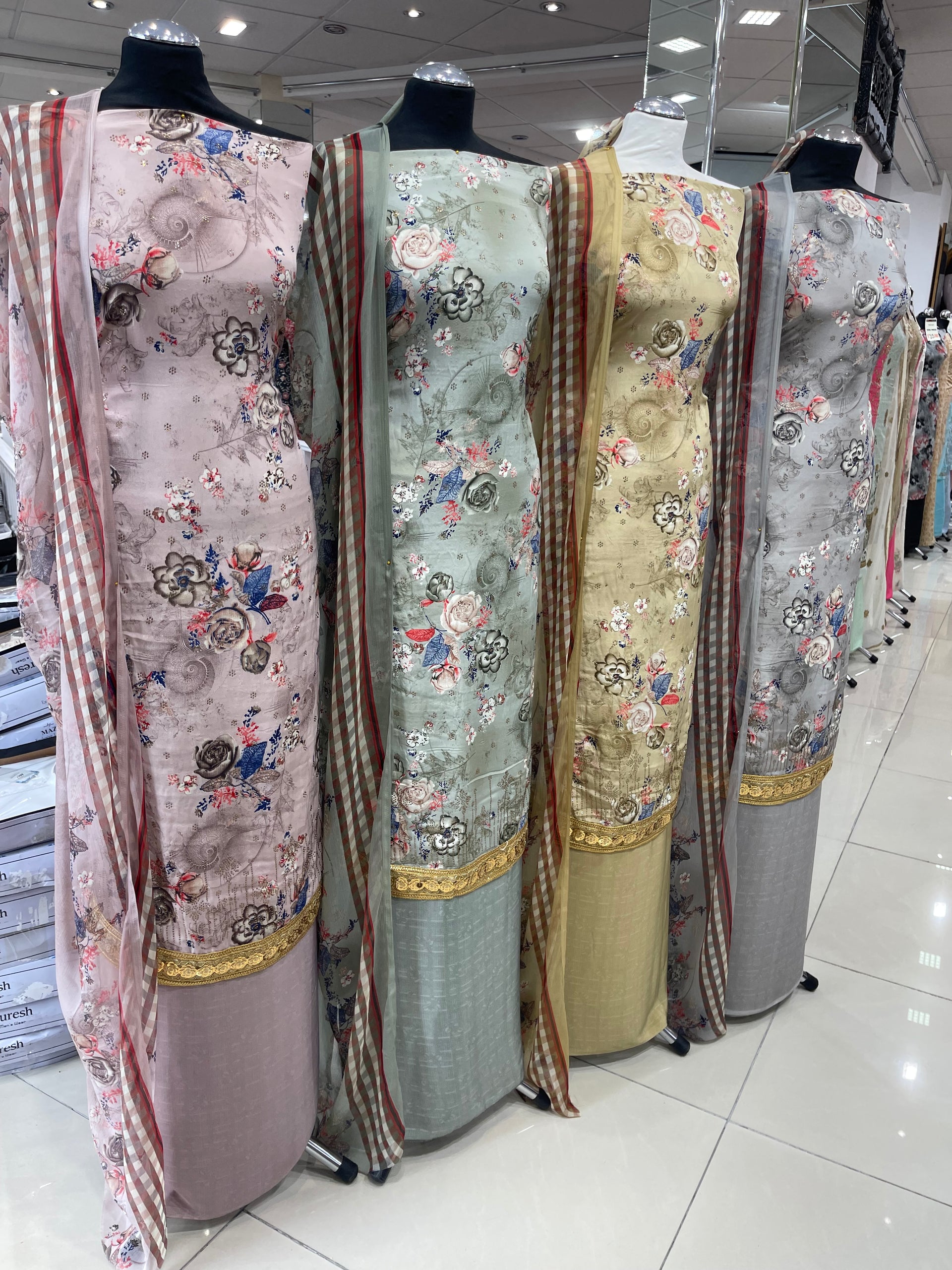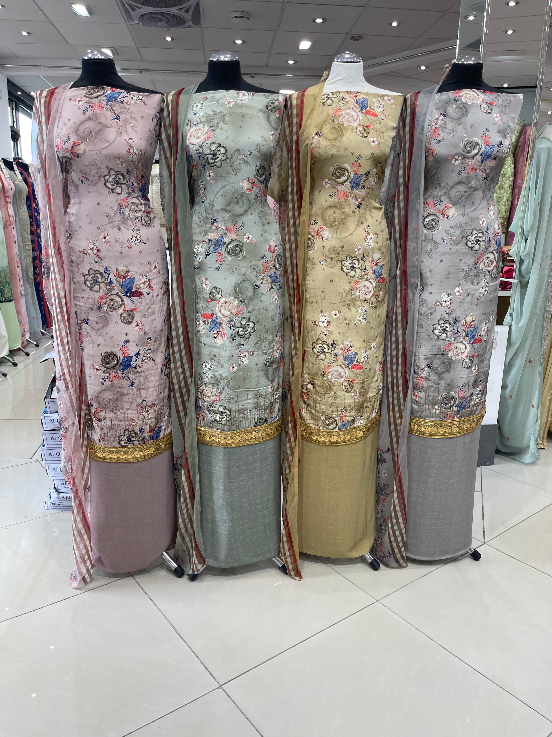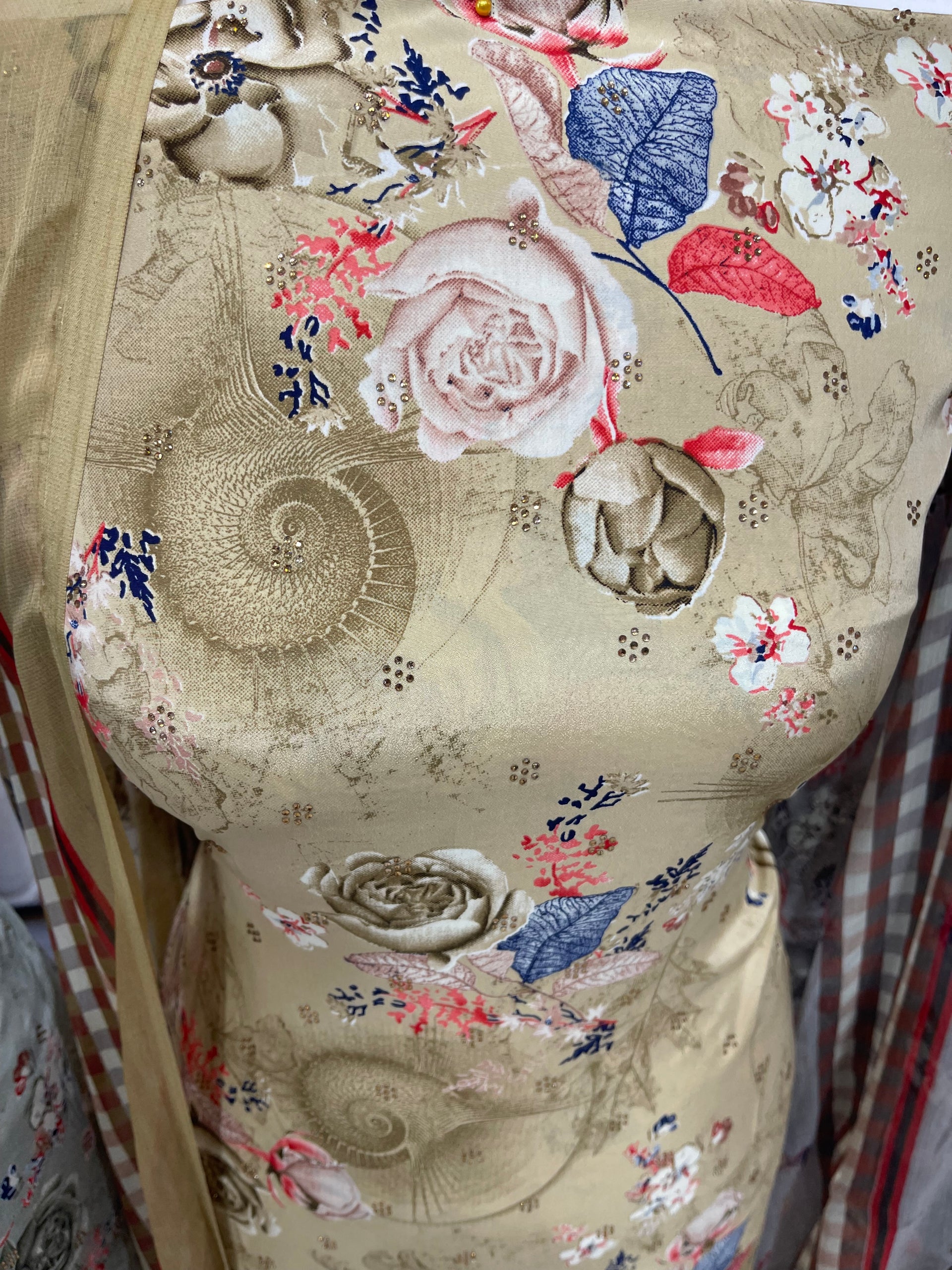 Digital print french crepe with diamonte and sequin embellishments on kameez border, comes with printed bottoms and crepe dupatta.