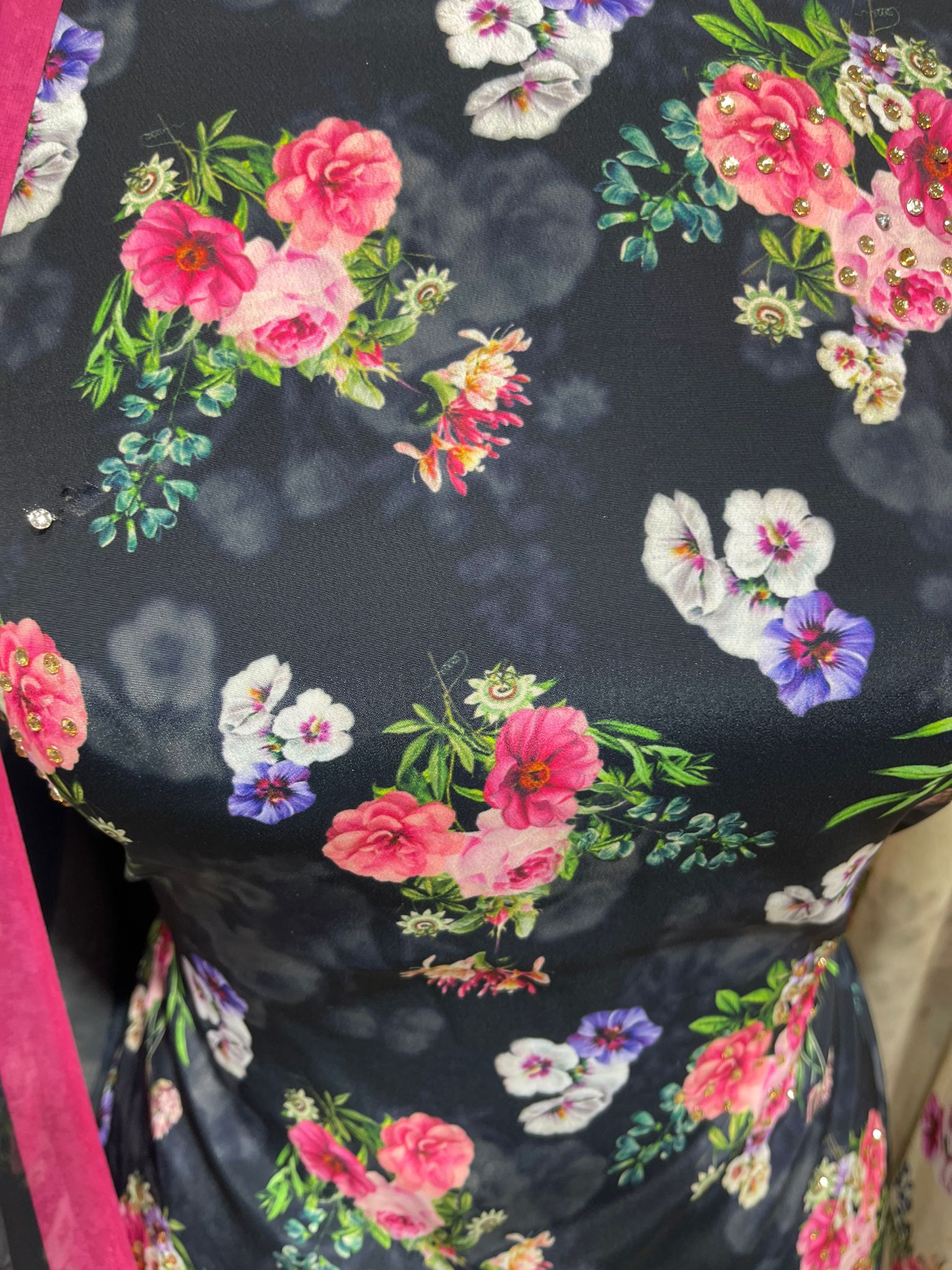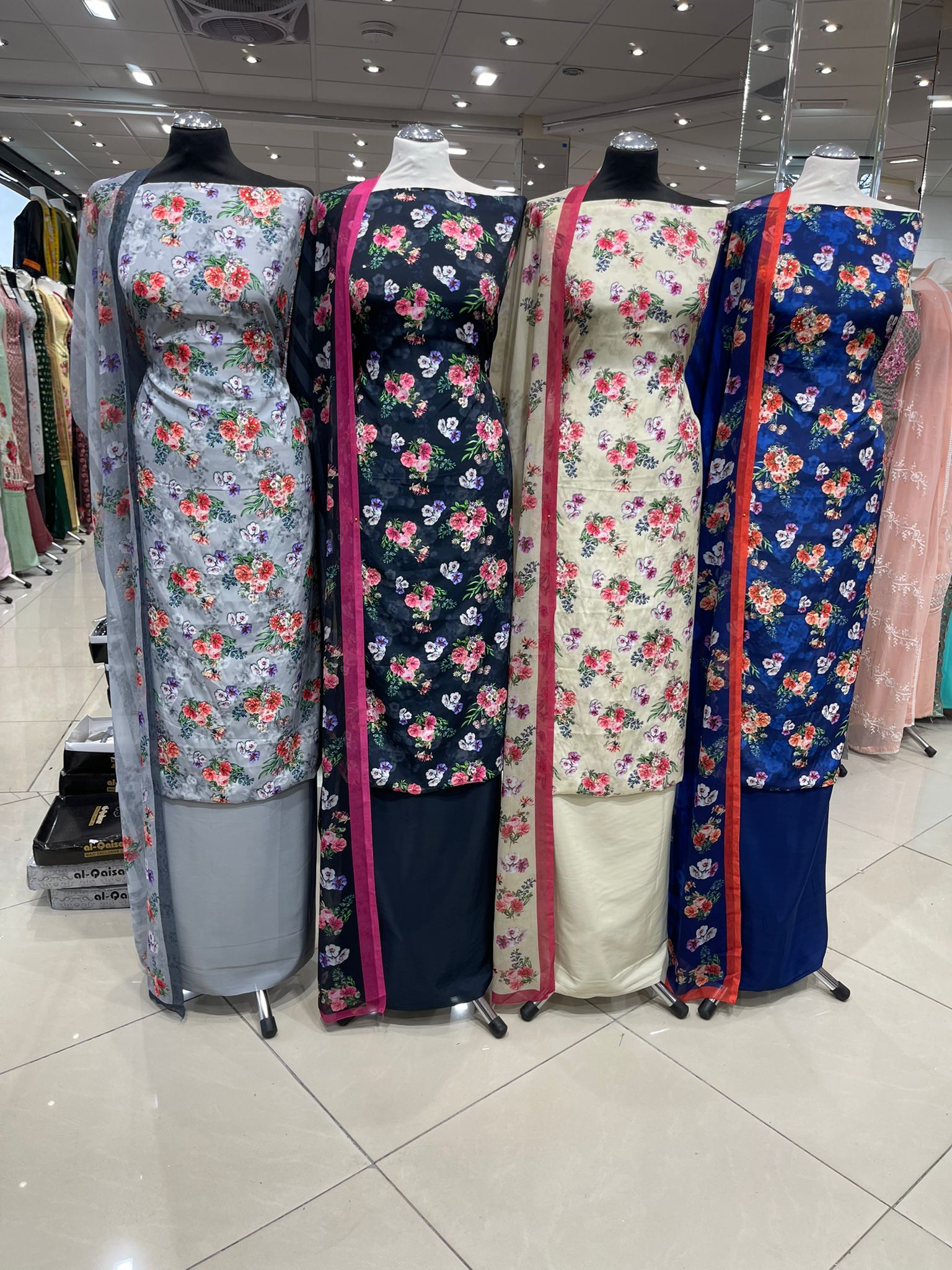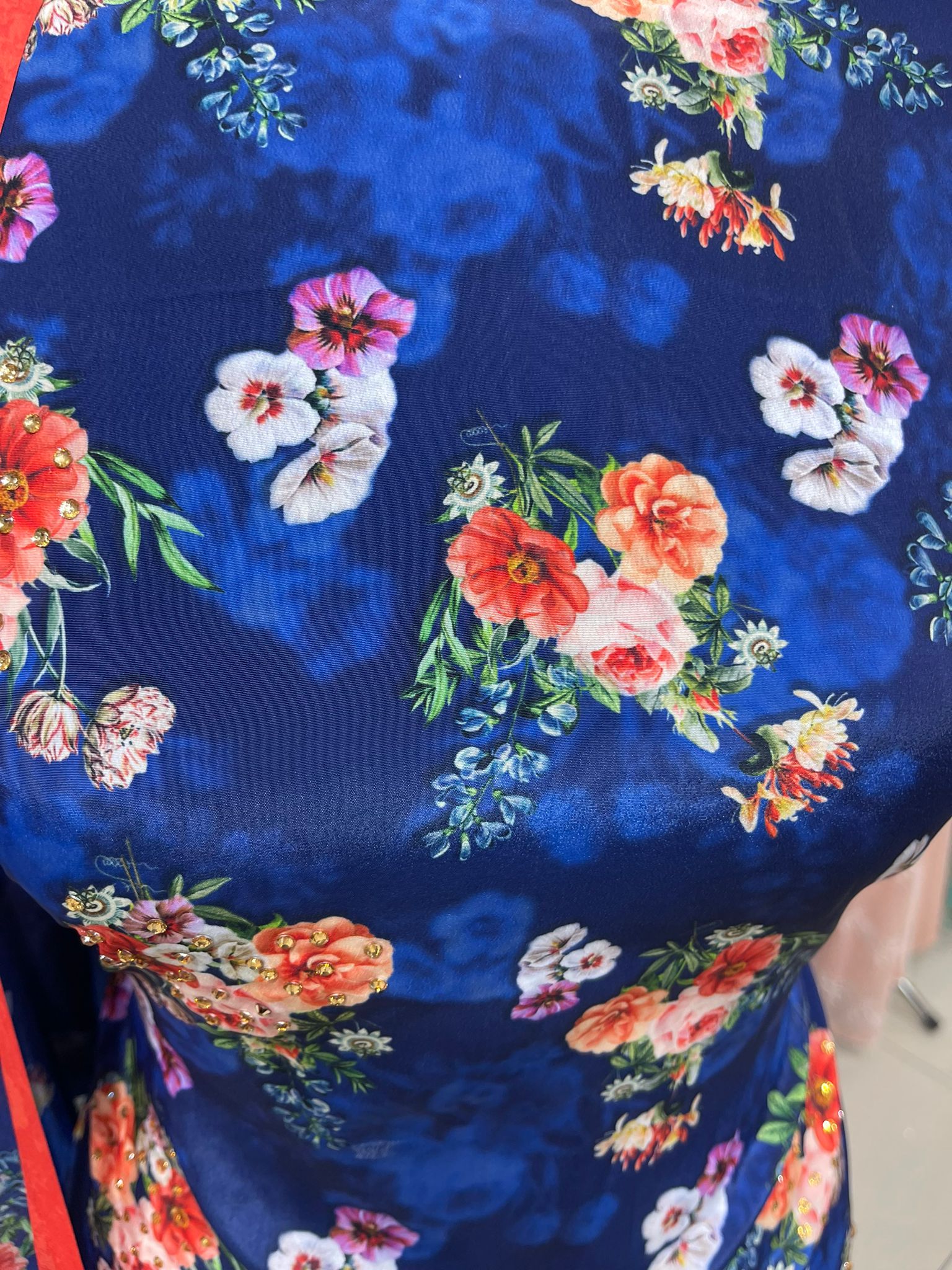 Italian french crepe fabric with a soft touch, front and back digital print embellished with diamontes, comes with printed crepe dupatta and matching plain bottoms.