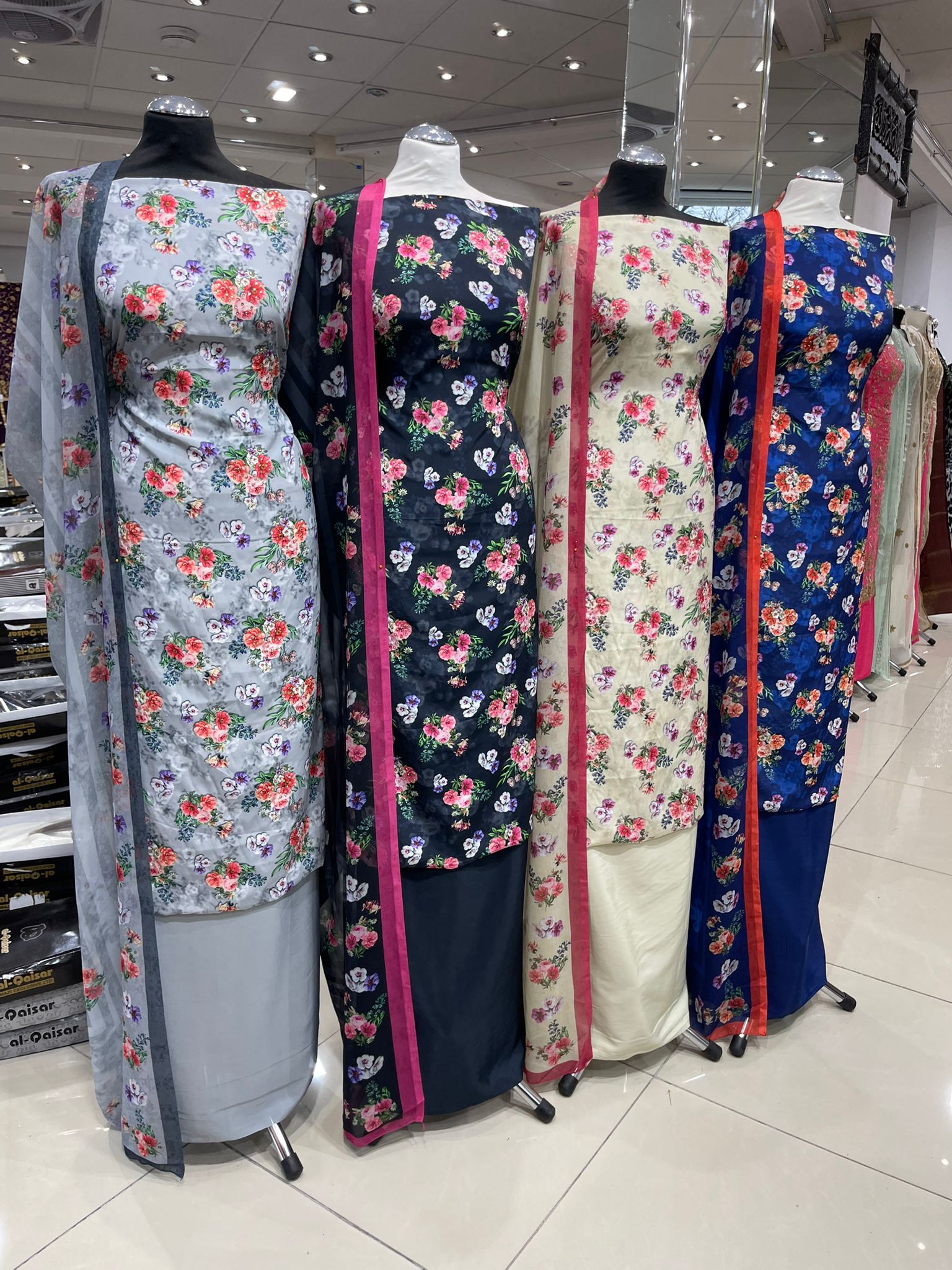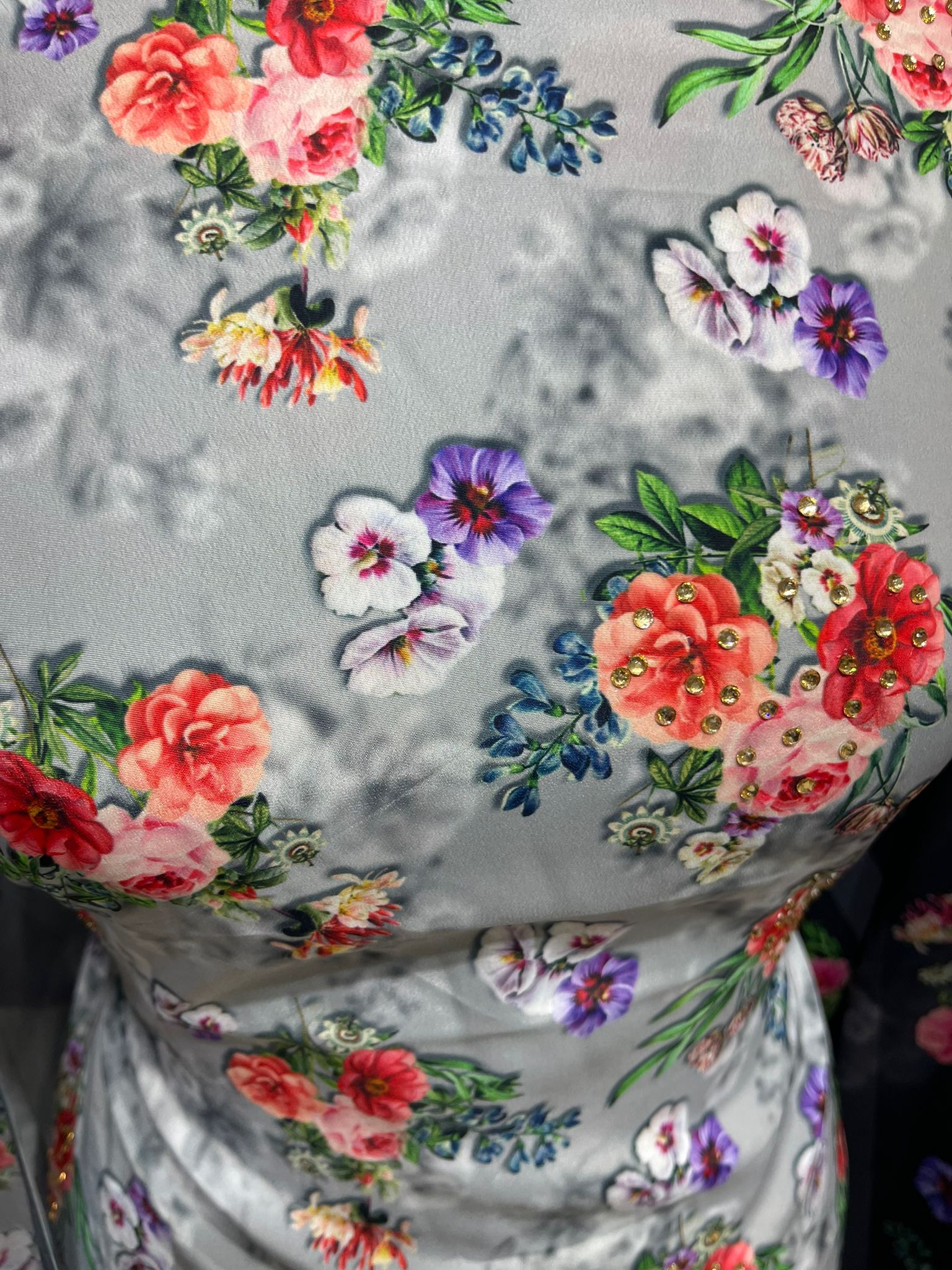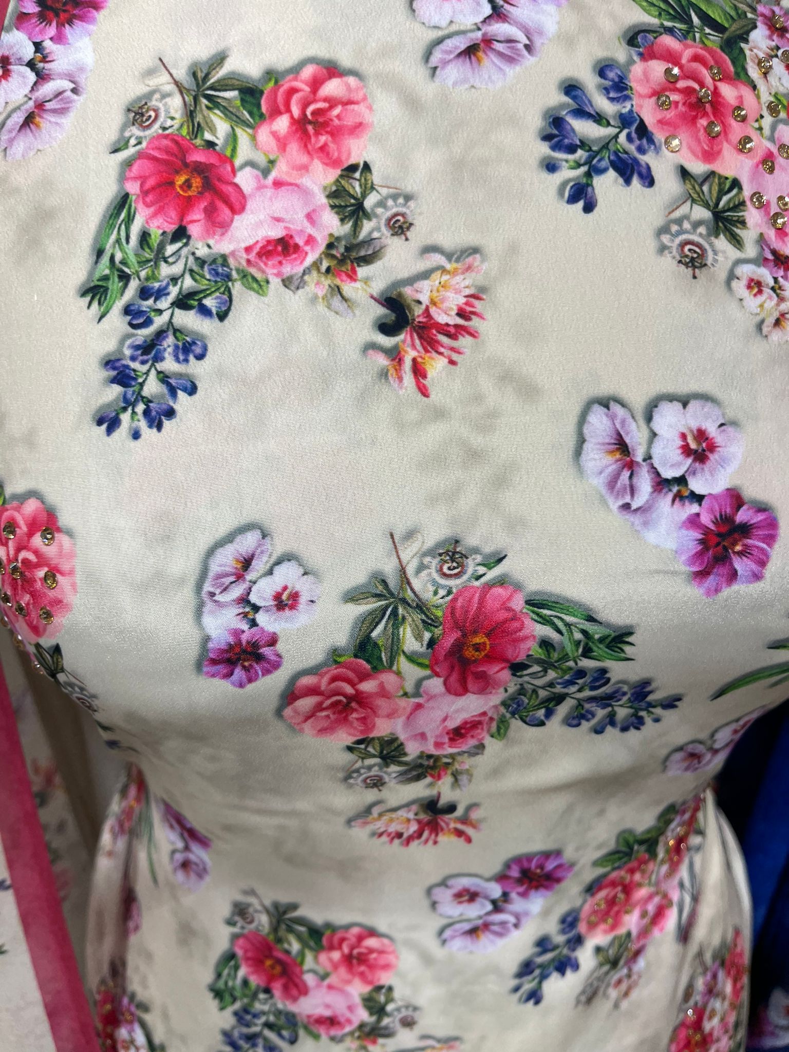 Italian french crepe fabric with a soft touch, front and back digital print embellished with diamontes, comes with printed crepe dupatta and matching plain bottoms.