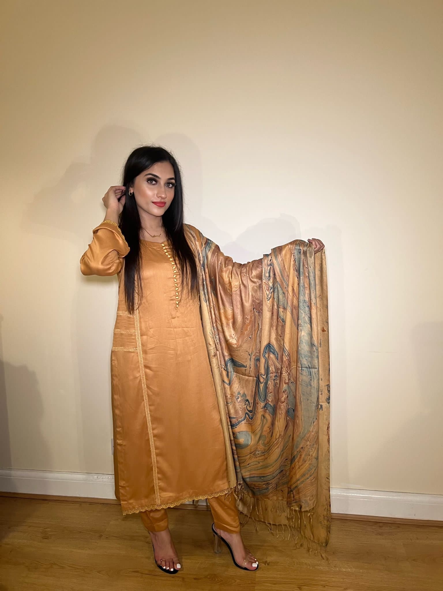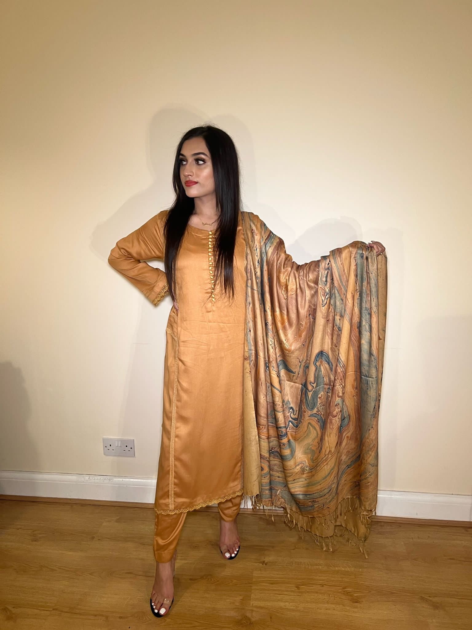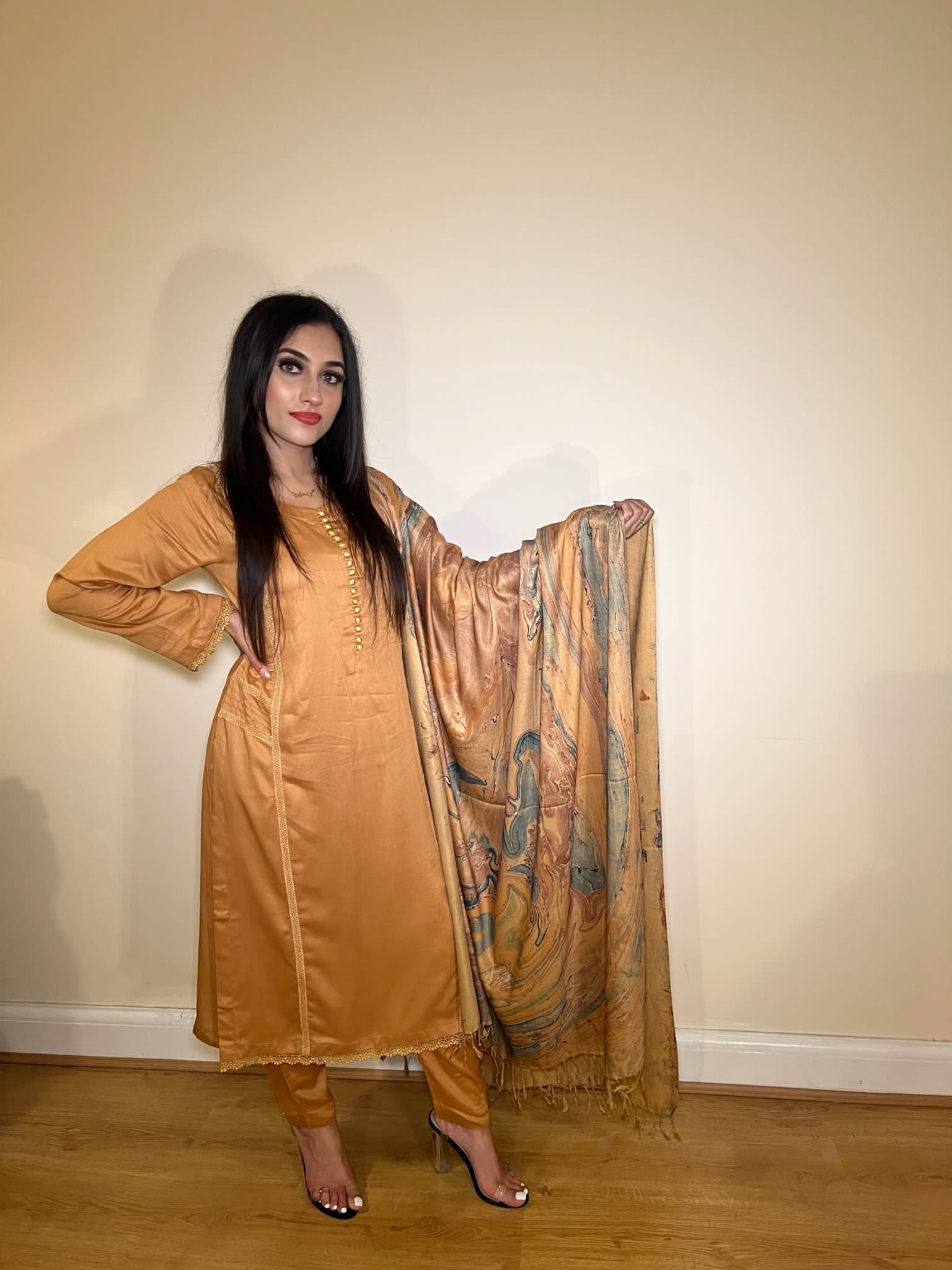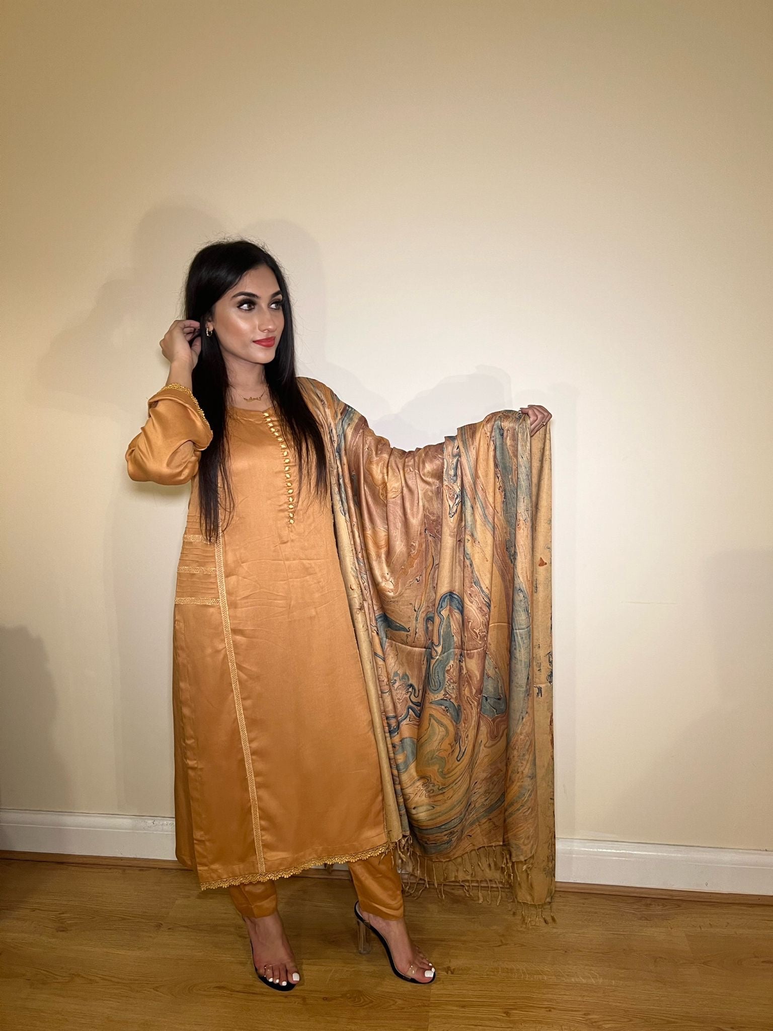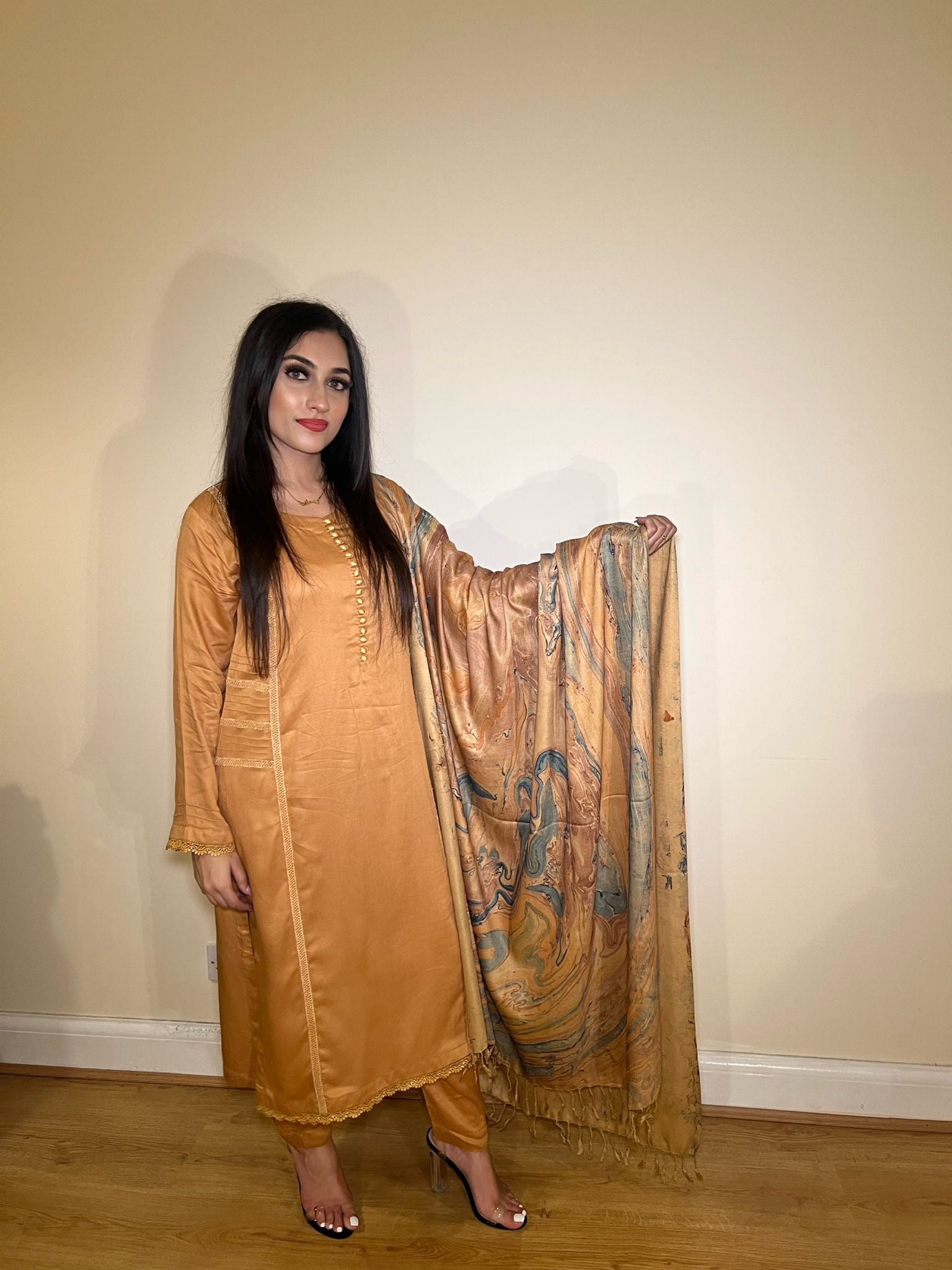 Ready to wear, dhanak winter fabric with embroidery, comes with pashmina shawl. Cosy and comfortable everyday wear.