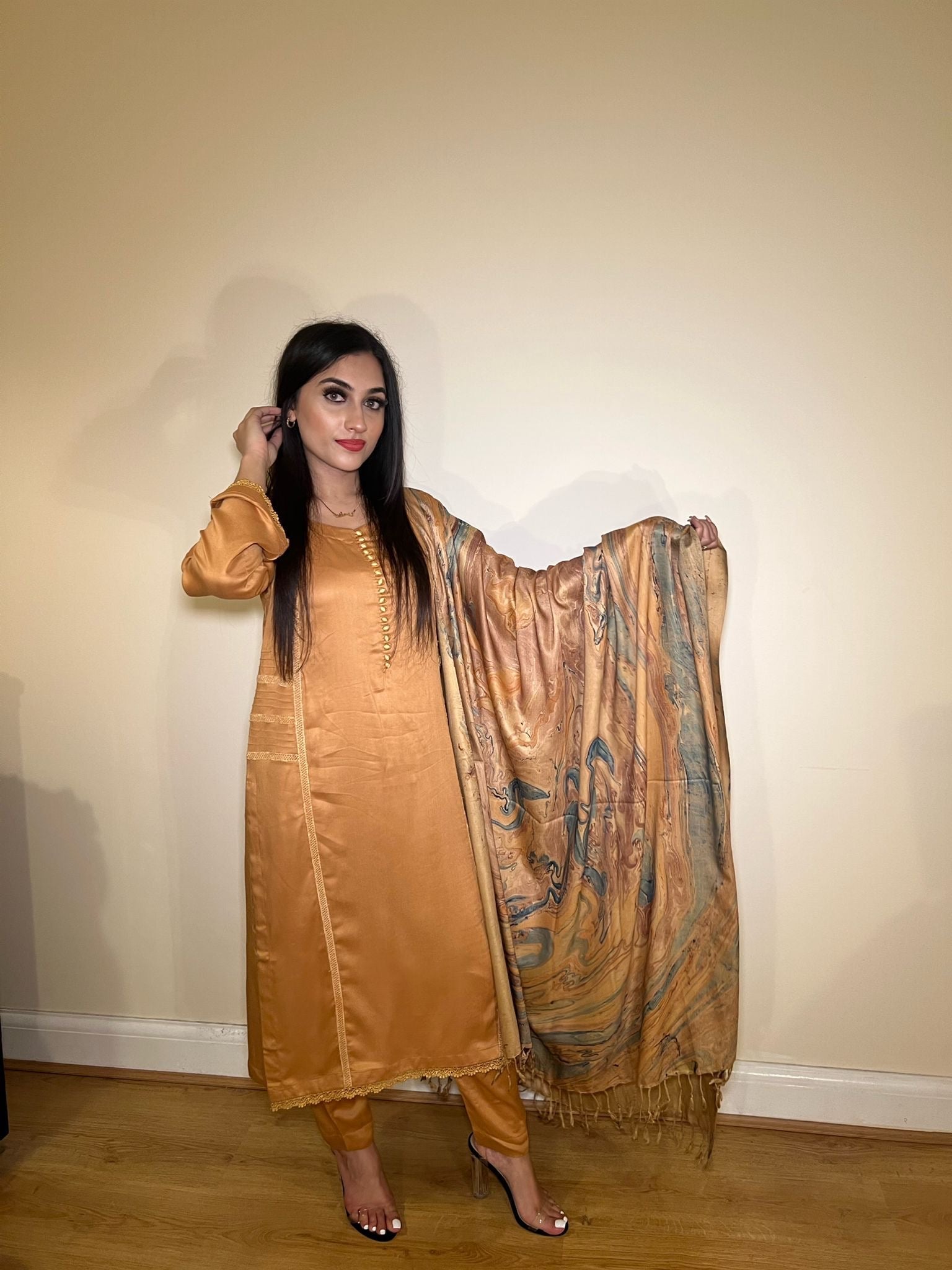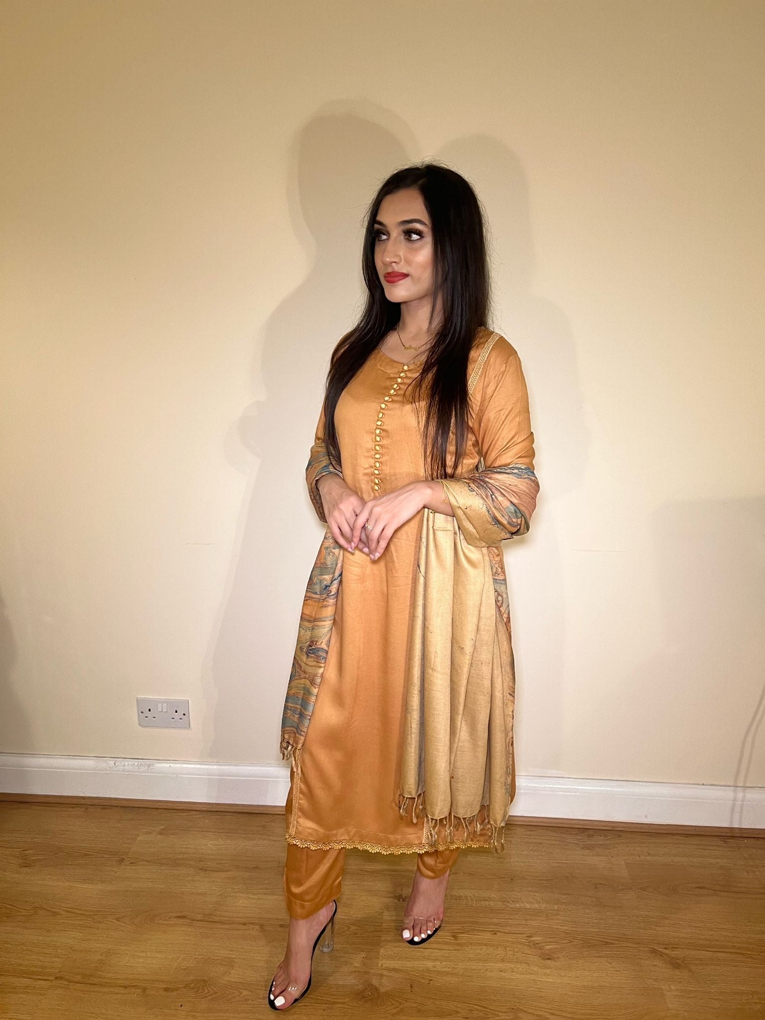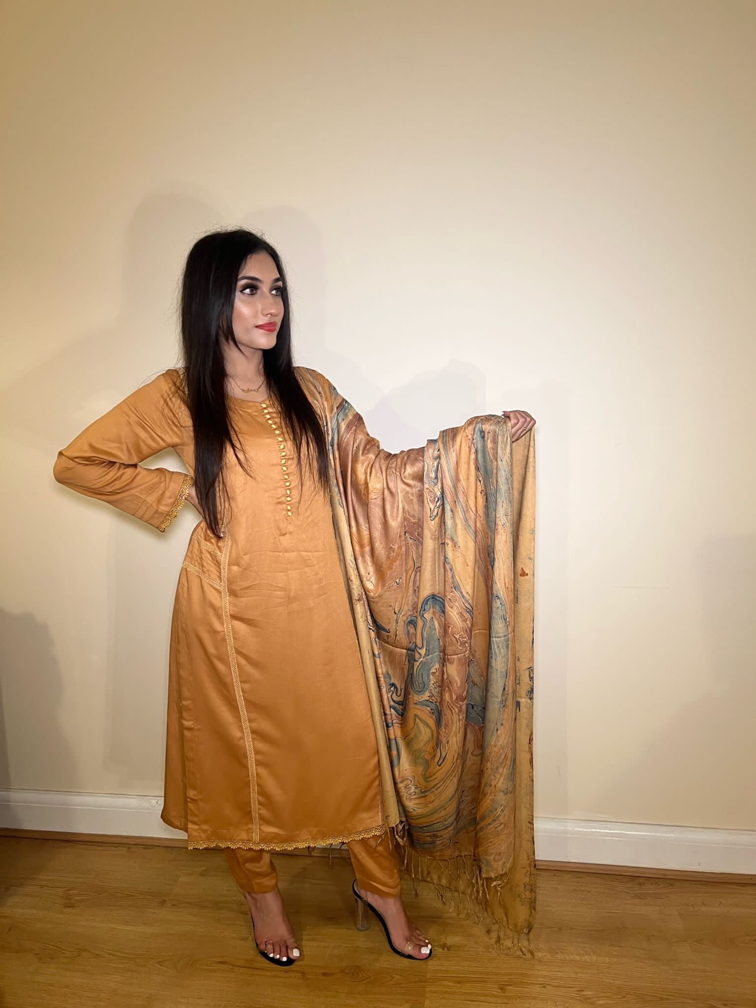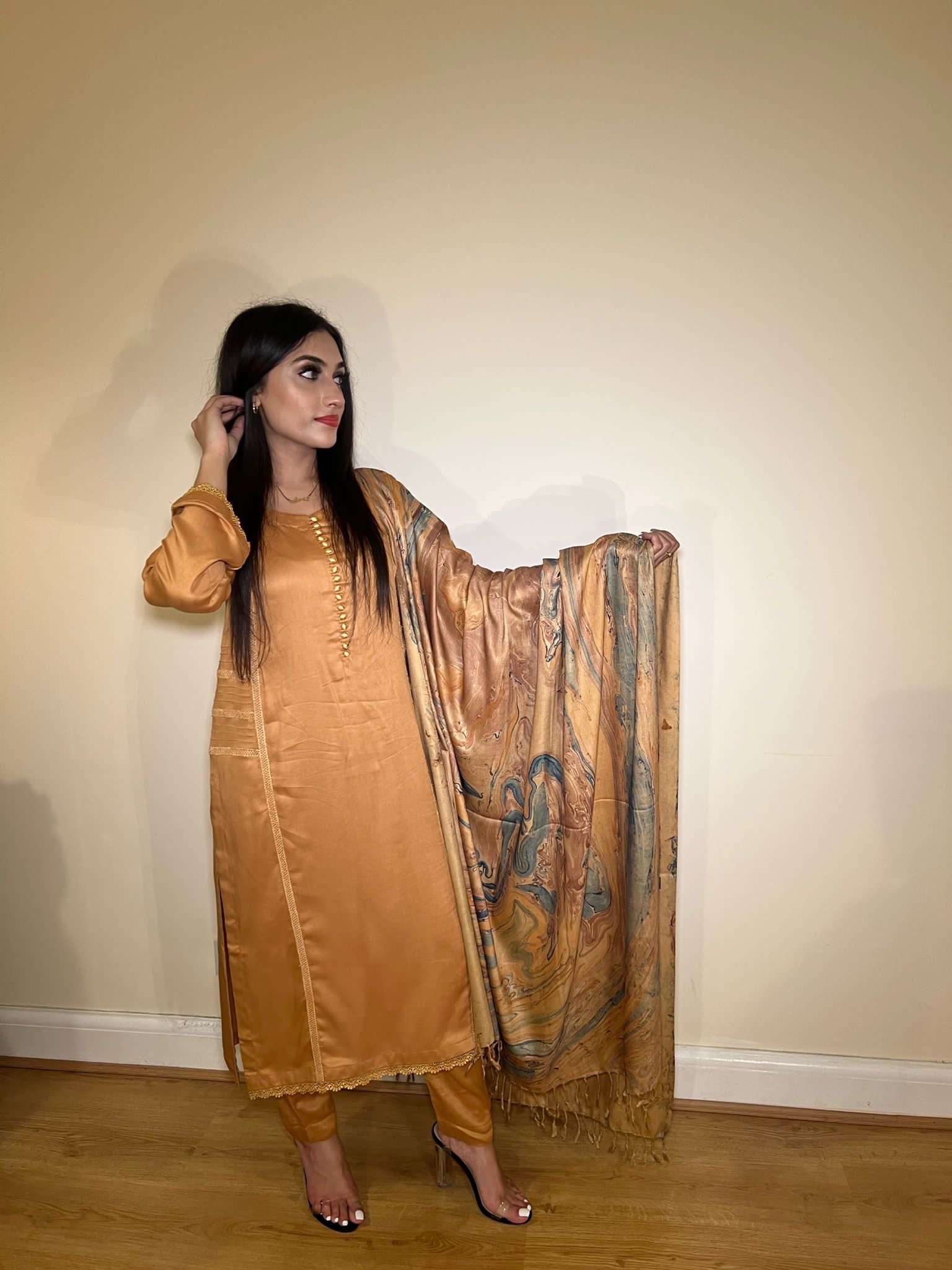 Ready to wear, dhanak winter fabric with embroidery, comes with pashmina shawl. Cosy and comfortable everyday wear.
