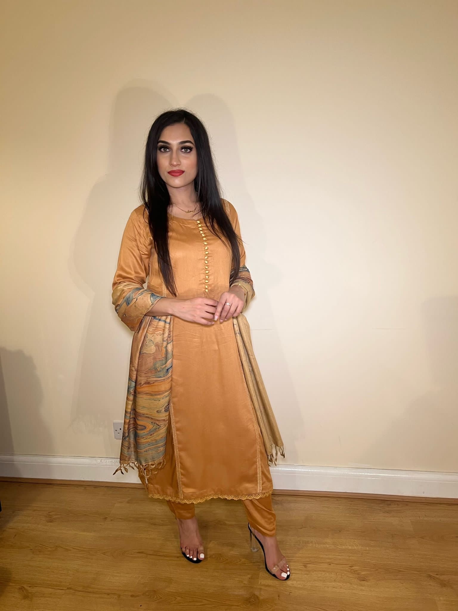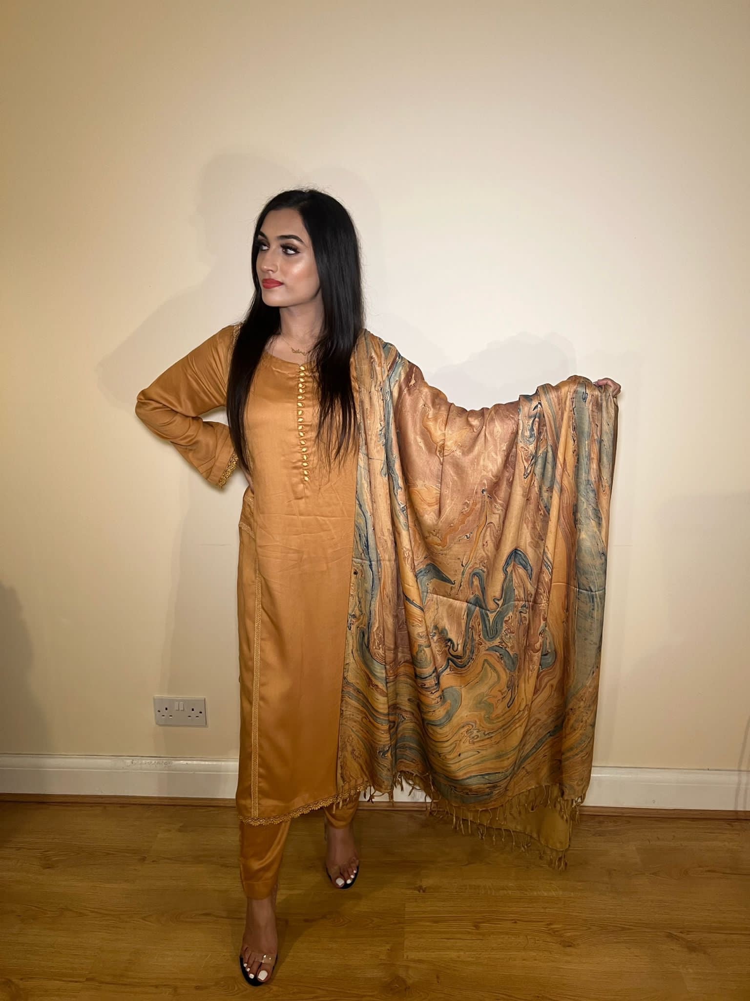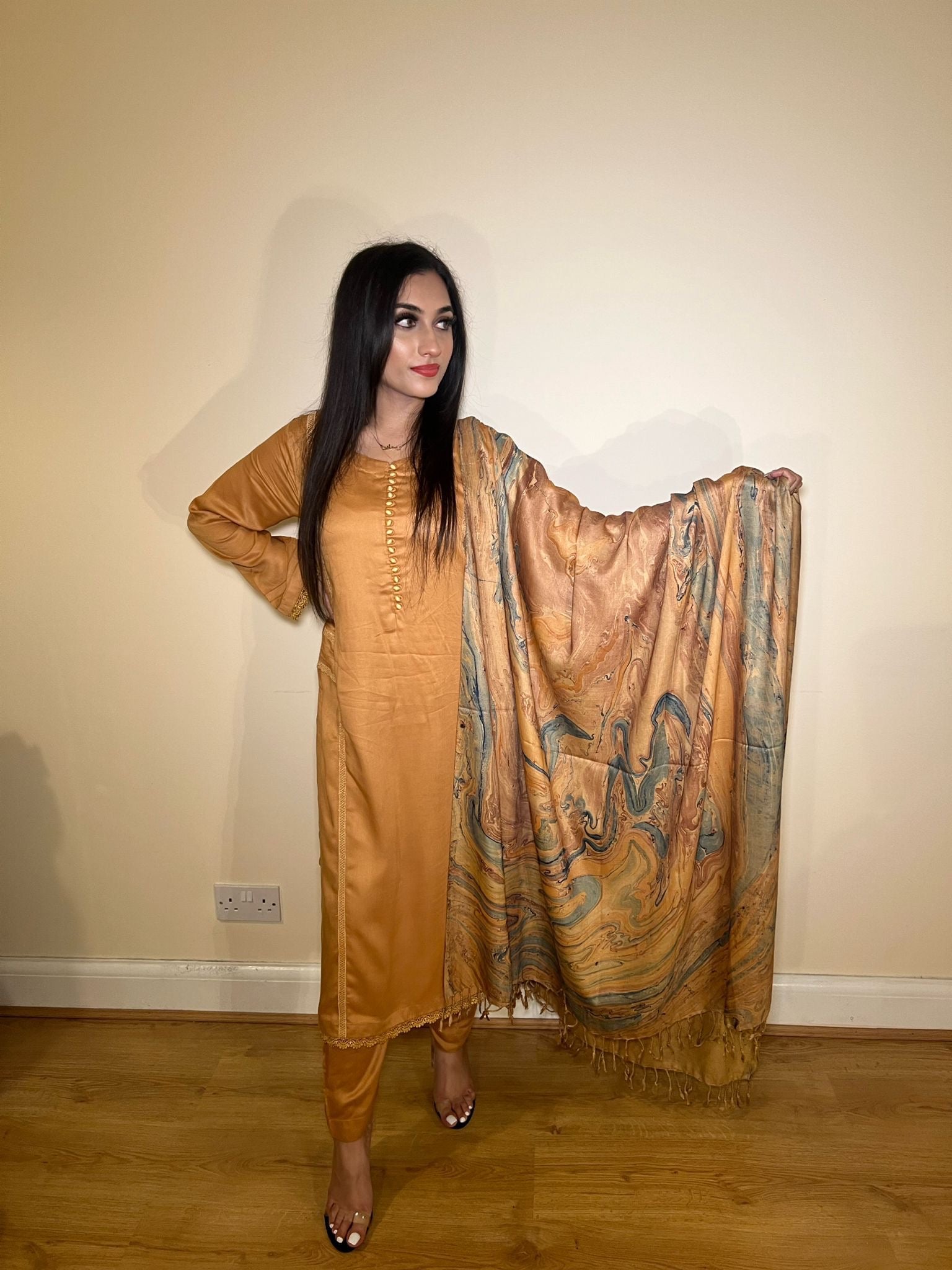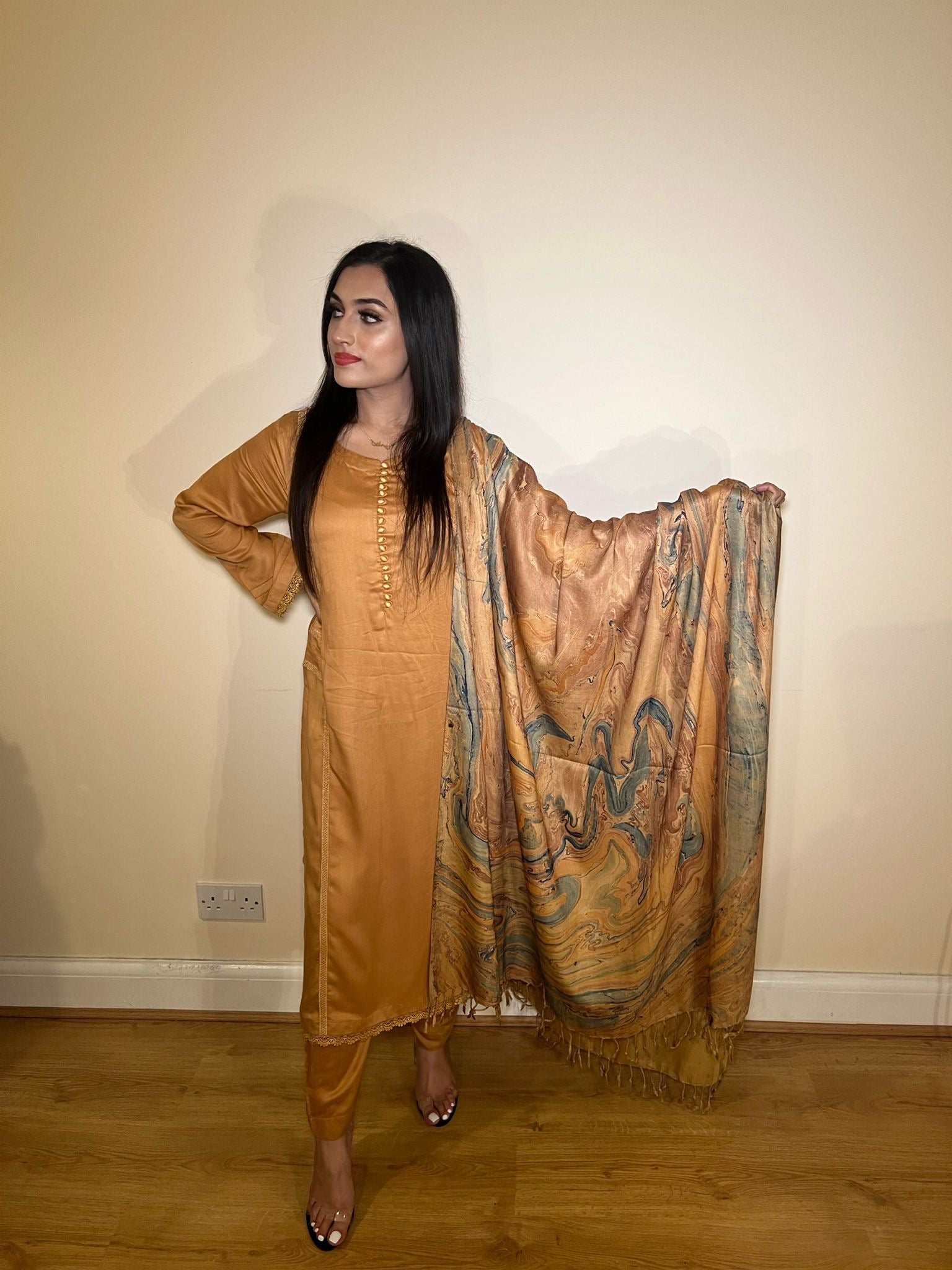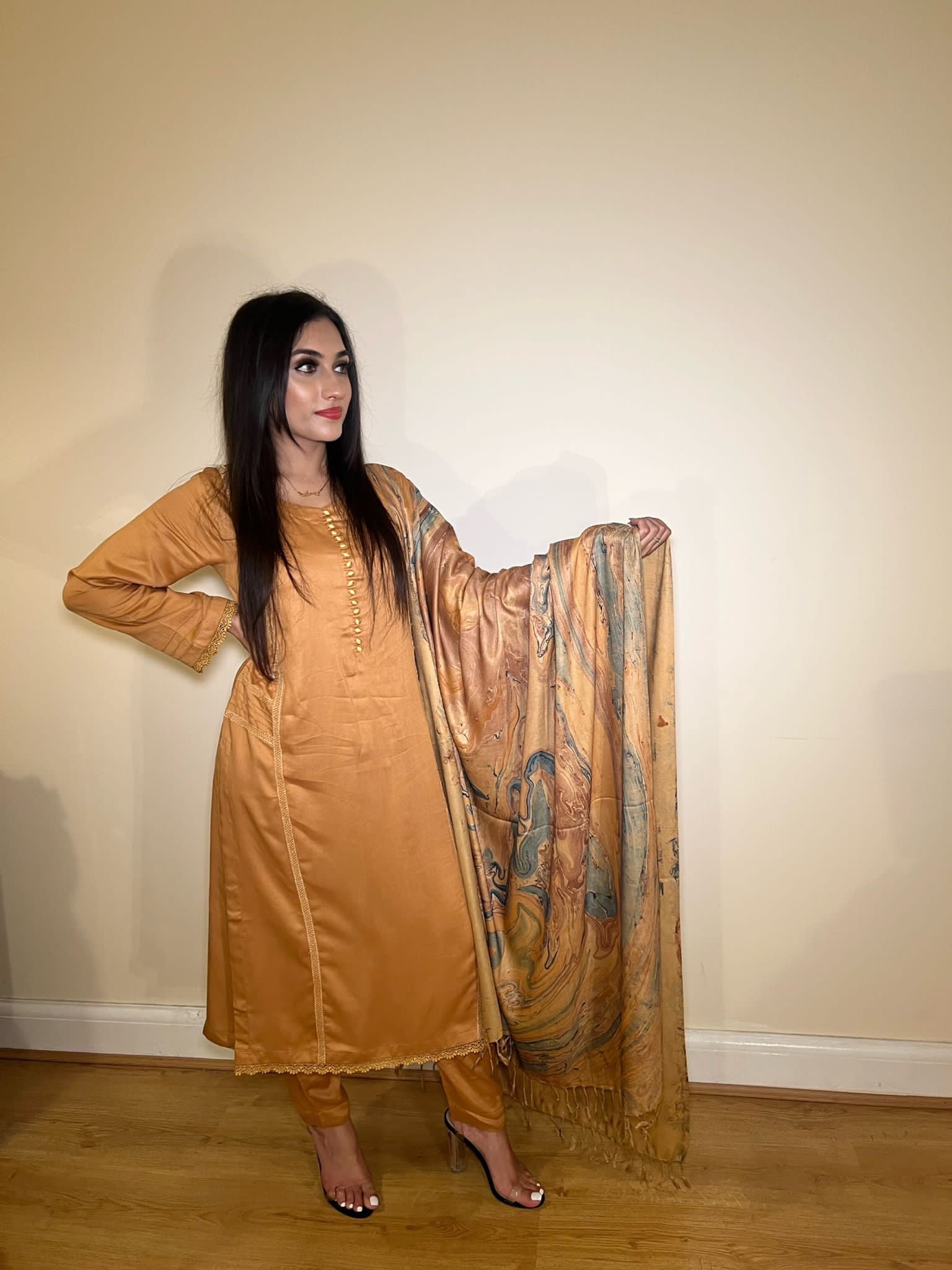 Ready to wear, dhanak winter fabric with embroidery, comes with pashmina shawl. Cosy and comfortable everyday wear.