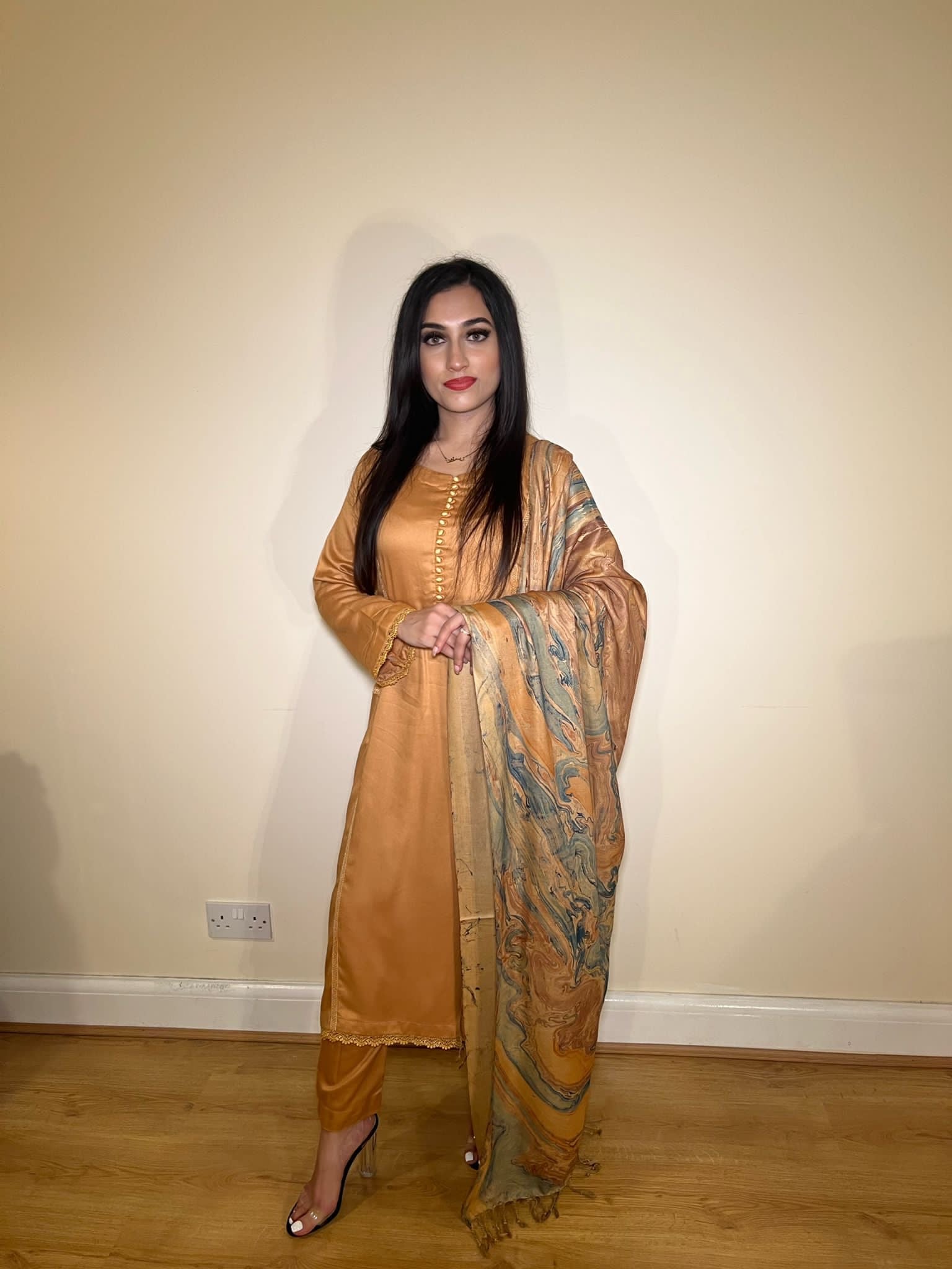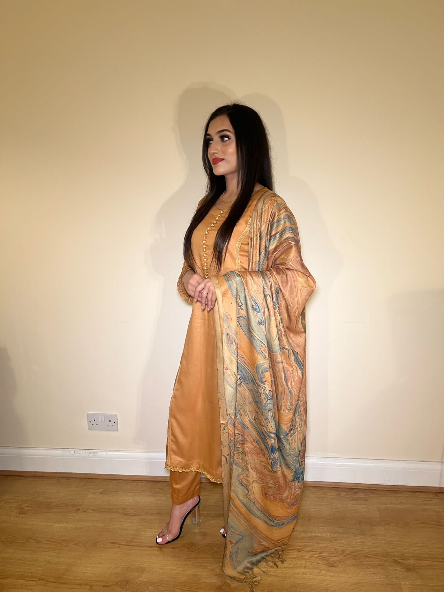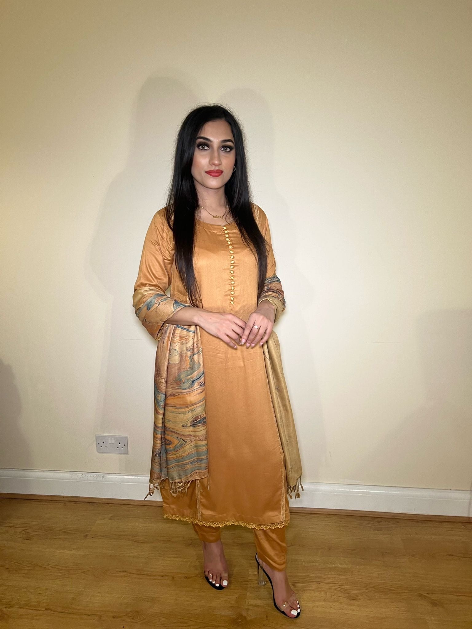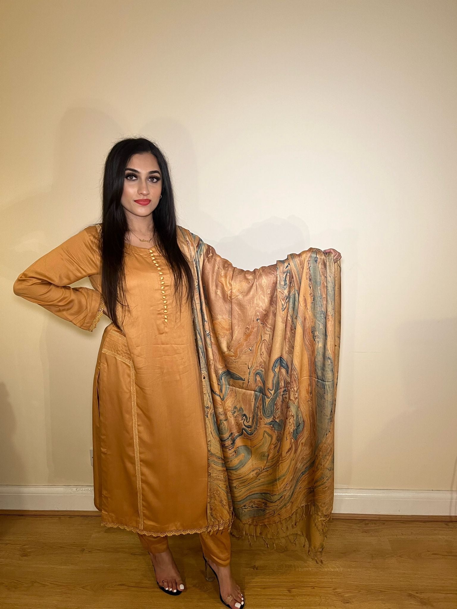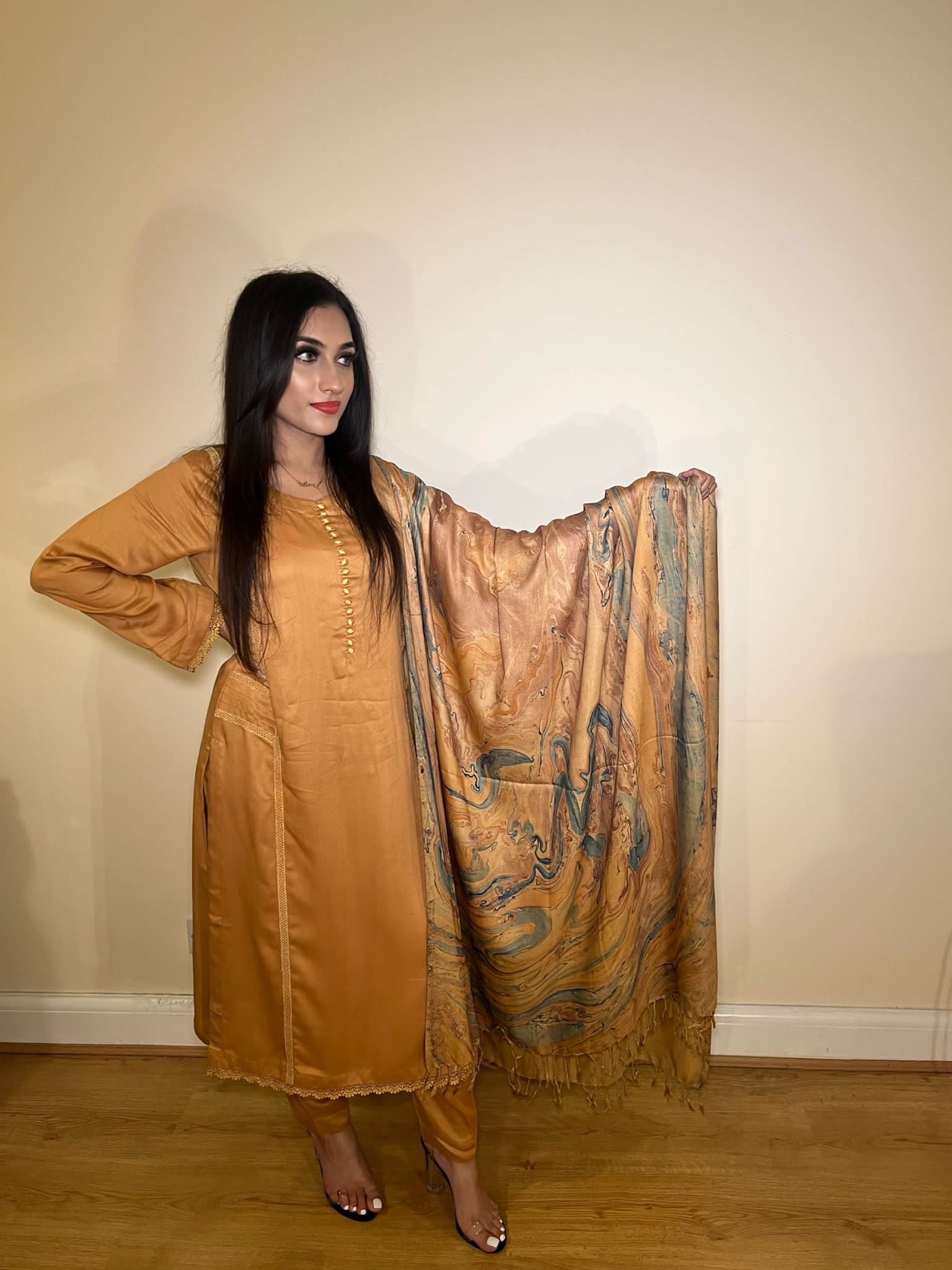 Ready to wear, dhanak winter fabric with embroidery, comes with pashmina shawl. Cosy and comfortable everyday wear.