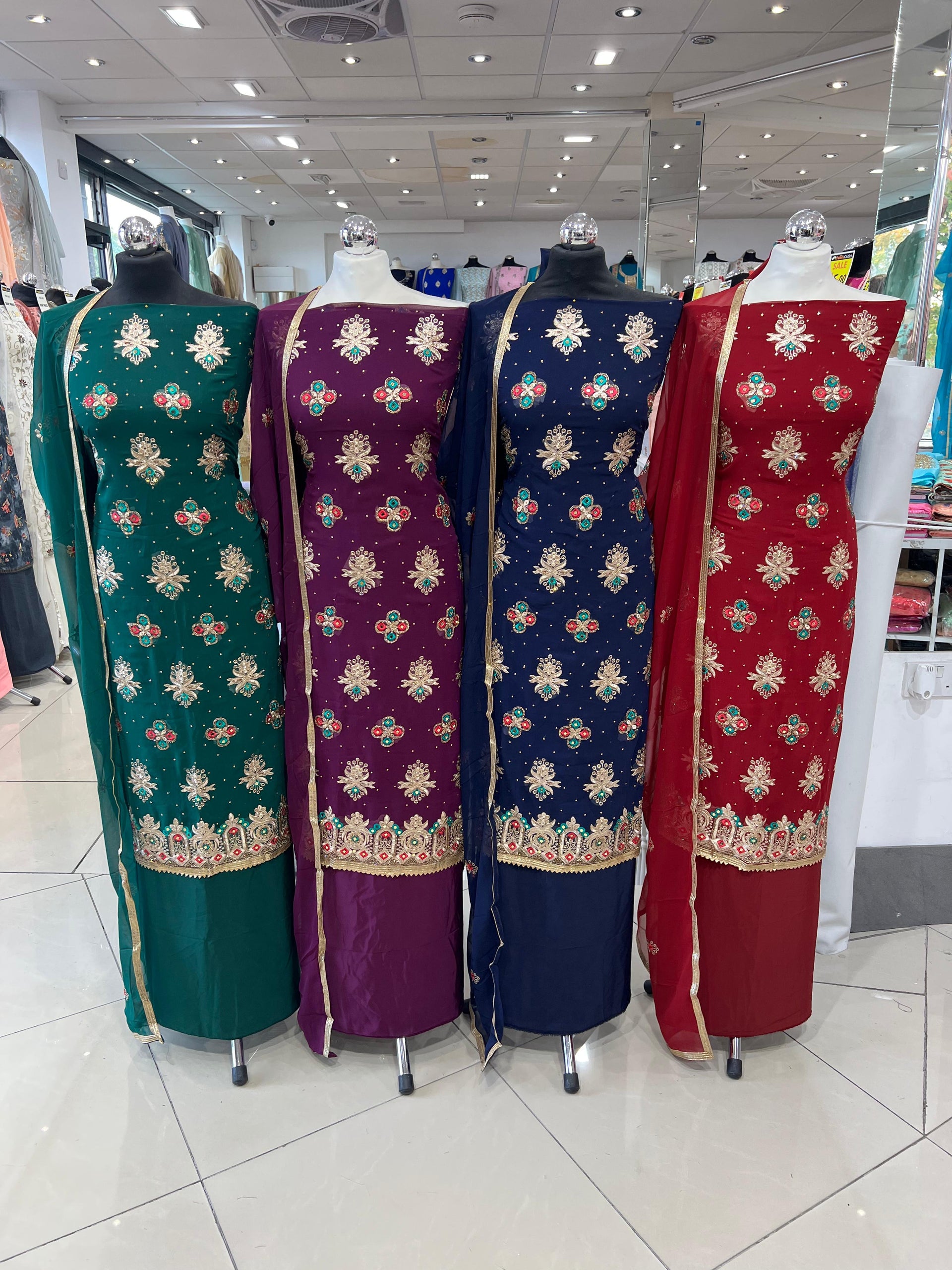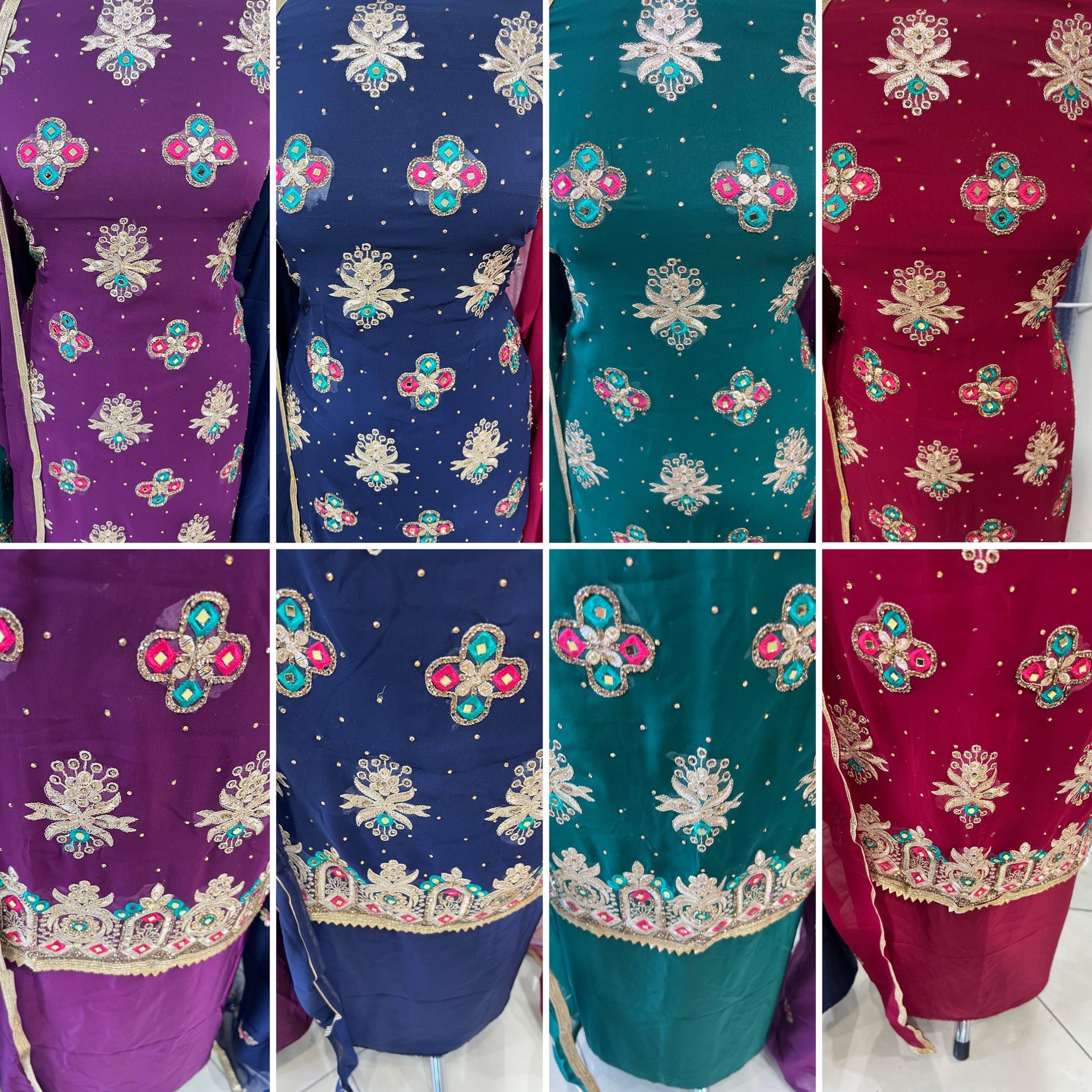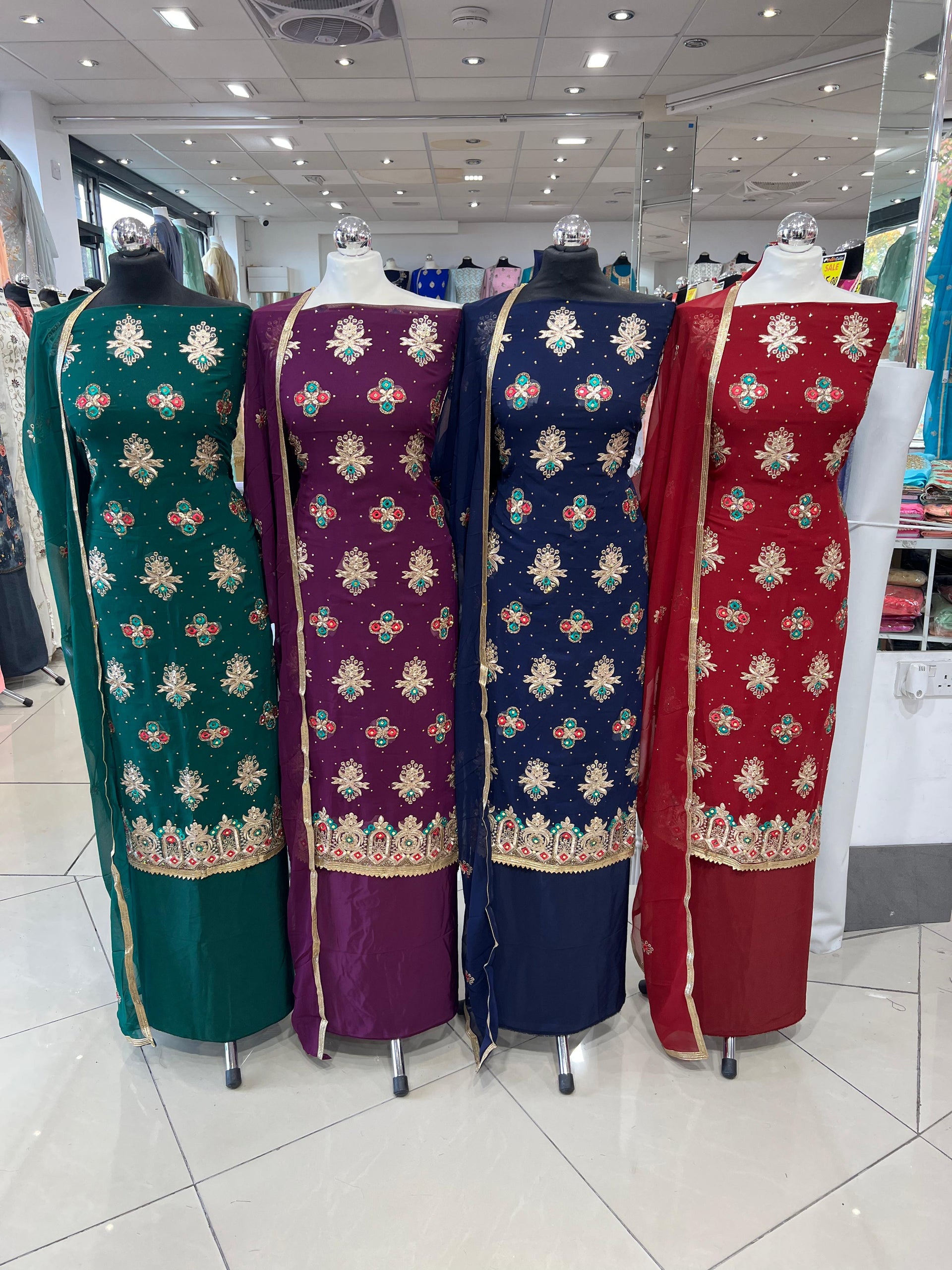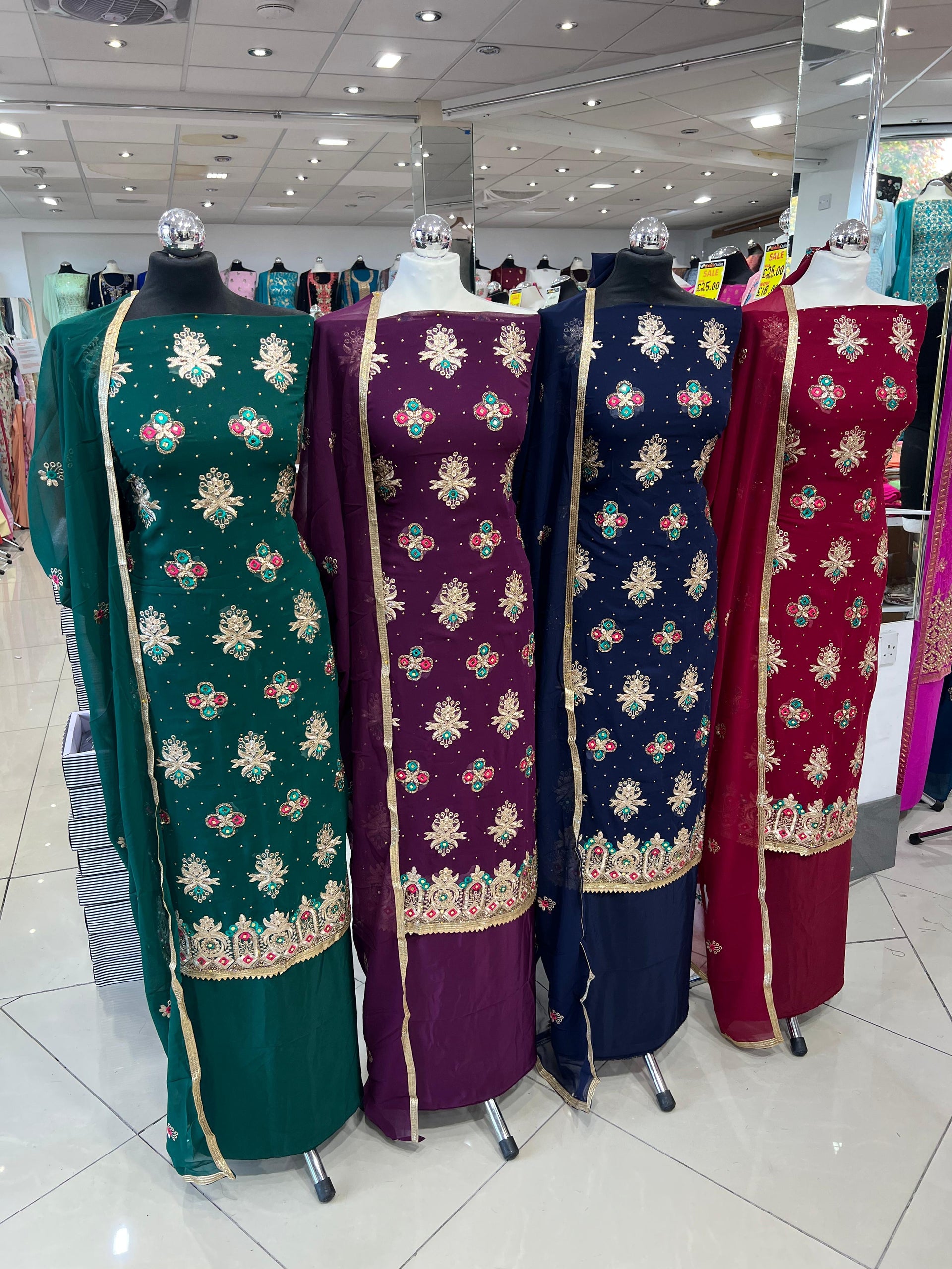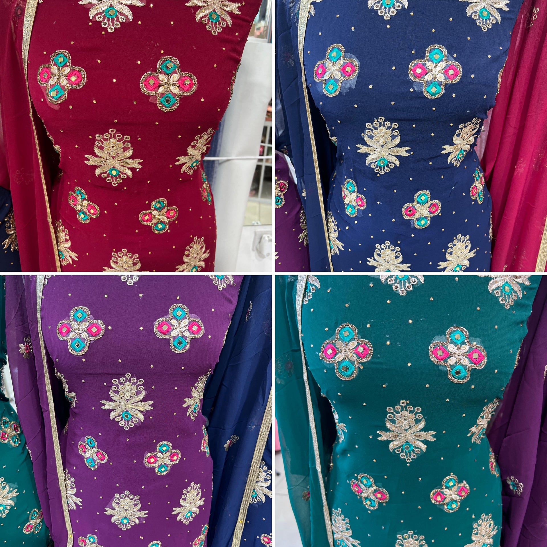 Discover elegance with our stunning collection of three different coloured Suits, each crafted from high-quality georgette fabric. Adorned with intricate thread embroidery and exquisite mirror work, these dresses are perfect for any occasion. Priced at just £23.99, elevate your wardrobe with these stylish pieces that combine comfort and sophistication.