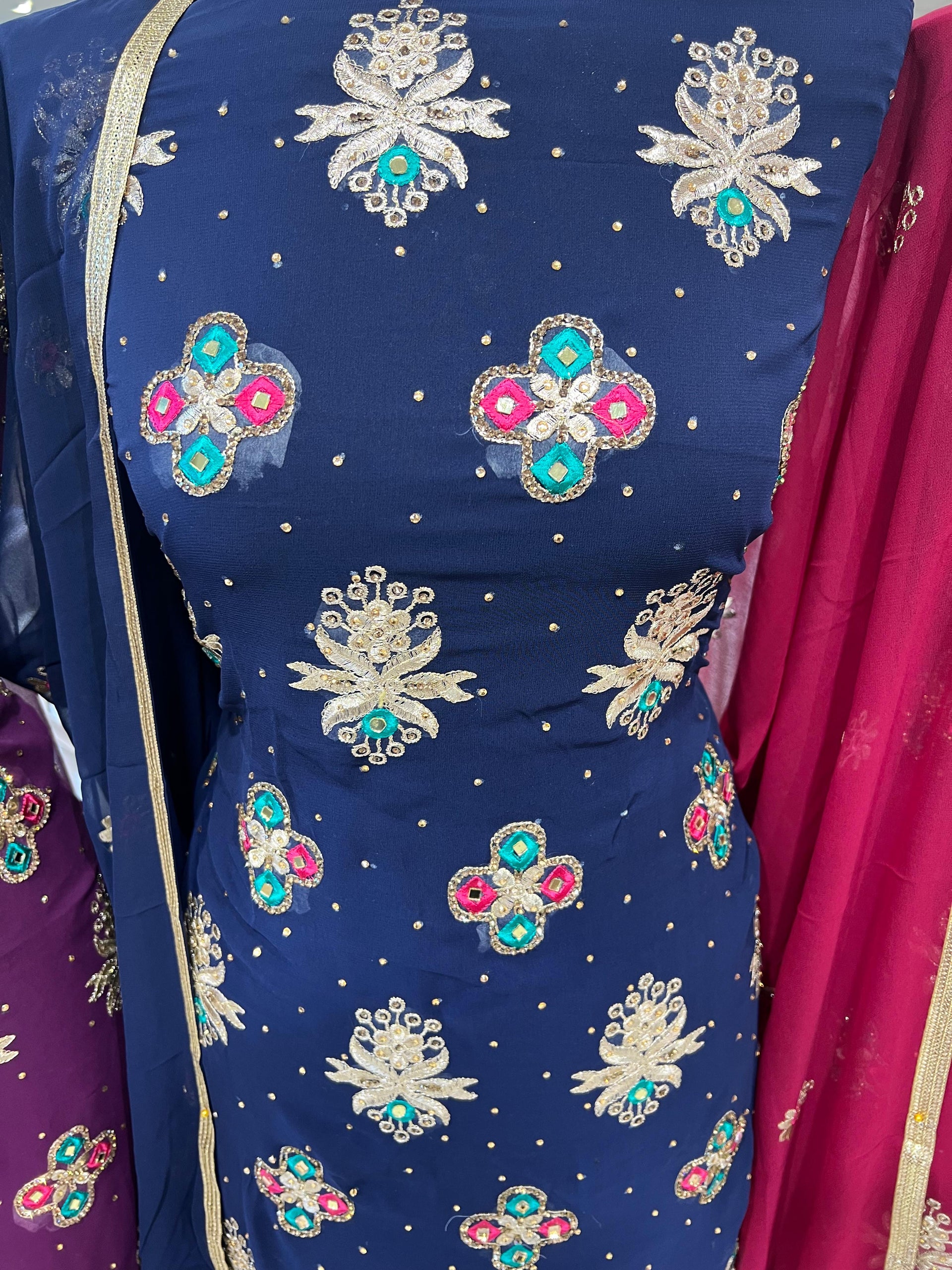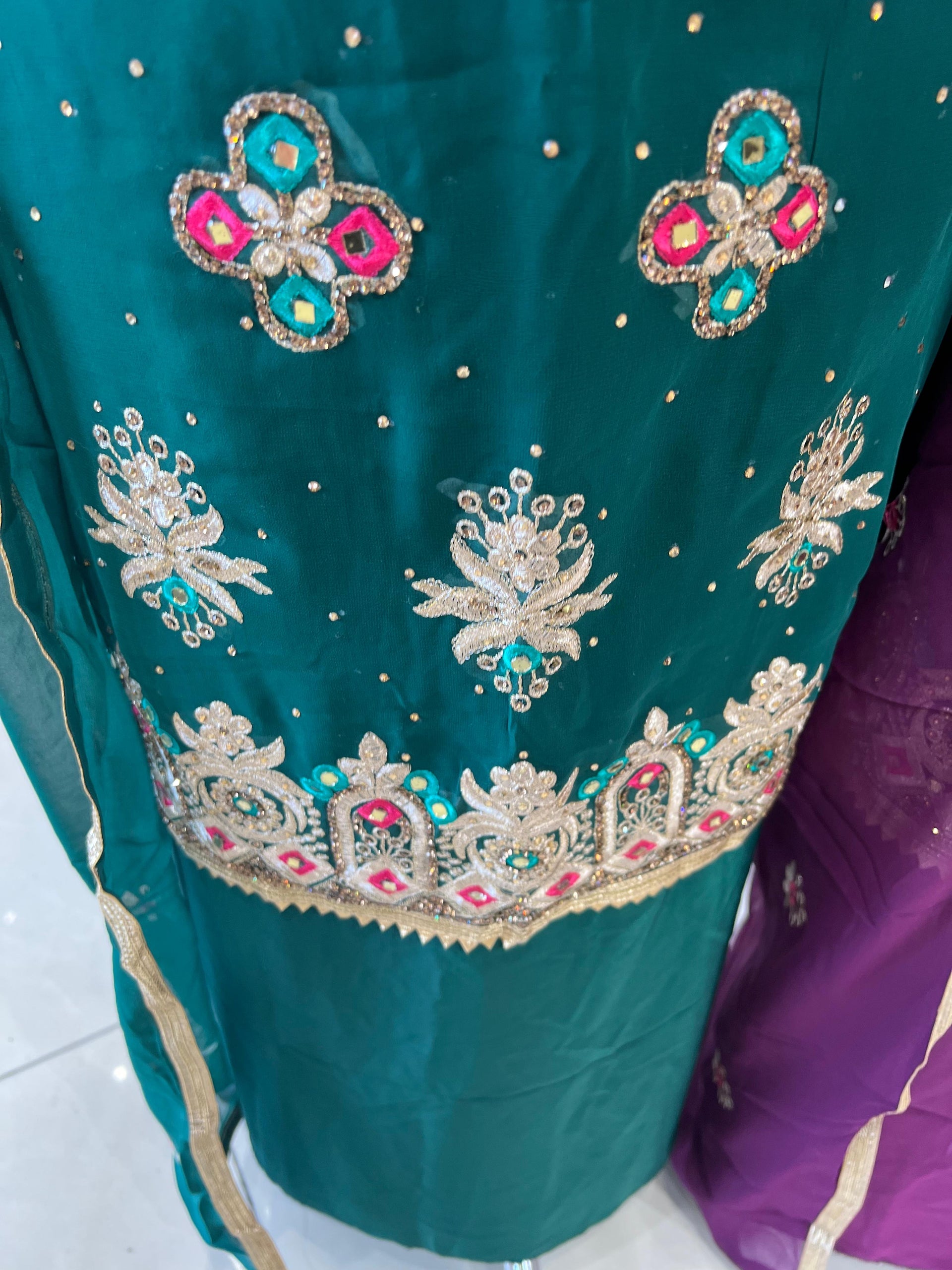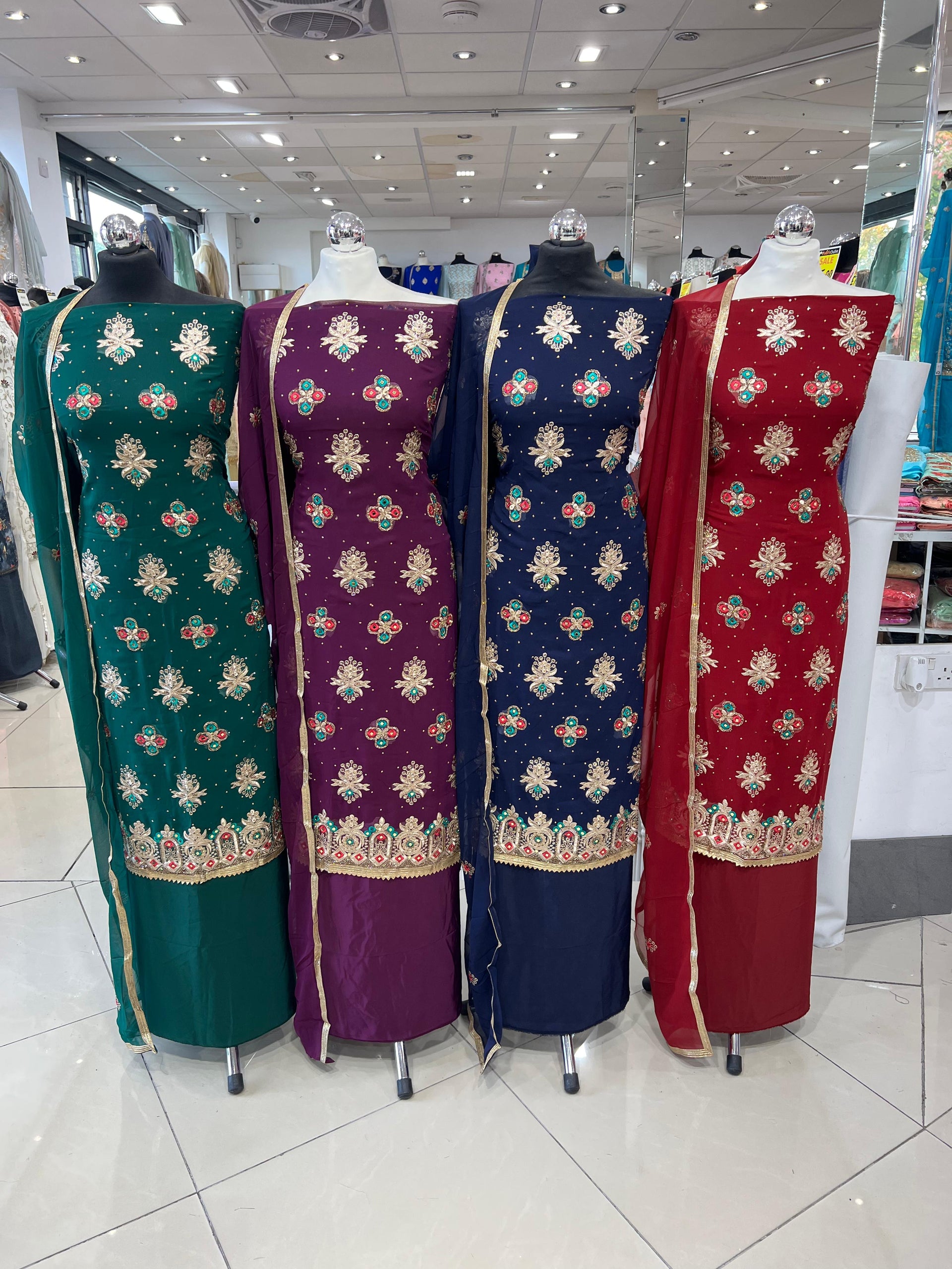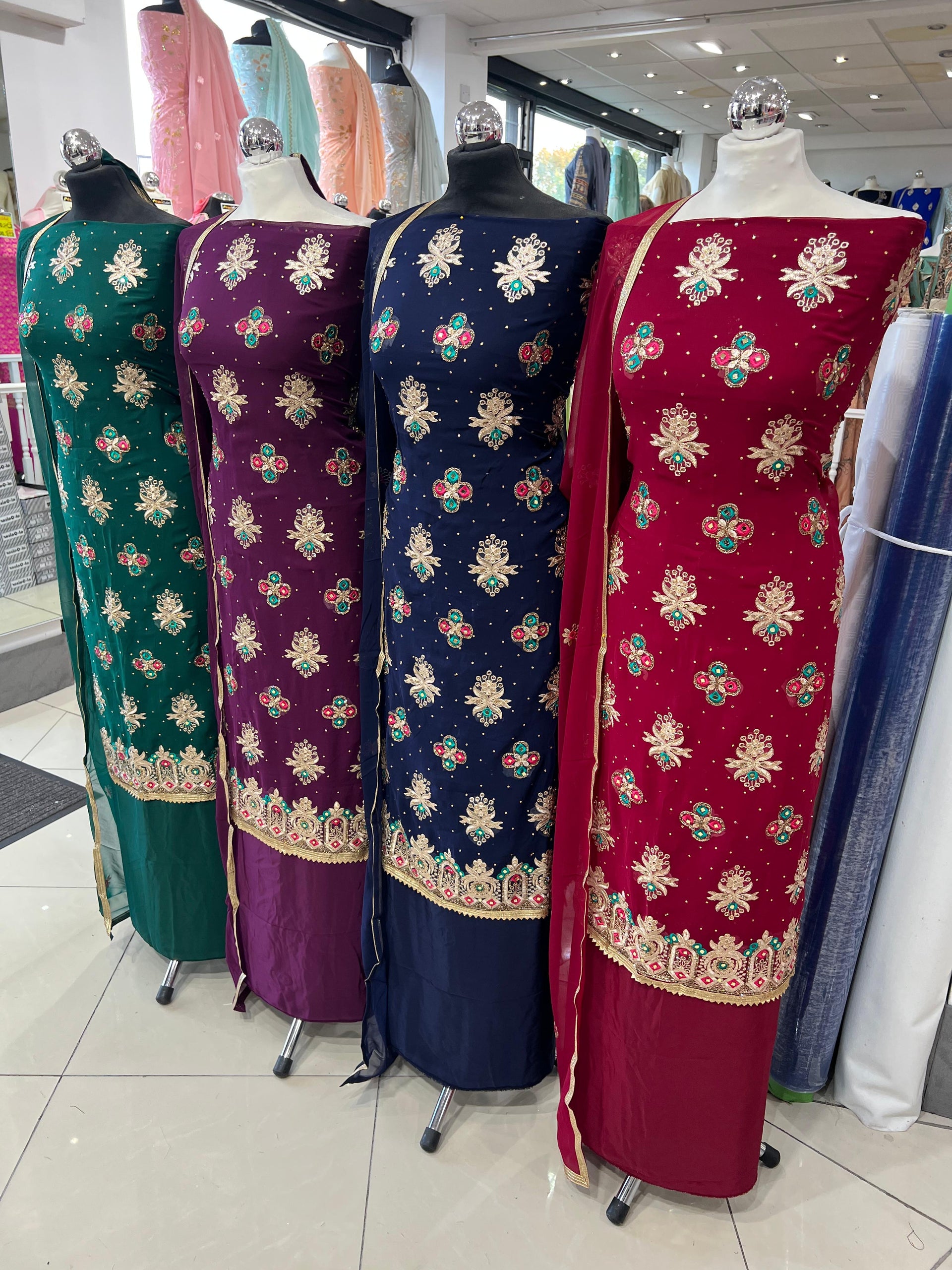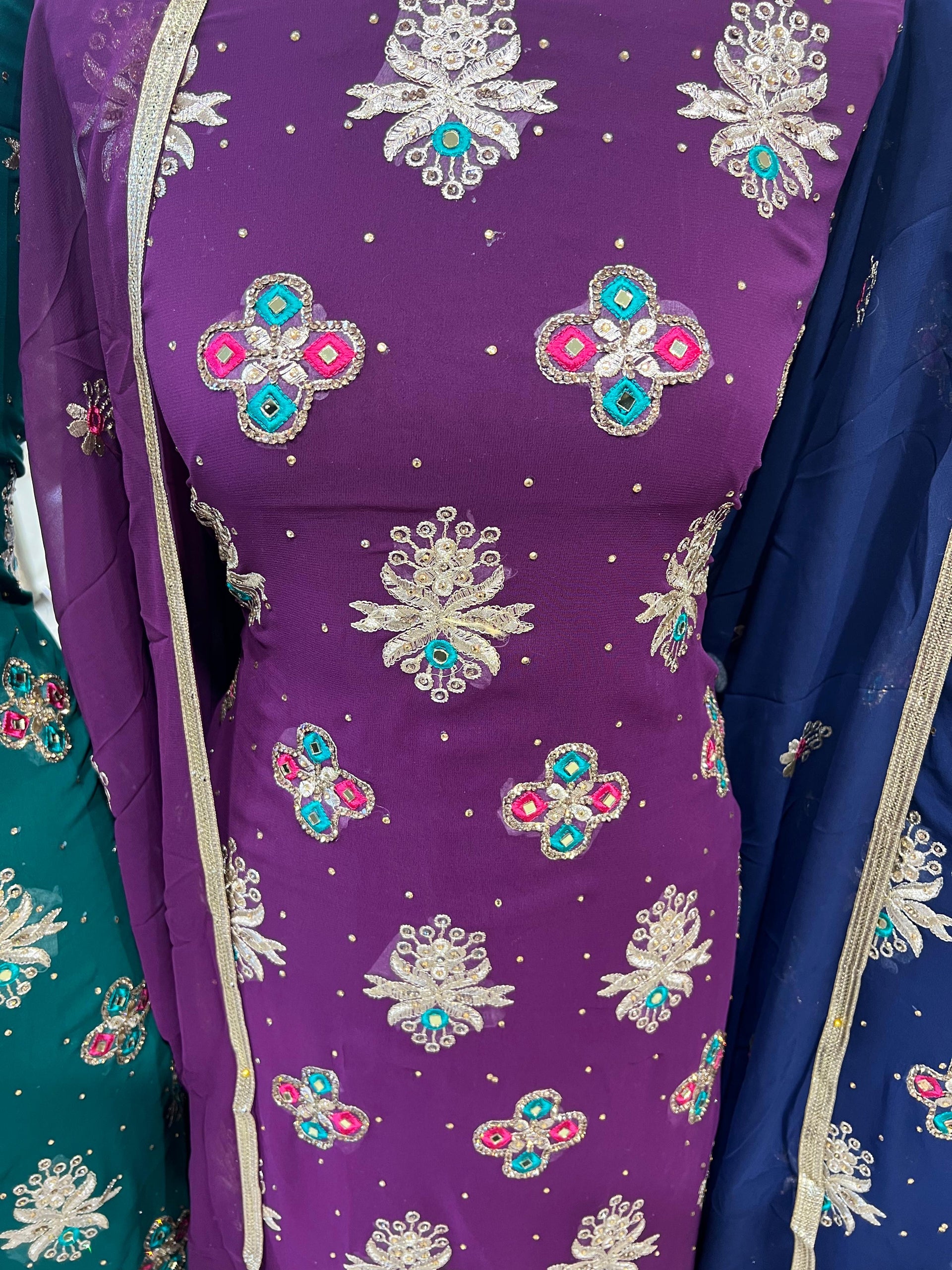 Discover elegance with our stunning collection of three different coloured Suits, each crafted from high-quality georgette fabric. Adorned with intricate thread embroidery and exquisite mirror work, these dresses are perfect for any occasion. Priced at just £23.99, elevate your wardrobe with these stylish pieces that combine comfort and sophistication.