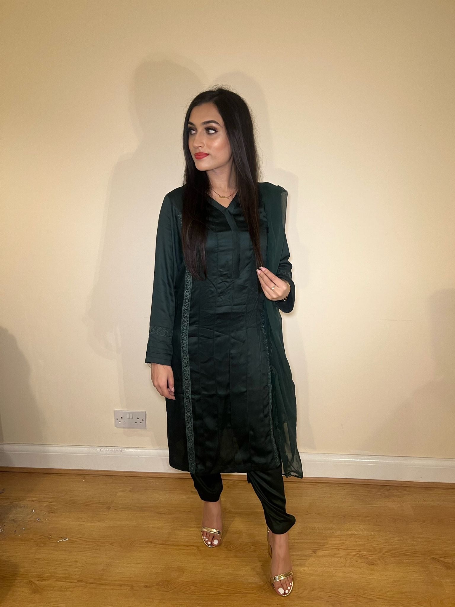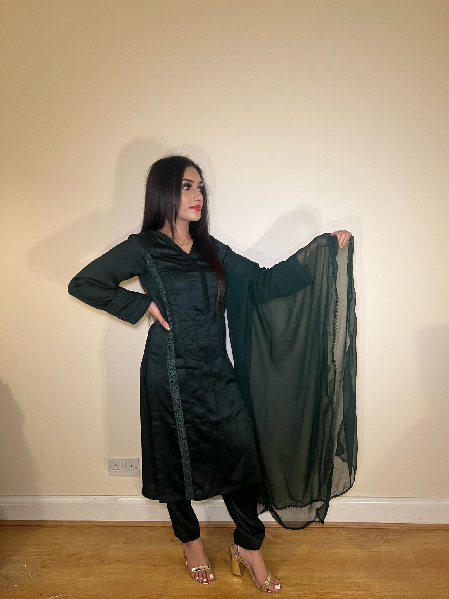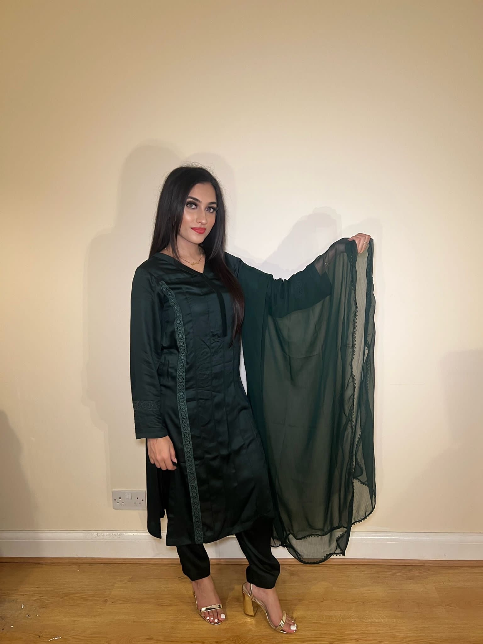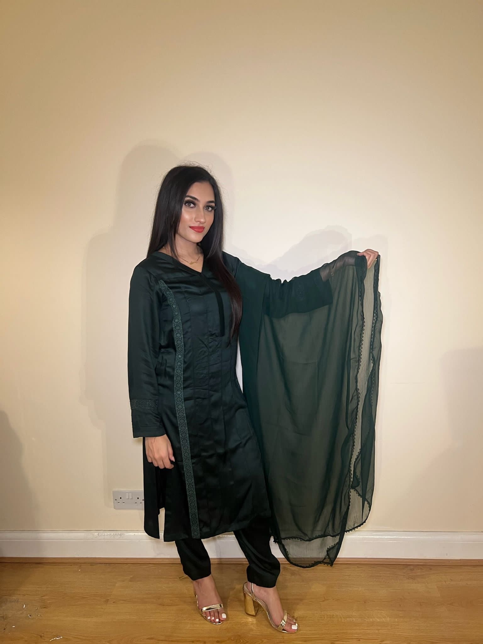 Ready to wear, winter fabric marina with thread embroidery on kameez, comes with chiffon dupatta and matching bottoms.
