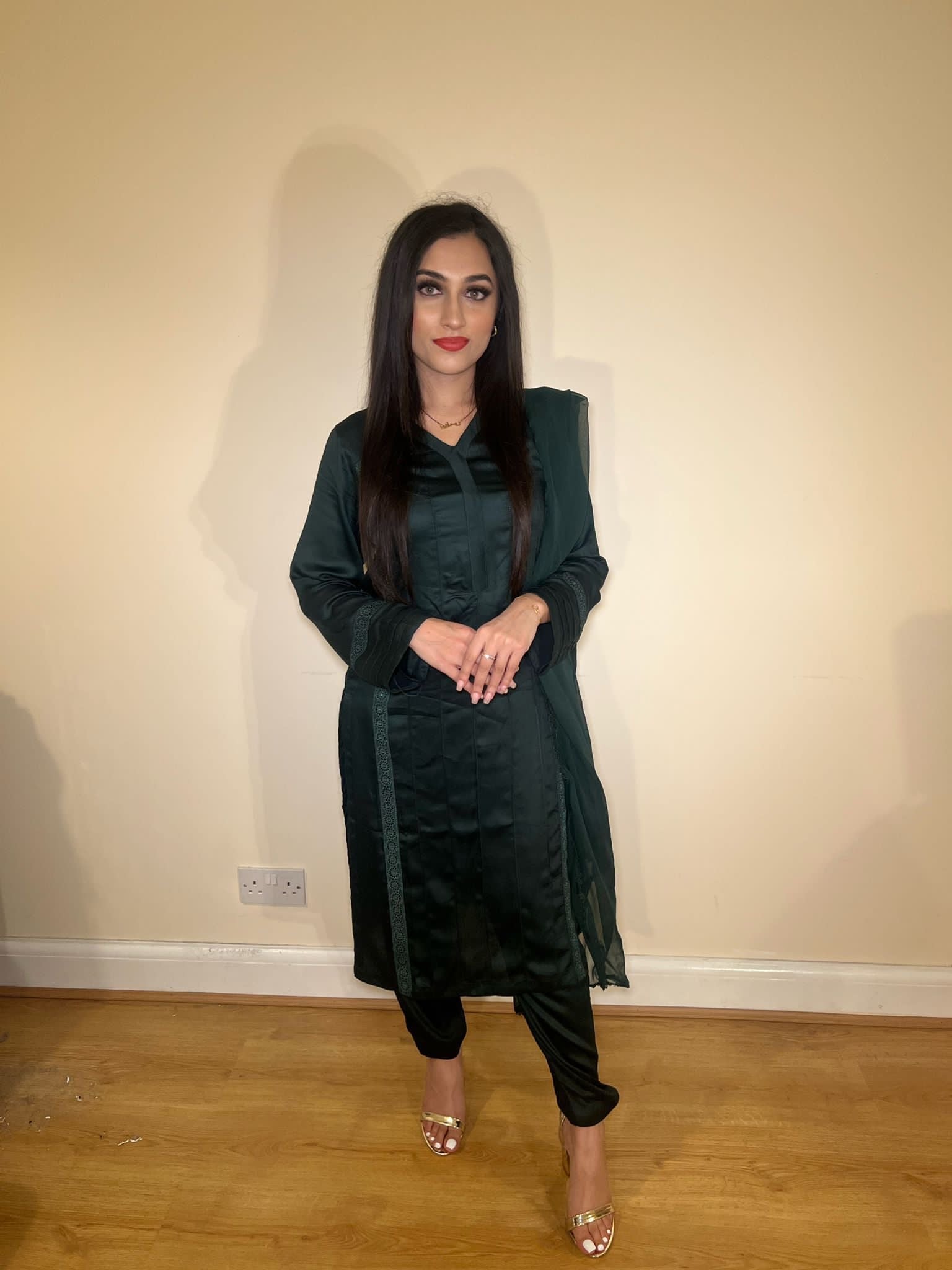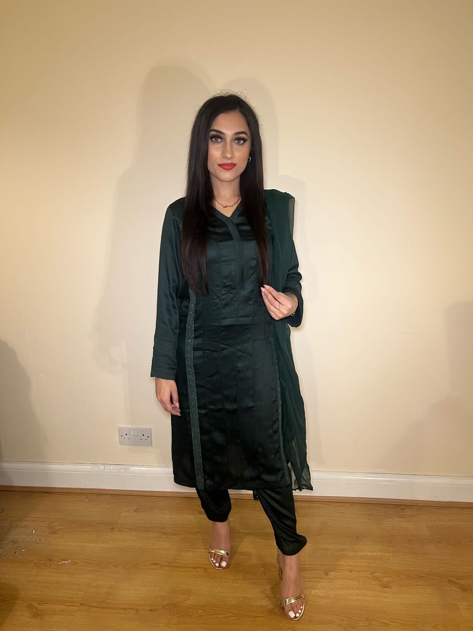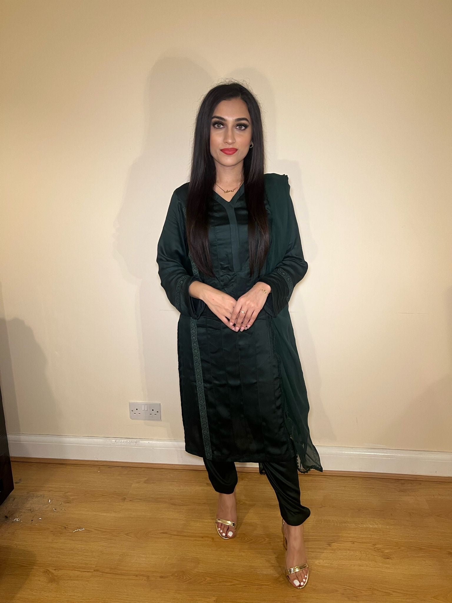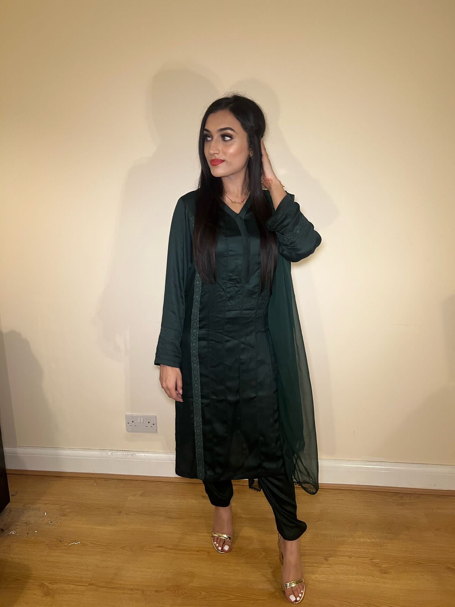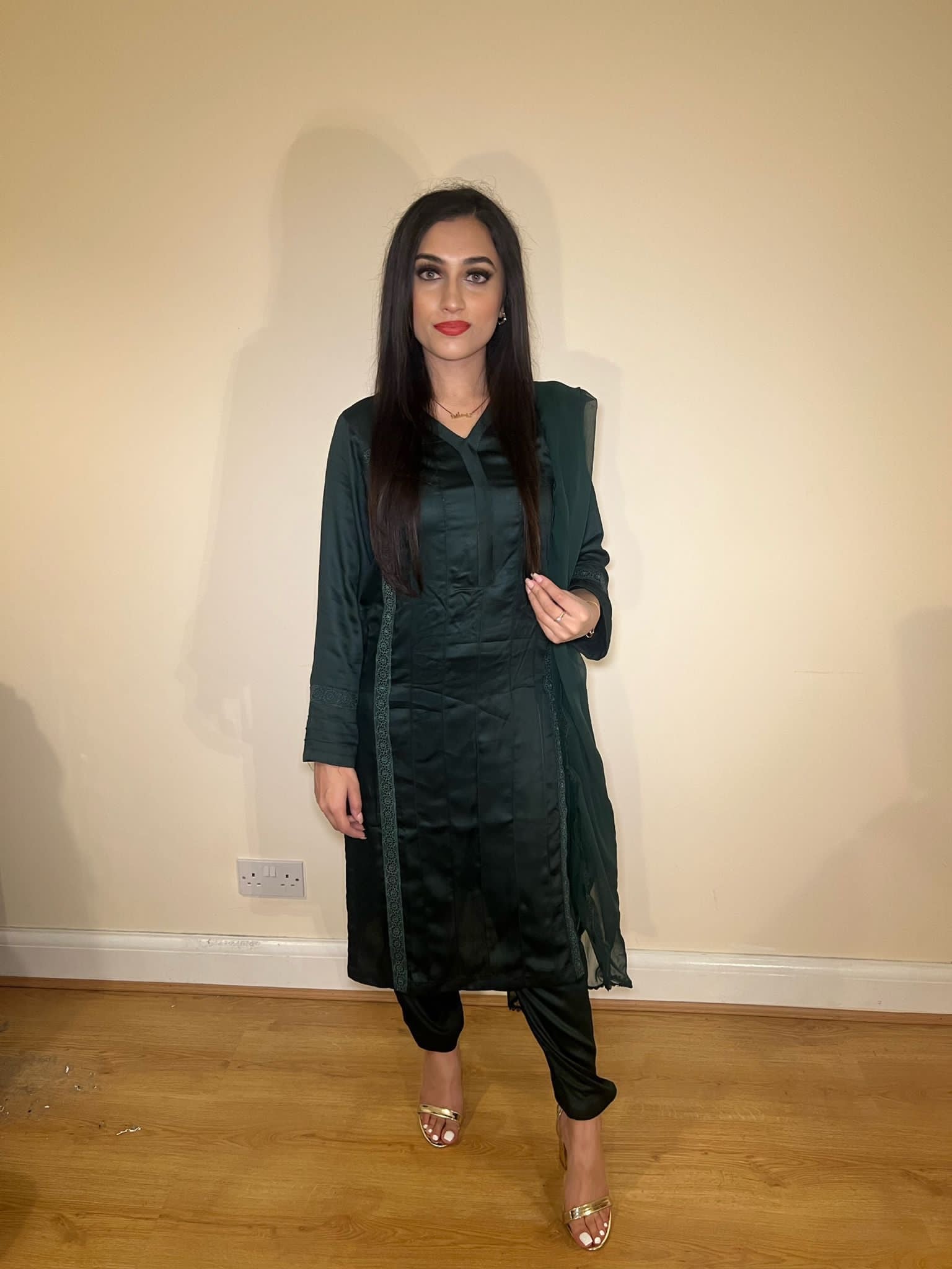 Ready to wear, winter fabric marina with thread embroidery on kameez, comes with chiffon dupatta and matching bottoms.