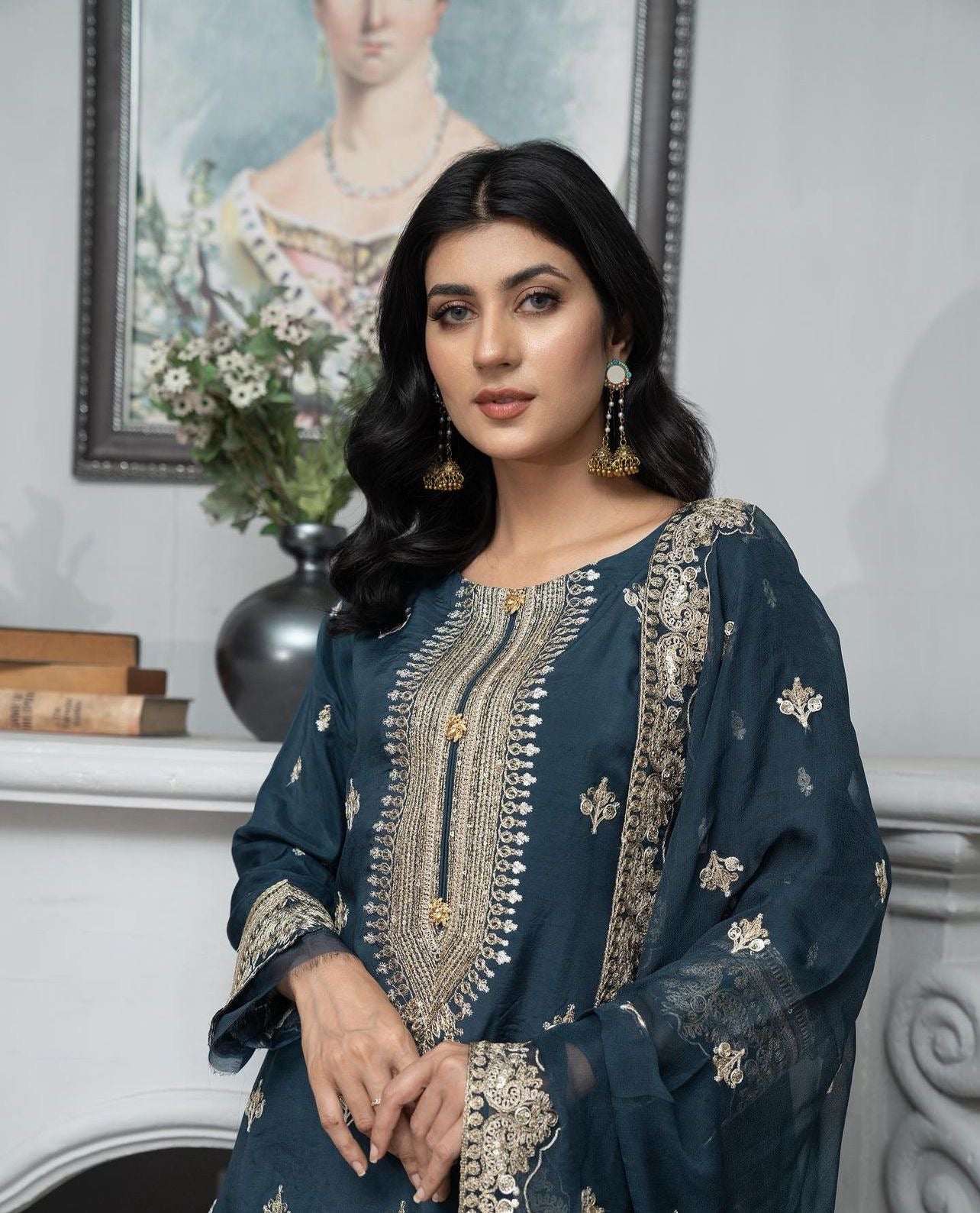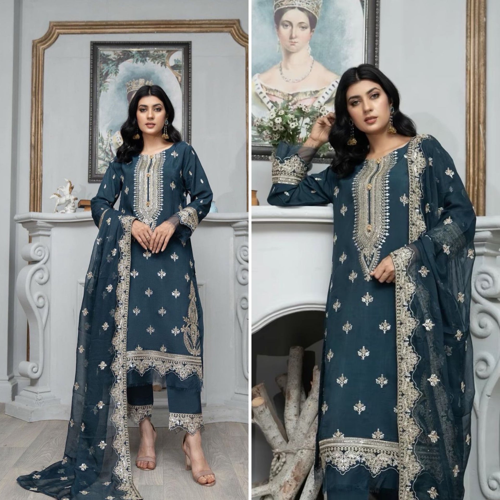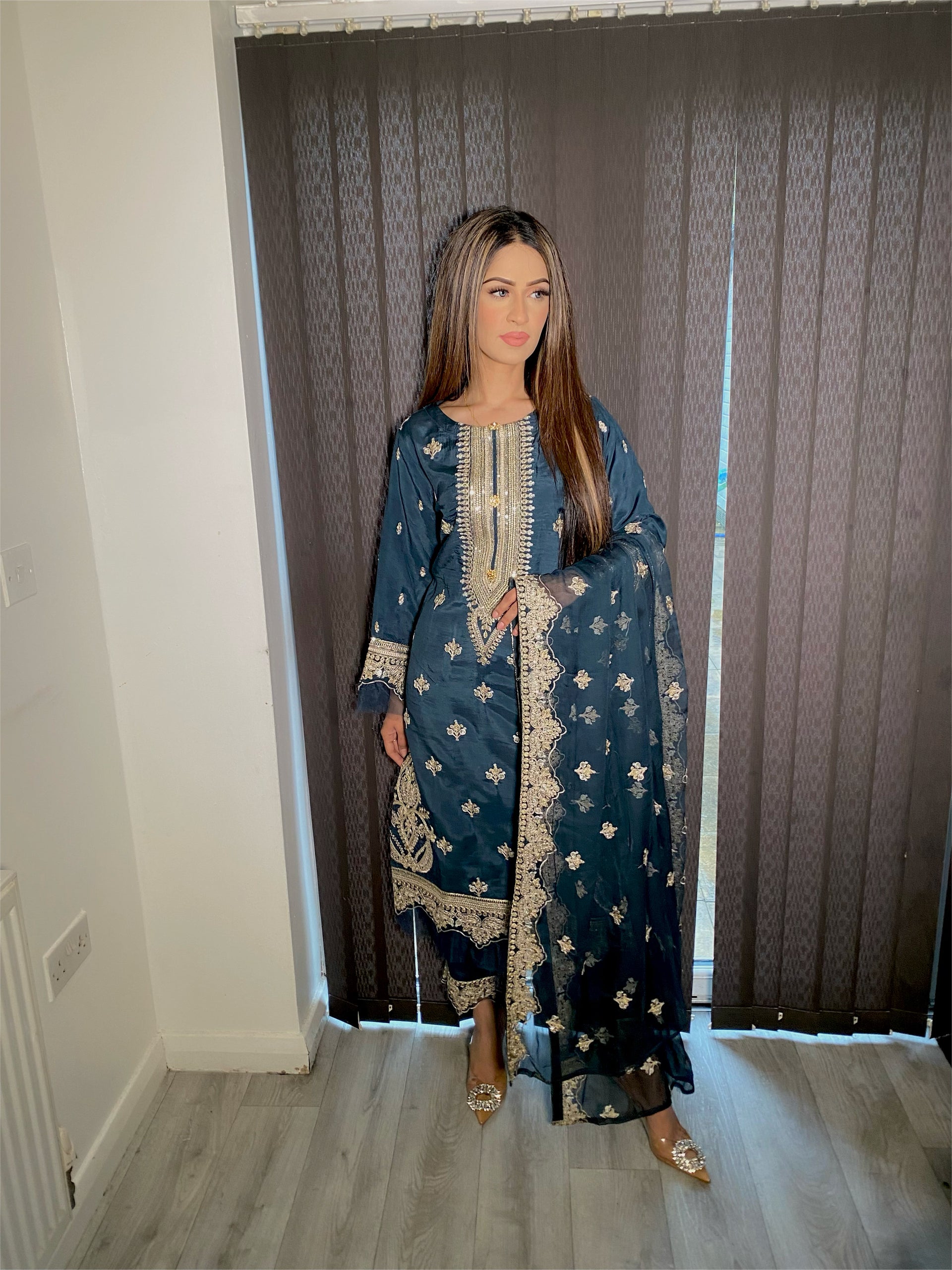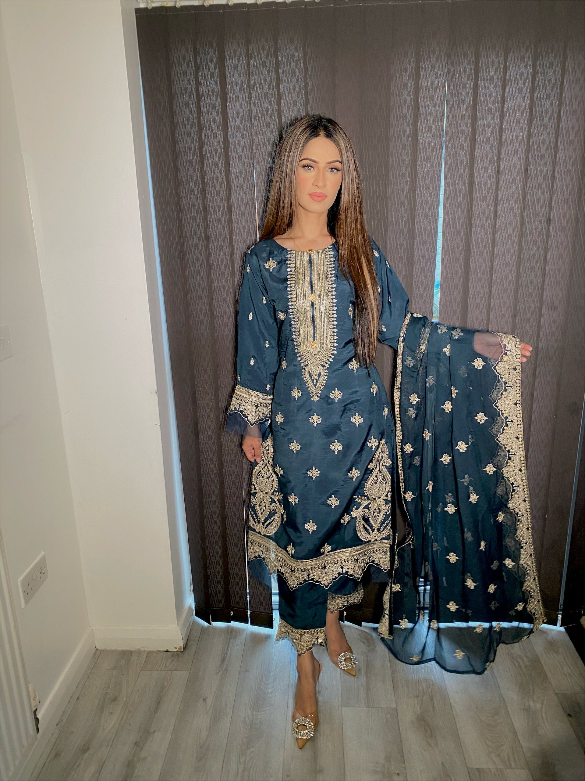 Elevate your style with our exquisite blue embroidered suit featuring intricate gold embroidery and delicate hand work. This stunning piece is part of Maryam & Mariya’s Viscos Semi Formal Collection, complete with a pure chiffon scarf also beautifully embroidered. Priced at just £44.99, this suit is a must-have for any special occasion.