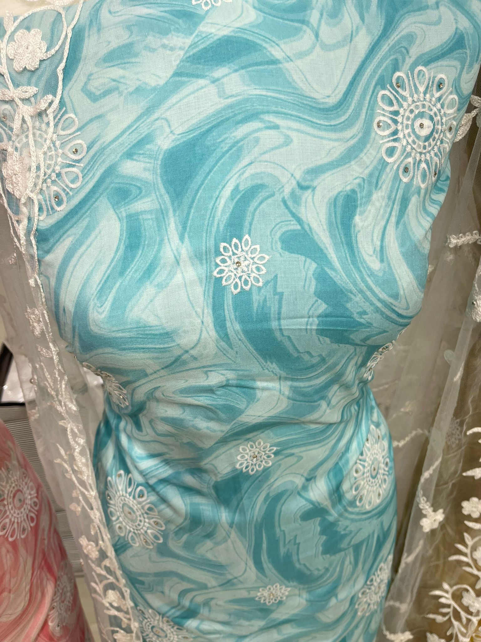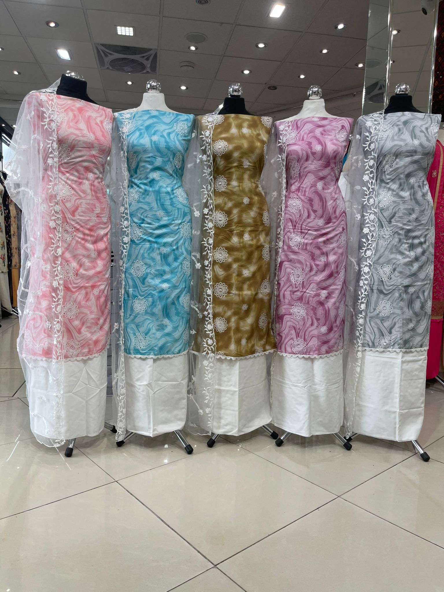 Summer cottons, embroidered cotton kameez with lace on border, comes with contrasting bottoms and embroidered net dupatta.