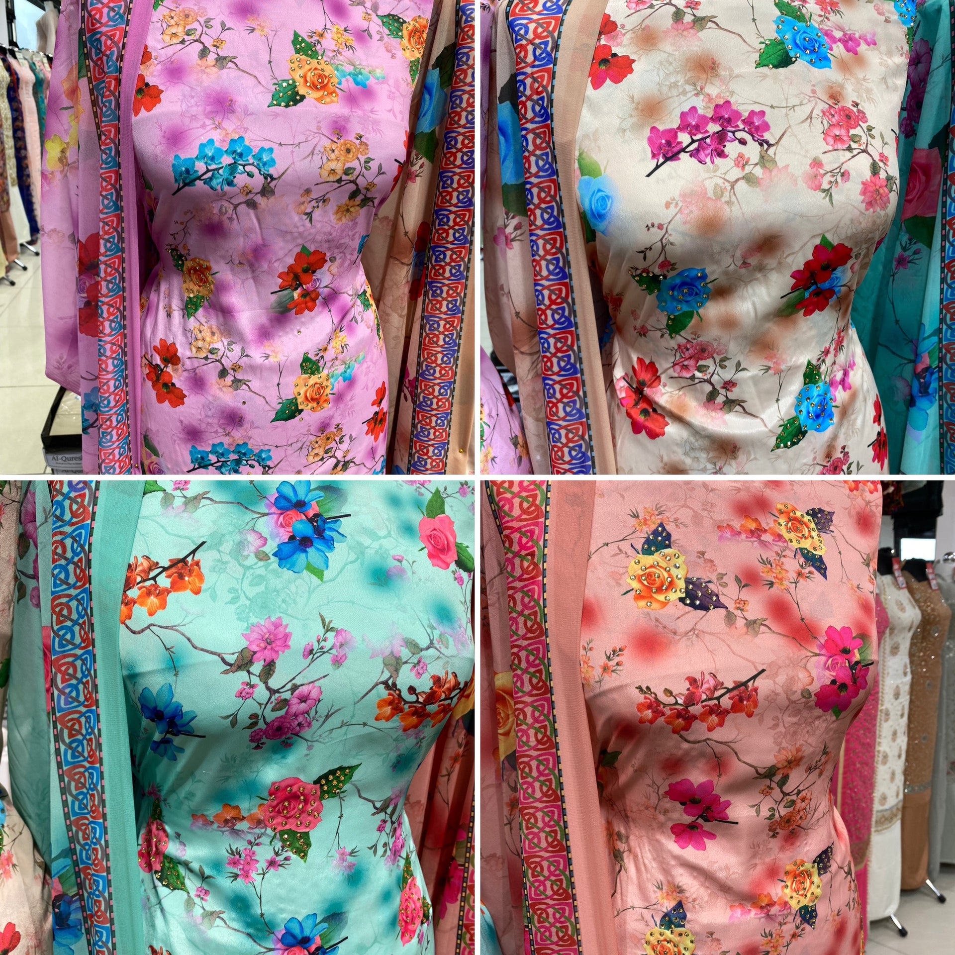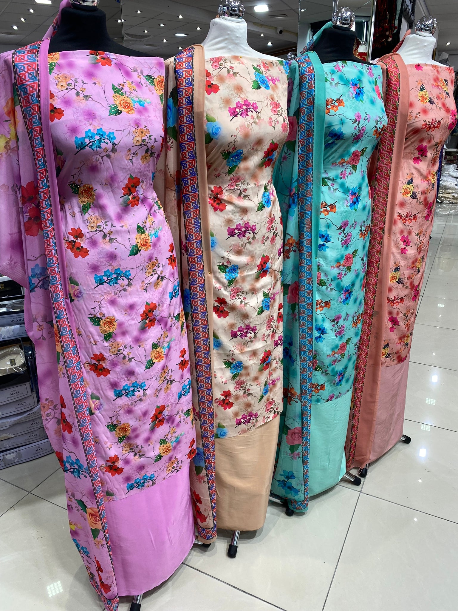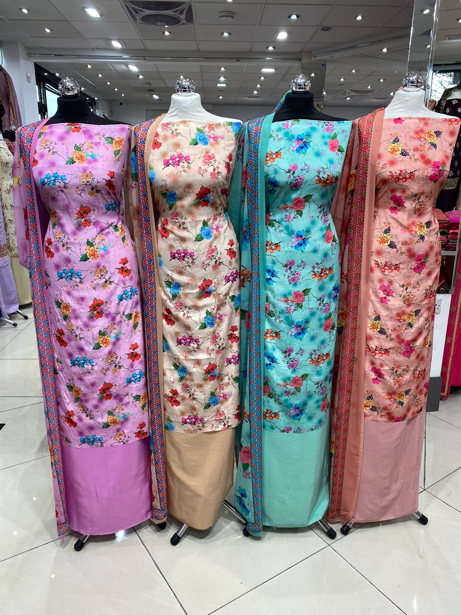 Casual French crepe prints, with matching bottoms and printed crepe dupatta. A long-lasting wash and wear fabric, ideal gift suits.