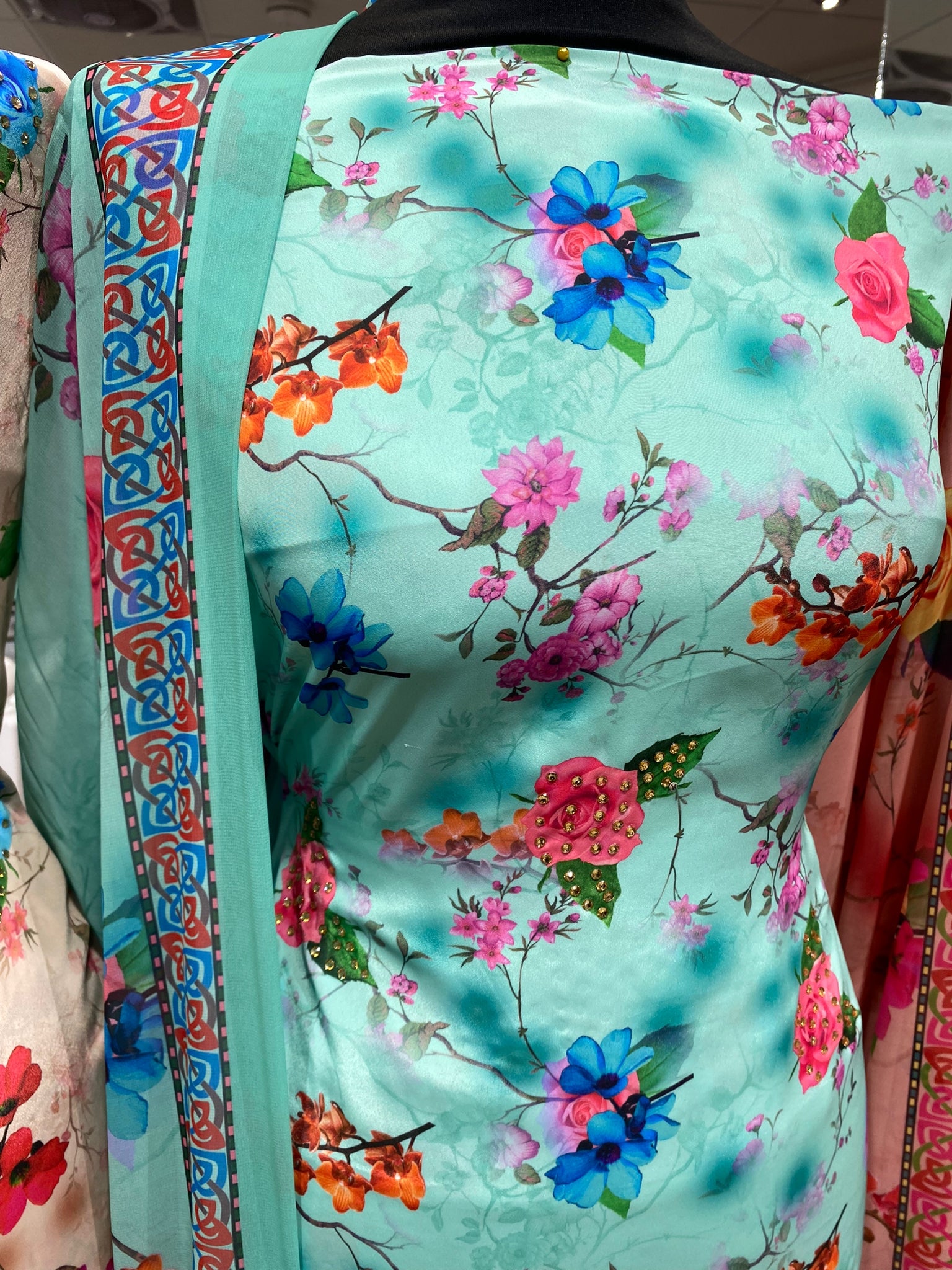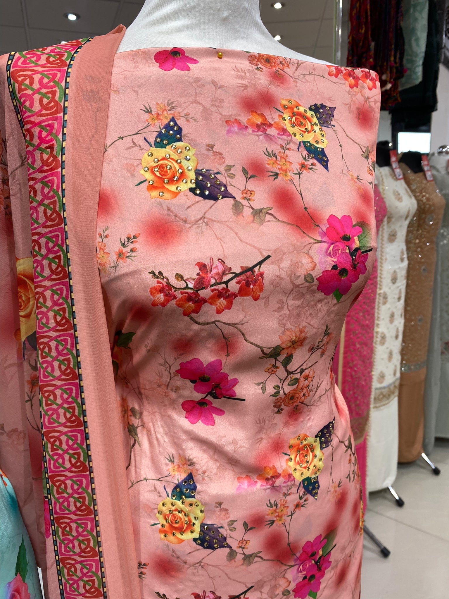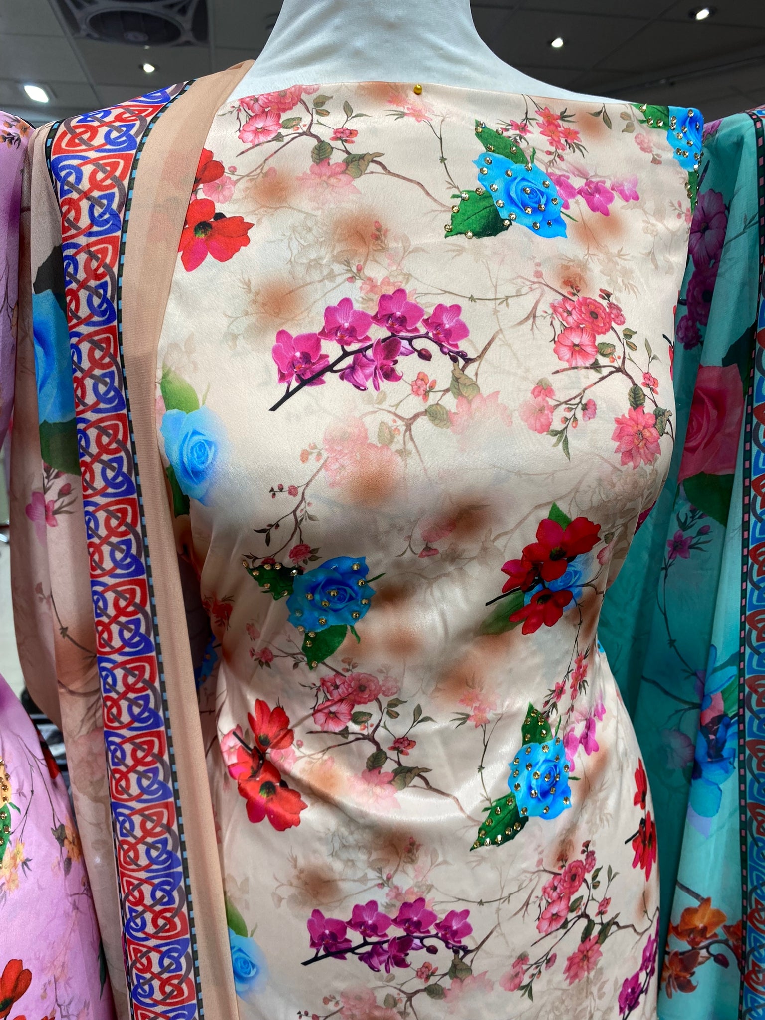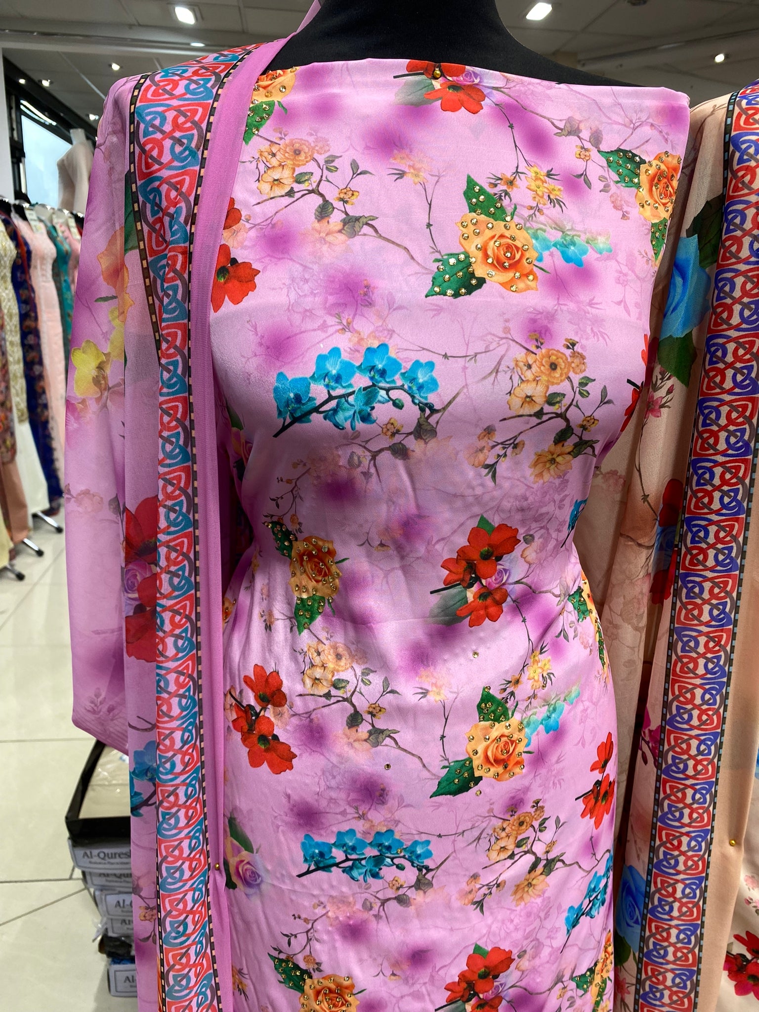 Casual French crepe prints, with matching bottoms and printed crepe dupatta. A long-lasting wash and wear fabric, ideal gift suits.