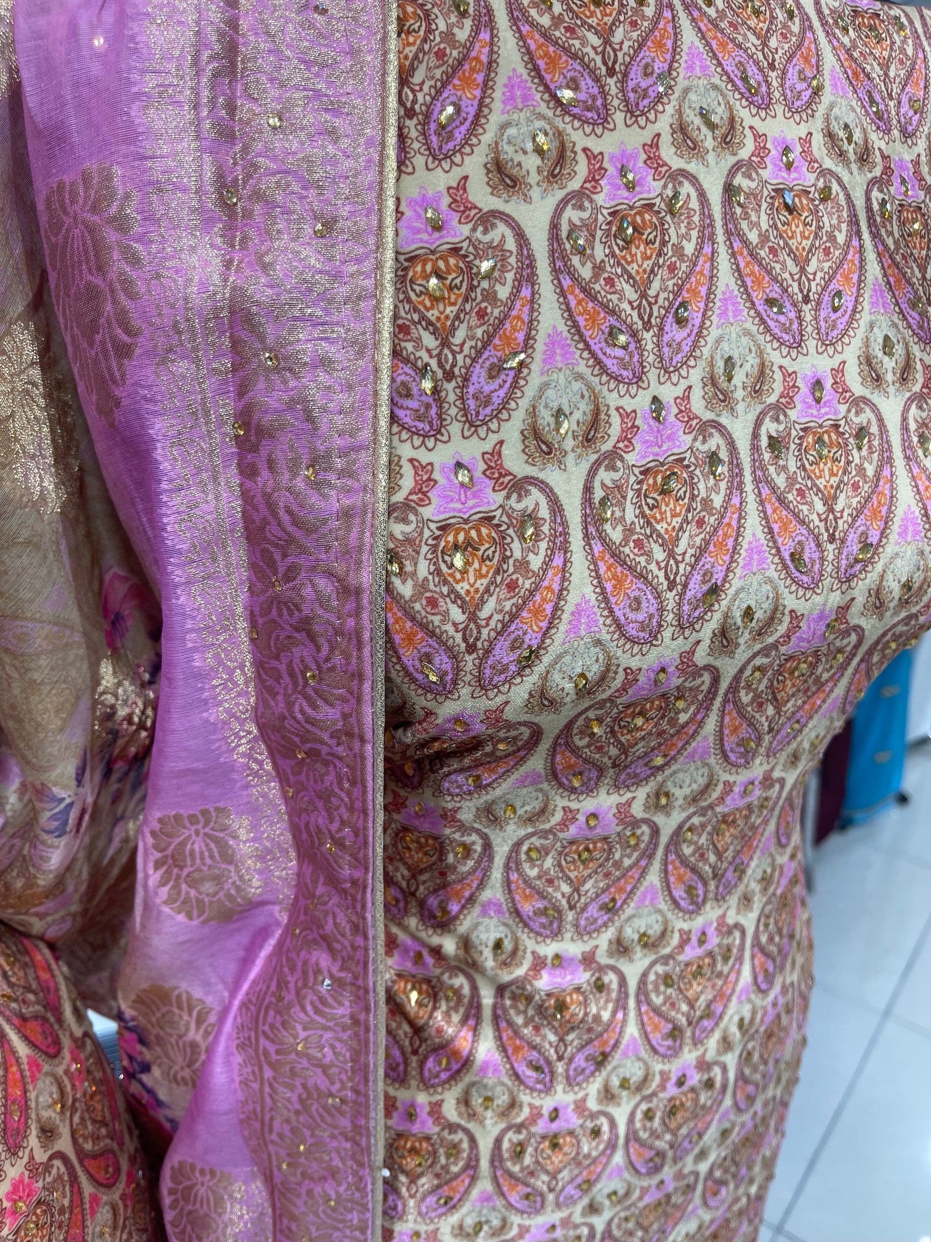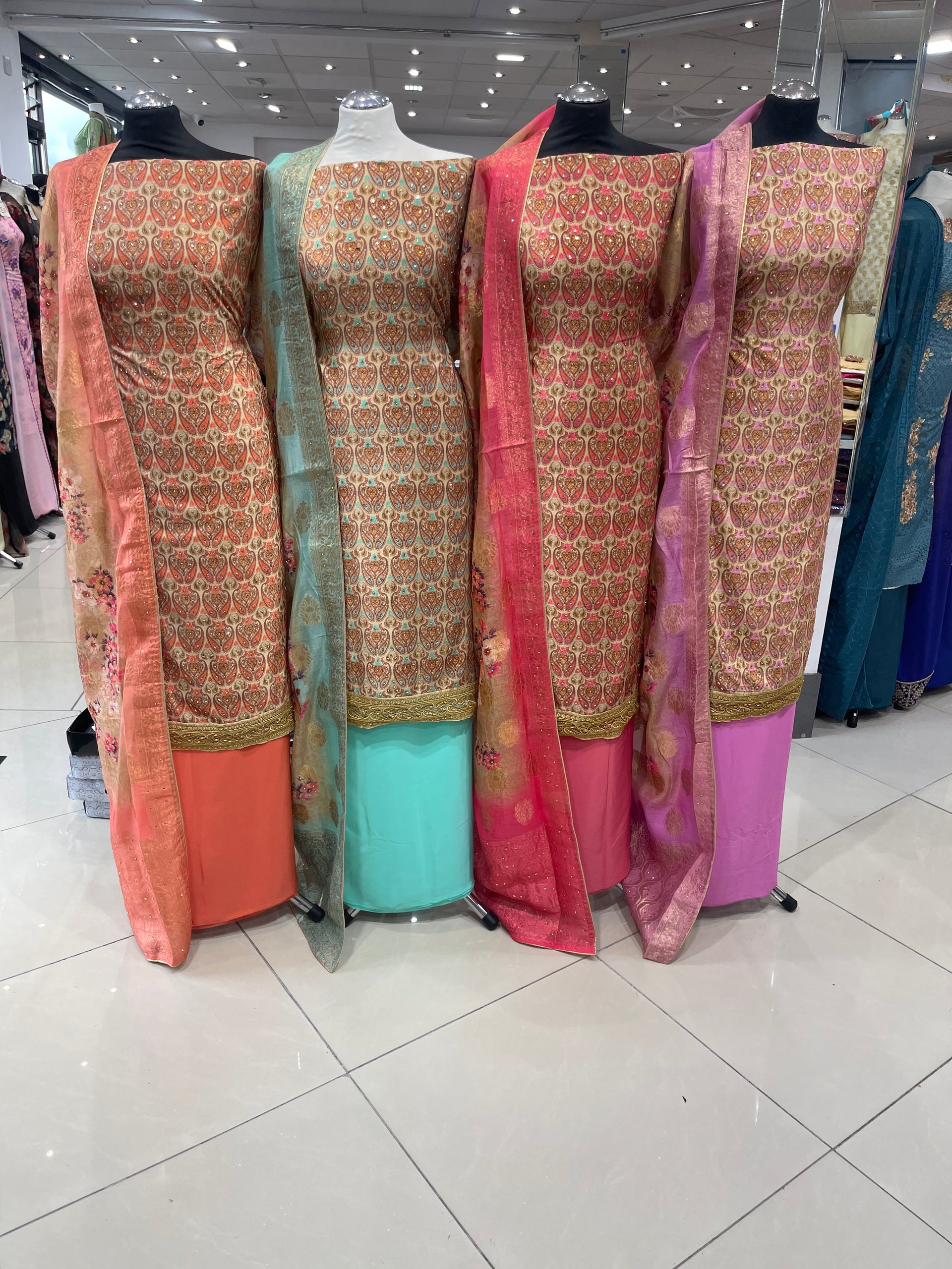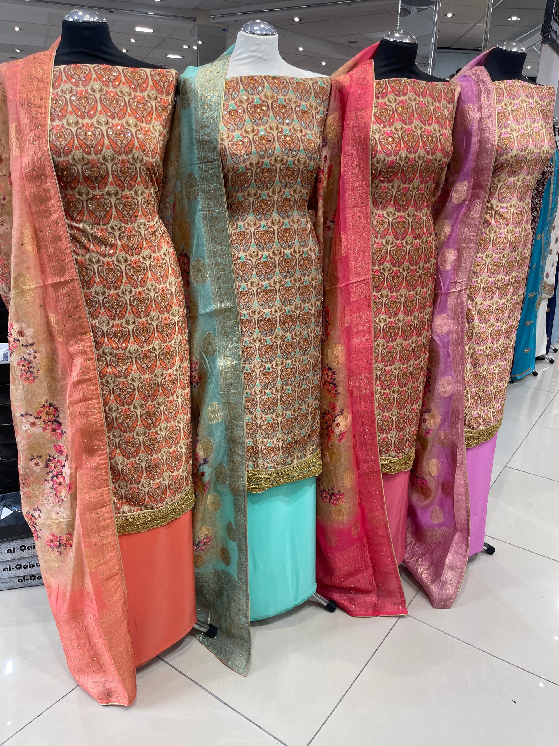 Beautifully crafted micro velvet suits with diamonte embellishments and gold zari thread embroidery detail to border. Accompanied with a digital print banarsi dupatta and contrast matching bottoms. The perfect festive wear this seaosn.