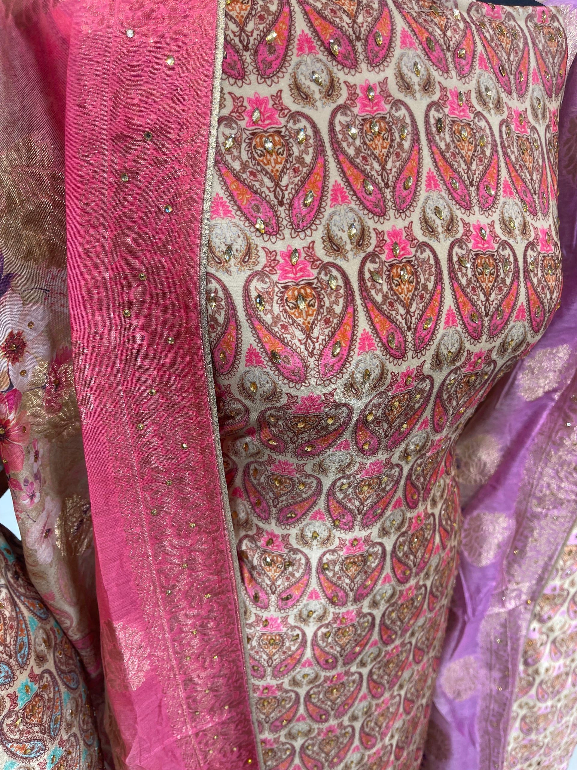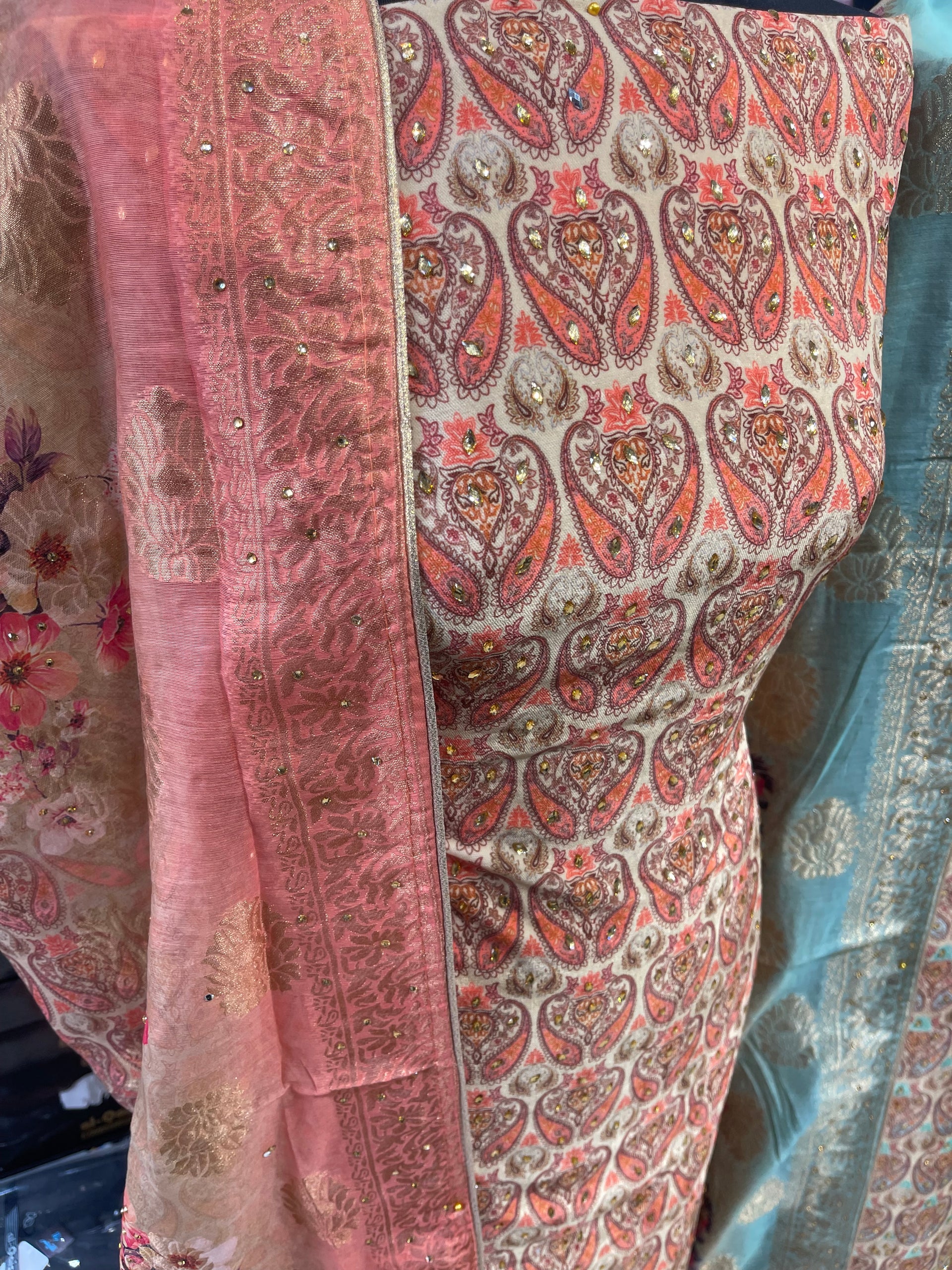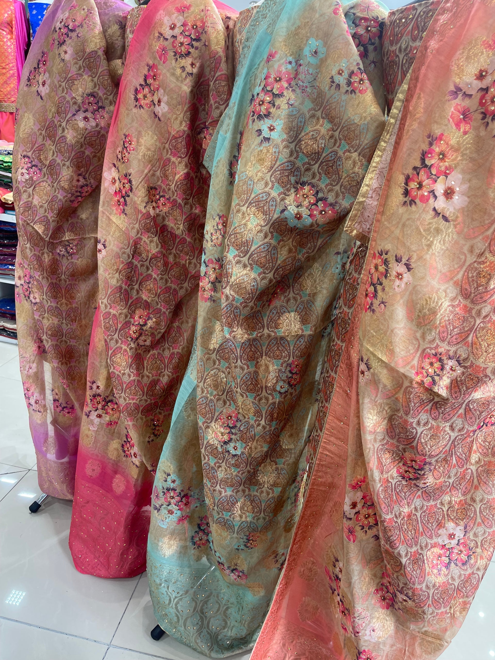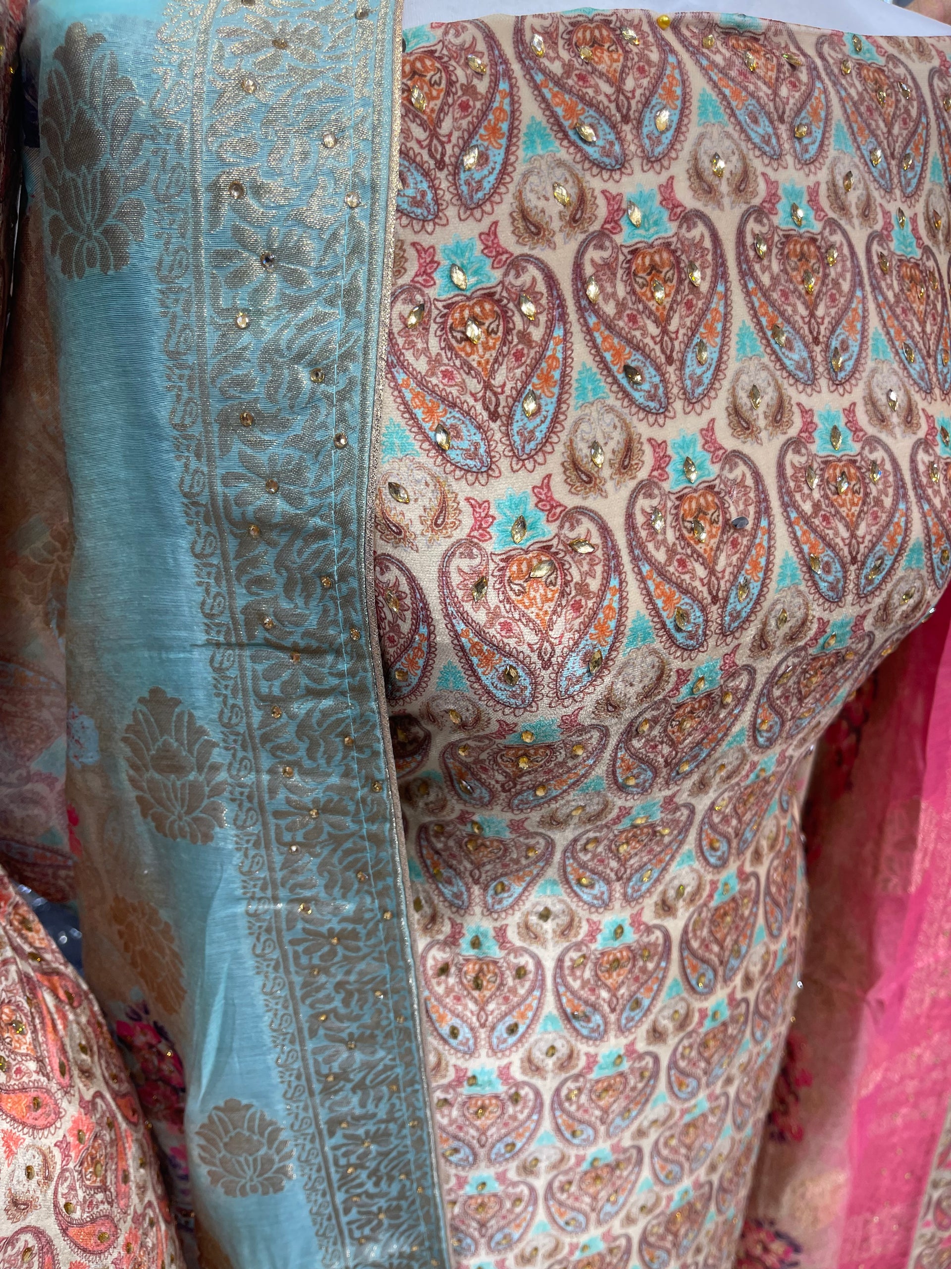 Beautifully crafted micro velvet suits with diamonte embellishments and gold zari thread embroidery detail to border. Accompanied with a digital print banarsi dupatta and contrast matching bottoms. The perfect festive wear this seaosn.