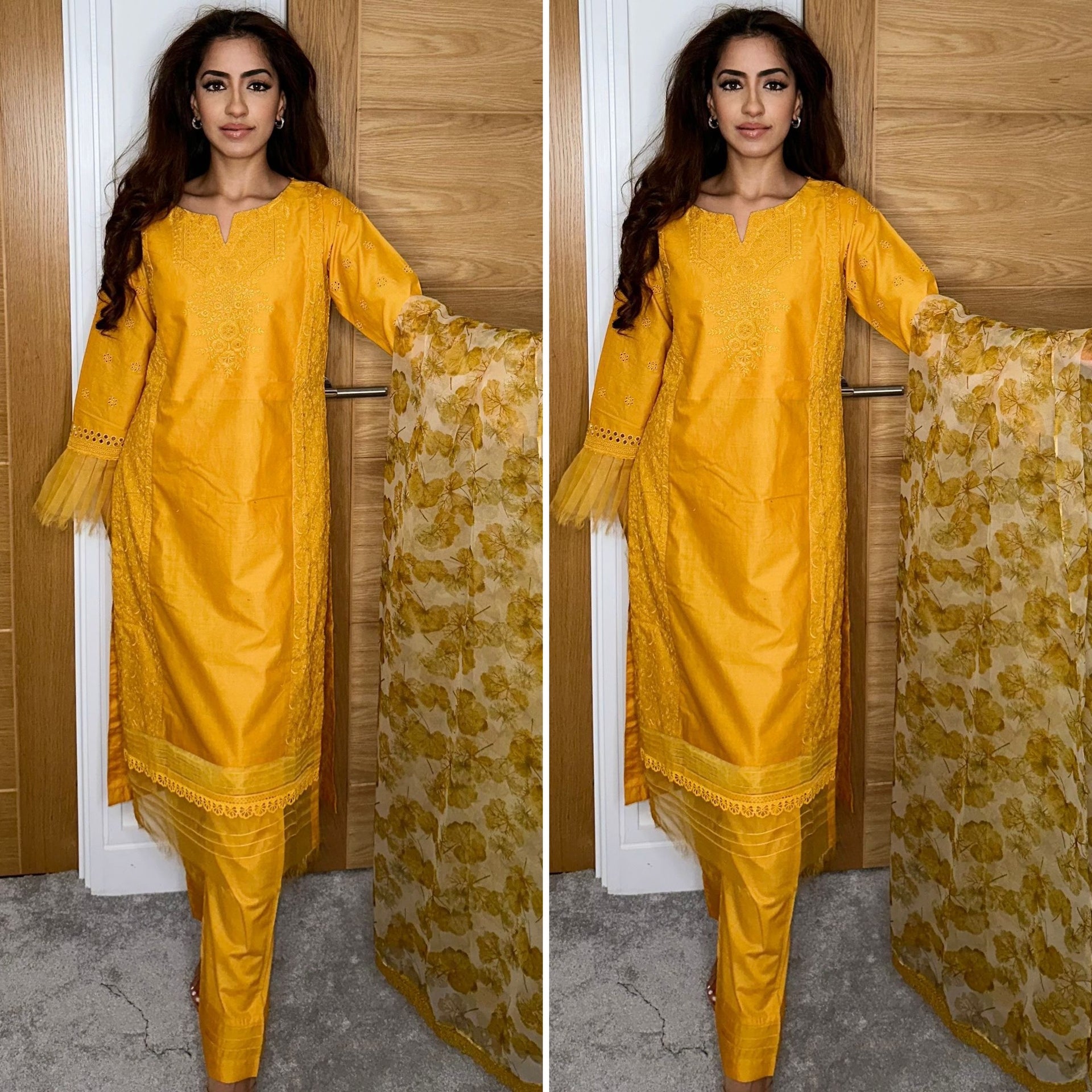 Ready to wear, Chikankari Cotton Pret, embellished suit with thread embroidery, comes with beautiful digital print organza dupatta. Available in sizes small to xxl.
