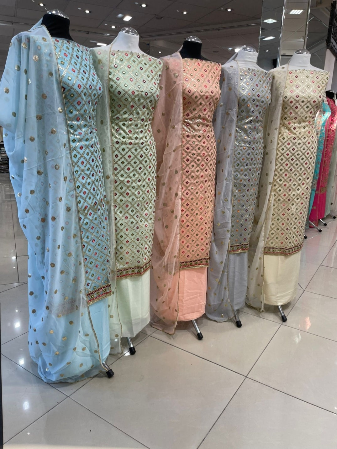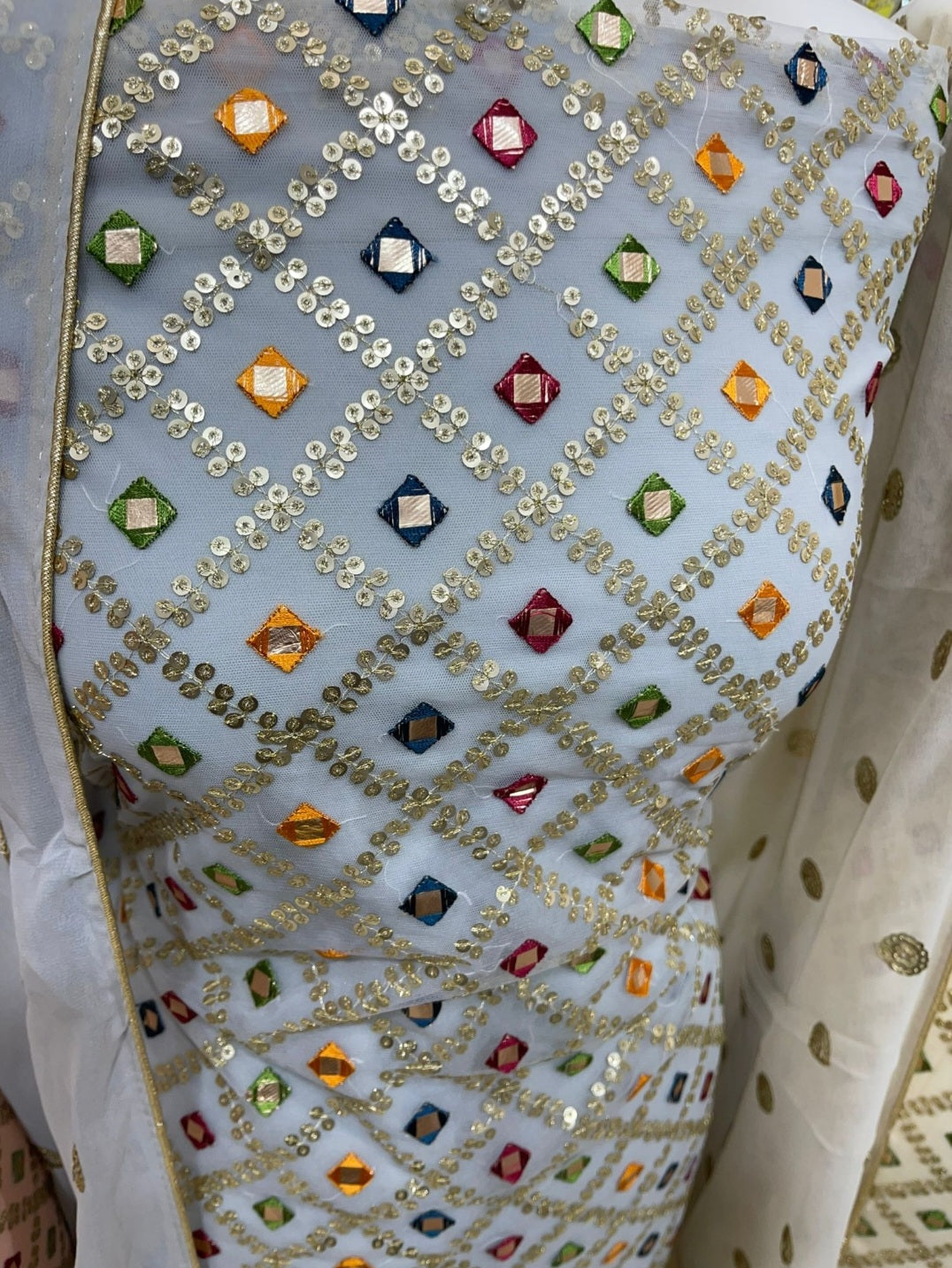 Beautifully embellished soft net fabric with foil mirror work and sequins. Sequin embroidery work and gold border on dupatta. A lovely combination of subtle colours to give an elegant and graceful look.