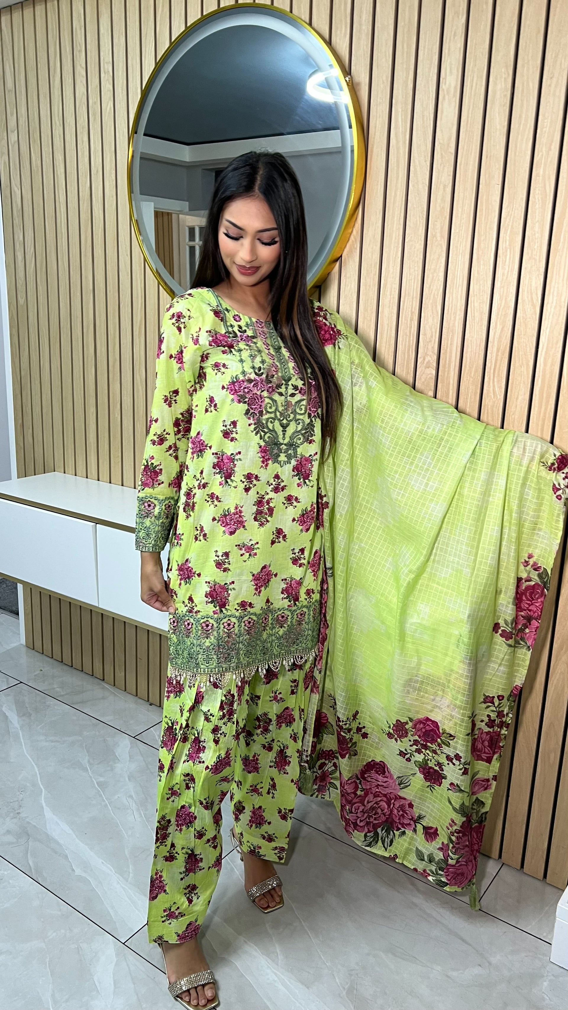 Discover the elegance of the Farashy Shalwar, an Iznik inspired Summer/Spring Lawn suit that beautifully marries tradition with contemporary flair. This stunning ensemble features intricate lace work embroidery and a vibrant Neon Green Floral digital print, making it a standout choice for any occasion. Crafted from breathable fabric, it offers exceptional comfort while the flattering cut enhances your silhouette, ensuring you look your best at both formal events and casual gatherings. Elevate your wardrobe with this exquisite suit that is sure to turn heads and leave a lasting impression.