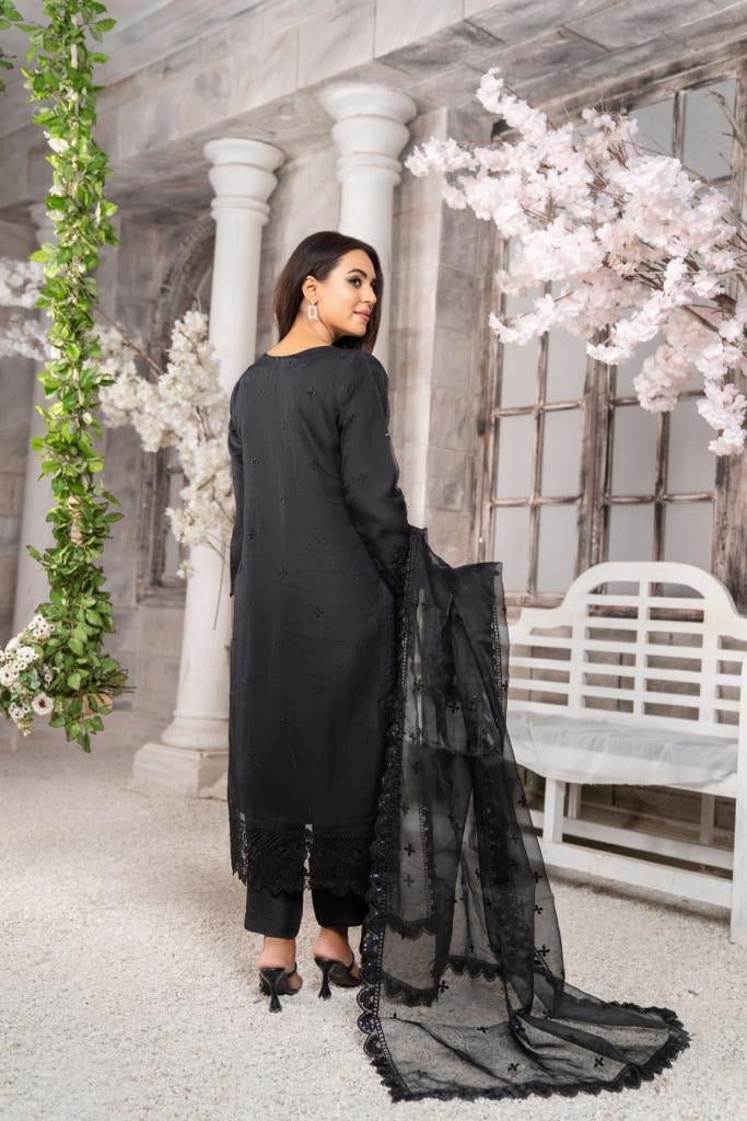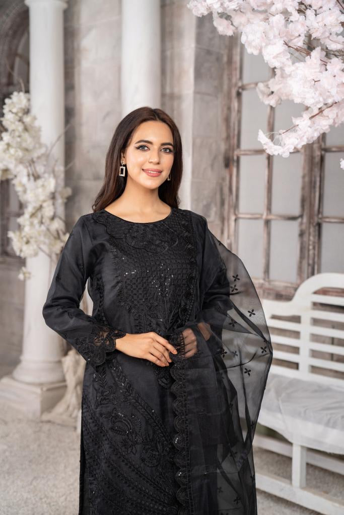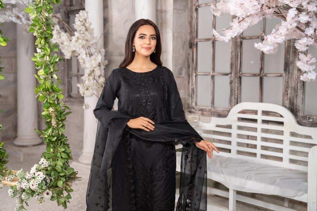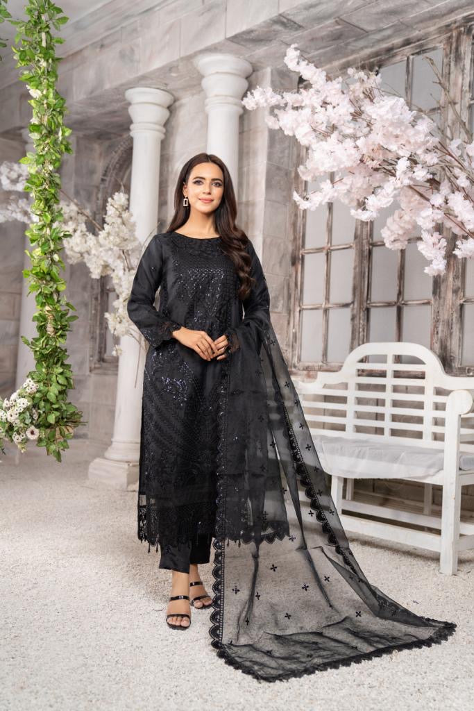 Ready to wear, formal attire. Rich embellished sequin embroidery, contrast intricate thread embroidery on kameez and dupatta. Designs available with trousers and sharara bottoms.