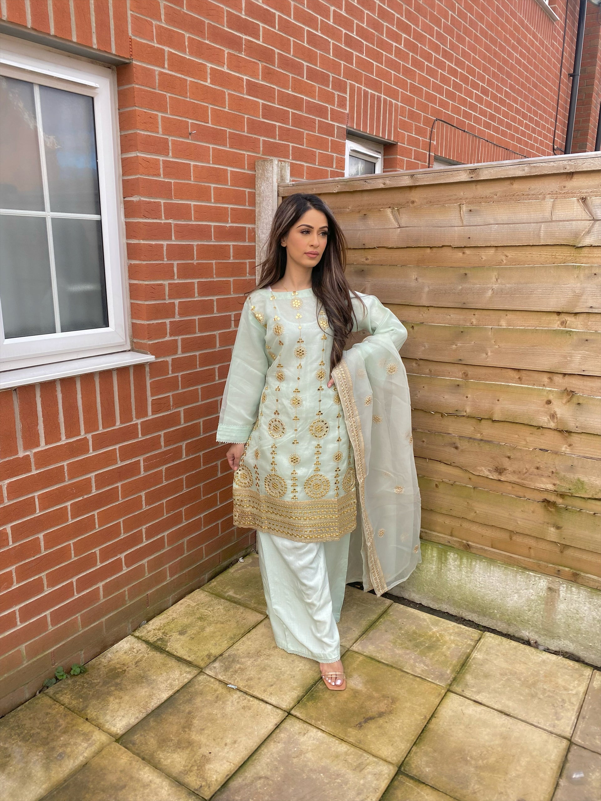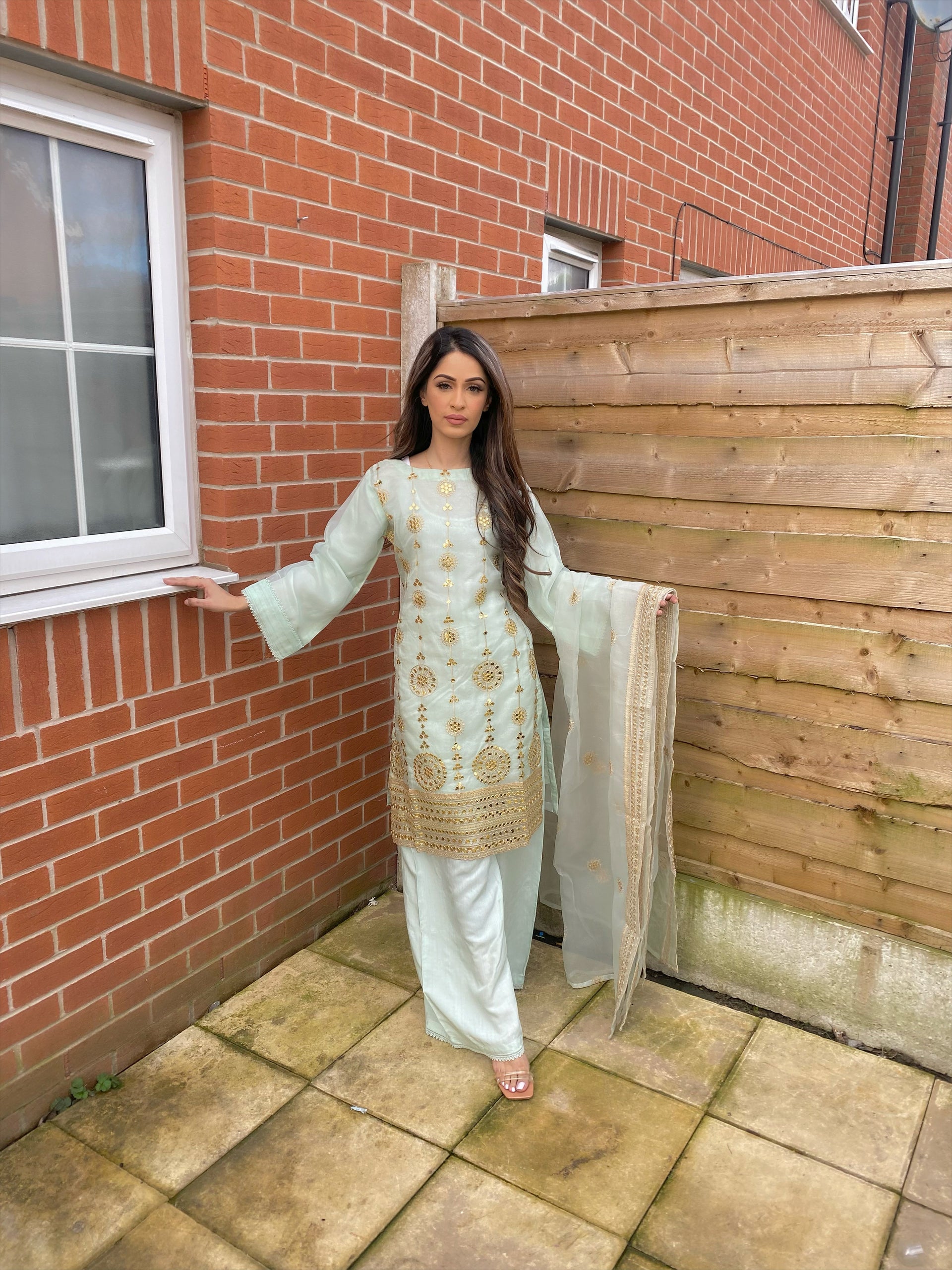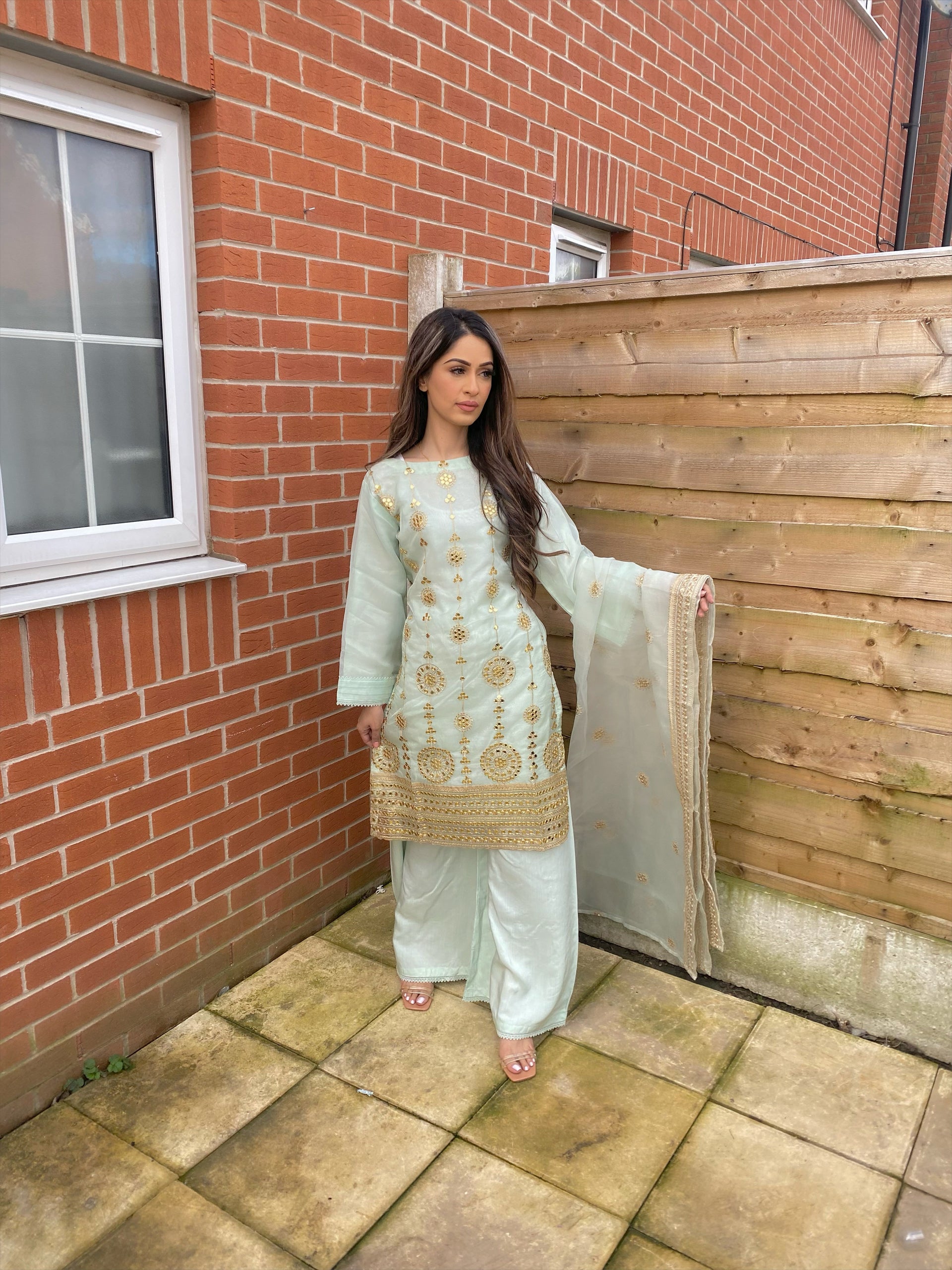 Ready to wear, elegantly embroidered pure chiffon with sequin and button embellishments. Accompanied with intricately embroidered chiffon and organza dupattas. Ideal festive seasonal wear. Available in sizes small to extra large.